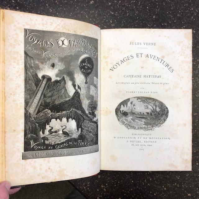 Paris: ; J. Hetzel et Cie. Bibliotheque d'Education et de Recreation, 1867. Hardcover. 4to., 467pp., 220pp.; VG-; 1/4 bound, red leather spine with gilt lettering, marbled boards, endpapers; rebound; mild shelfwear, primarily to board edges and corners; two volumes bound together, pagination not continuous; moderate foxing throughout; Voyage au centre de la Terre has a separate half-title and title page; Voyages et aventures du capitaine Hatteras has the frontispiece; text in French; shelved in Rm. G. 1277116. Special Collections.