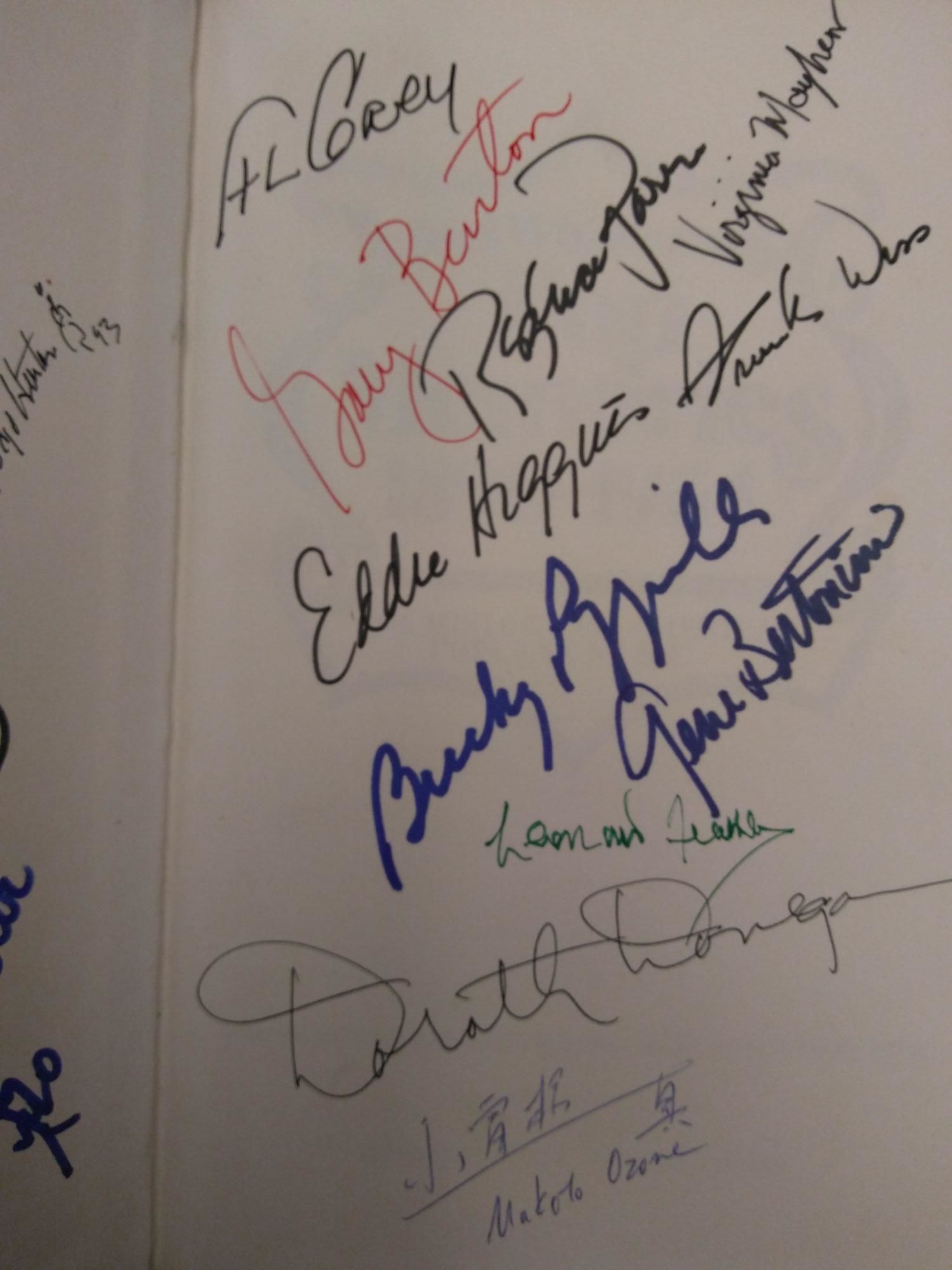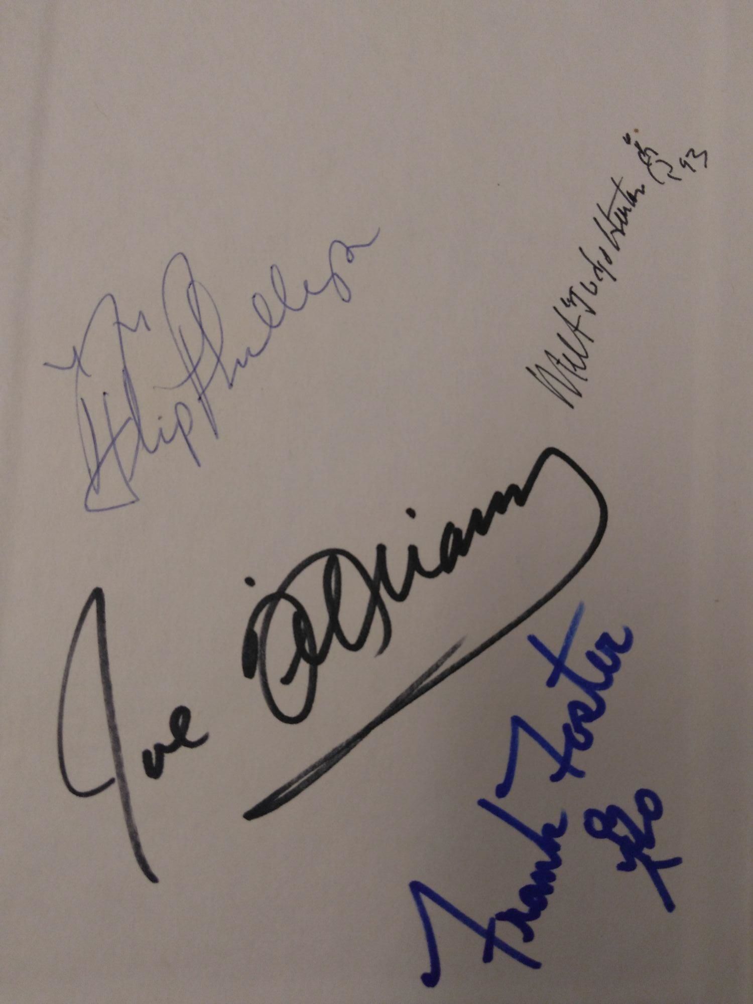 Menomonee Falls, WI: Record Research, 1986. First Edition. Hardcover. tall 8vo., 657 pp., [3 pp.], VG-; dark brown faux-leather cloth boards, gold lettering; overall mild scuffing to boards, bumping to middle of spine, rounding to head and tail; rounding to head of fore-edge, mild wear/scattered staining to text-block, aged-paste residue to top and bottom at headband; boards slightly cocked, front board somewhat shaken, back board tight, slight shelf lean yet stands alone, binding strong; interior clean, creasing to bottom corners of pp. 583-586 visible to text-block; SIGNED by 15 well-known persons in the jazz industry; LIST OF SIGNATURES: [1] Flip Phillips (1915-2001): American jazz tenor saxophone and clarinet player; [2] Joe Williams (1918-1999): American jazz singer; [3] Milt Hinton (1910-2000): American double bassist and photographer; [4] Frank Foster (1928-2011): American tenor and soprano saxophonist, flutist, arranger, and composer; [5] Al Grey (1925-2000): American jazz trombonist; [6] Gary Burton (b. 1943): living American jazz vibraphonist, composer, and educator known for his plunger mute technique and his book on the subject; [7] Rebecca Parris (b. 1951), living American jazz singer; [8] Virginia Mayhew (b. 1959): living American saxophonist, composer, and bandleader based in New York; [9] Eddie Higgins (1932-2009): American jazz pianist, composer, and orchestrator; [10] Frank Wess (1922-2013): American jazz saxophonist and flutist; [11] Bucky Pizzarelli (b. 1926): living American jazz guitarist; [12] Gene Bertoncini (b. 1937): living American jazz guitarist; [13] Leonard Feather (1914-1994): British jazz pianist, composer, and producer best known as a writer and music journalist; [14] Dorothy Donegan (1914-1922): American jazz pianist; [15] Makoto Ozone (b. 1961): Japanese jazz pianist; shelved case 12. 1291088. Shelved Dupont Bookstore.
