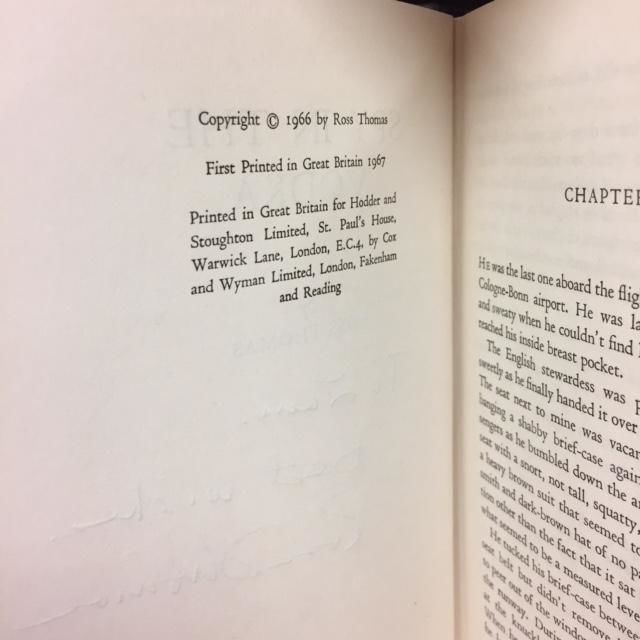 London: Hodder & Stoughton, 1967. First British Edition. Hardcover. Octavo, 256 pages; VG/G+; spine black with gray stripe, yellow and red lettering; dust jacket protected with a mylar covering, price uncut '21s net'; front flap has a crease, closed tear to front upper corner, closed tear to front middle lower edge, mild chipping to all edges, head and tail of spine; small piece of paper adhered to the ffep, possibly from removal of a bookplate; INSCRIBED by Ross Thomas twice, once on the title page and once on the front pastedown; previously published in the US as The Cold War Swap in 1966; LP consignment; shelved in Room G. 1290084. Special Collections.