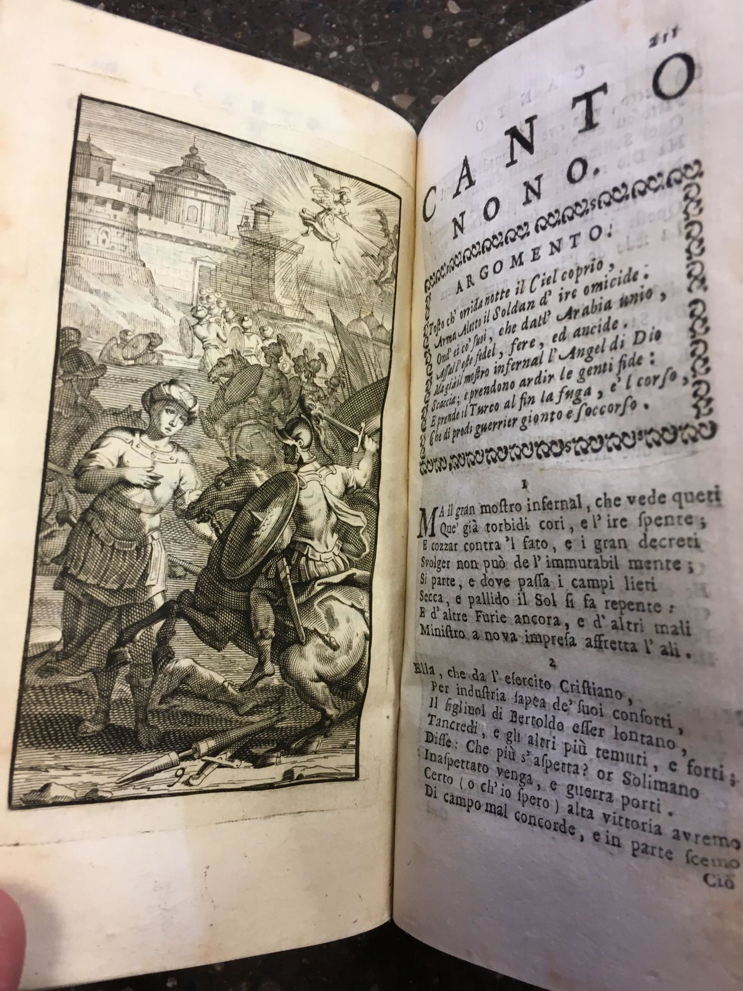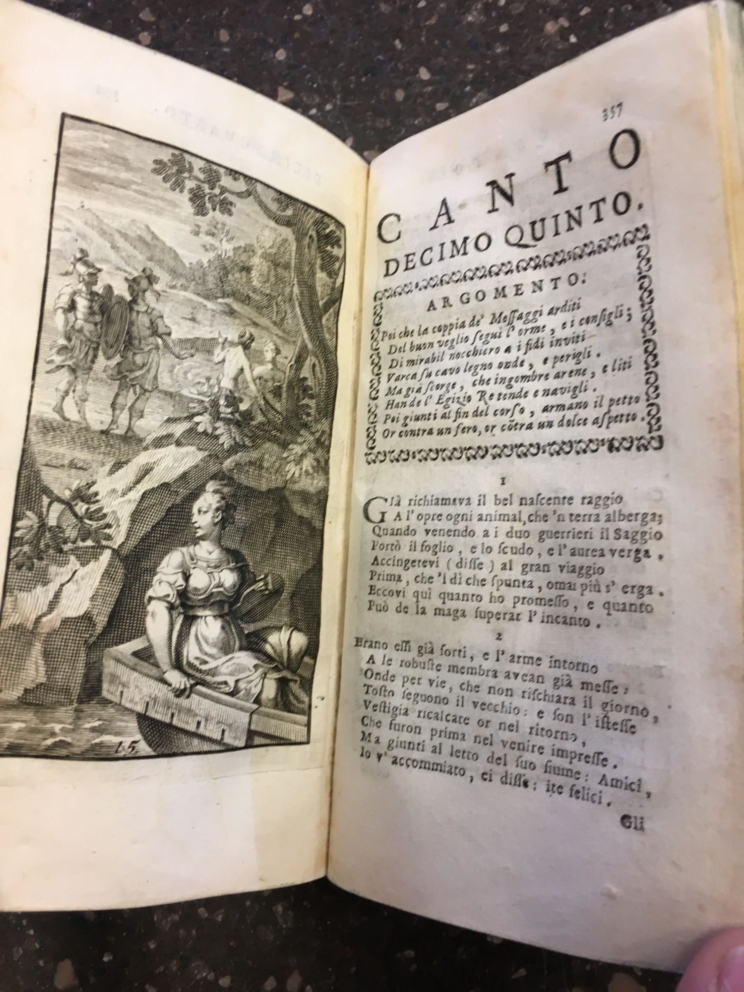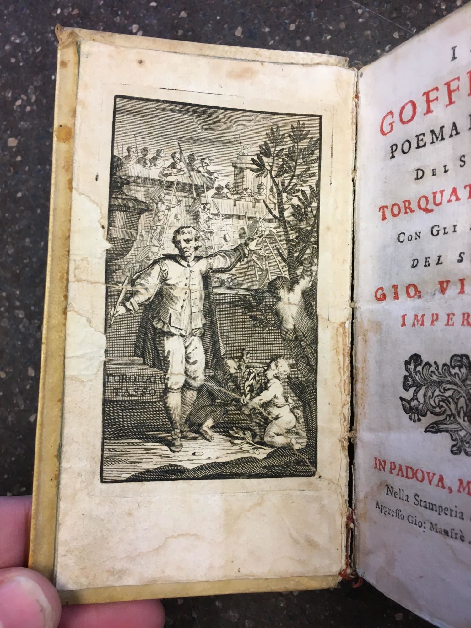 In Padova: Nella Stamperia del Seminario, Appresso Gio. Manfrè, 1728. Hardcover. 12mo., 550 pages; VG; bound in full contemporary vellum, plain spine; text block dyed blue; mild wear to extremities; with twenty full-page black and white copper engravings to the start of each of the twenty Cantos, plus a frontispiece; Frontispiece with mild archival repair, Canto Quarto plate with small hole to the middle; shelved case 3. 1331573. Shelved Dupont Bookstore.