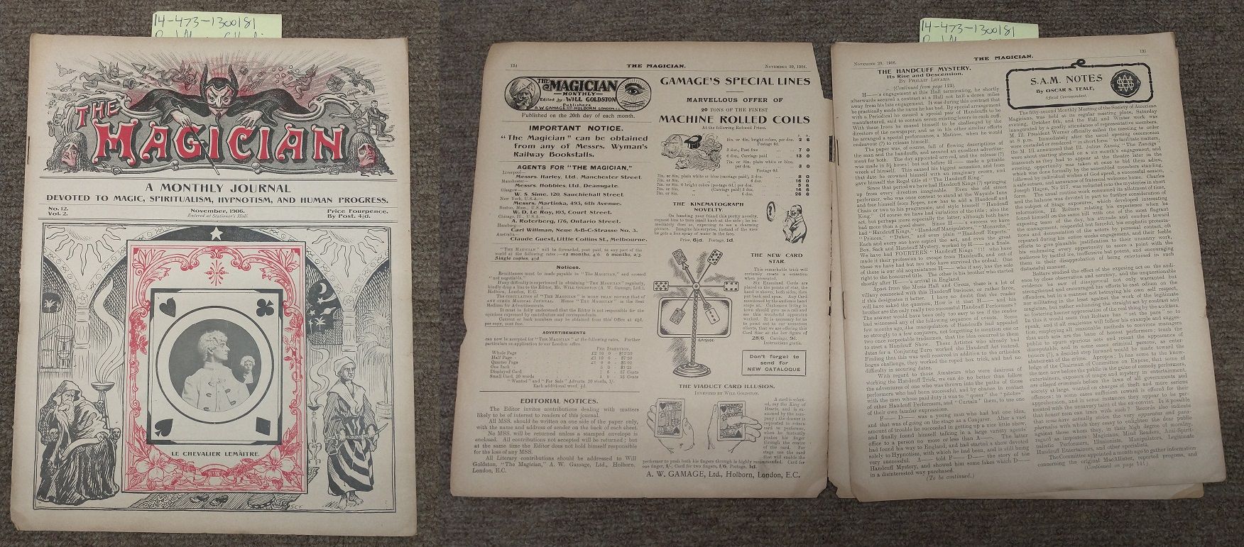 London: A.W. Gamage Ltd, 1906. Softcover. Octavo; VG; softcover; white spine with staples; covers age toned, some shelfwear, general edgewear, rubbing on fore corners and spine edges, closed tears on spine edges; text block age toned; 10pp; Shelved in Room G. 1300181. Full-priced Rockville.