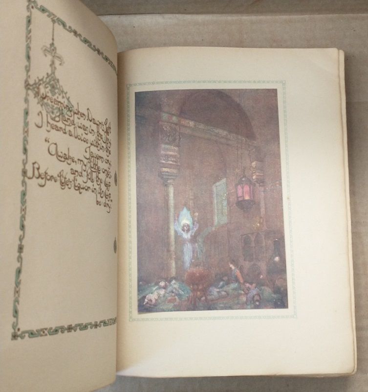 London: George C. Harrap & Co. Ltd, ca. 1909. Soft covers quarto rebound in dark brown embossed suede with sturdy, clean brown casing; VG; covers with moderate soiling and slightly frayed around edges; binding strong; deckle edges; paper discolored; front and end pages beautifully illustrated; tipped-in illustrations with adjacent poem framed in brown color; each page number illustrated on individual pages; pp. 75;