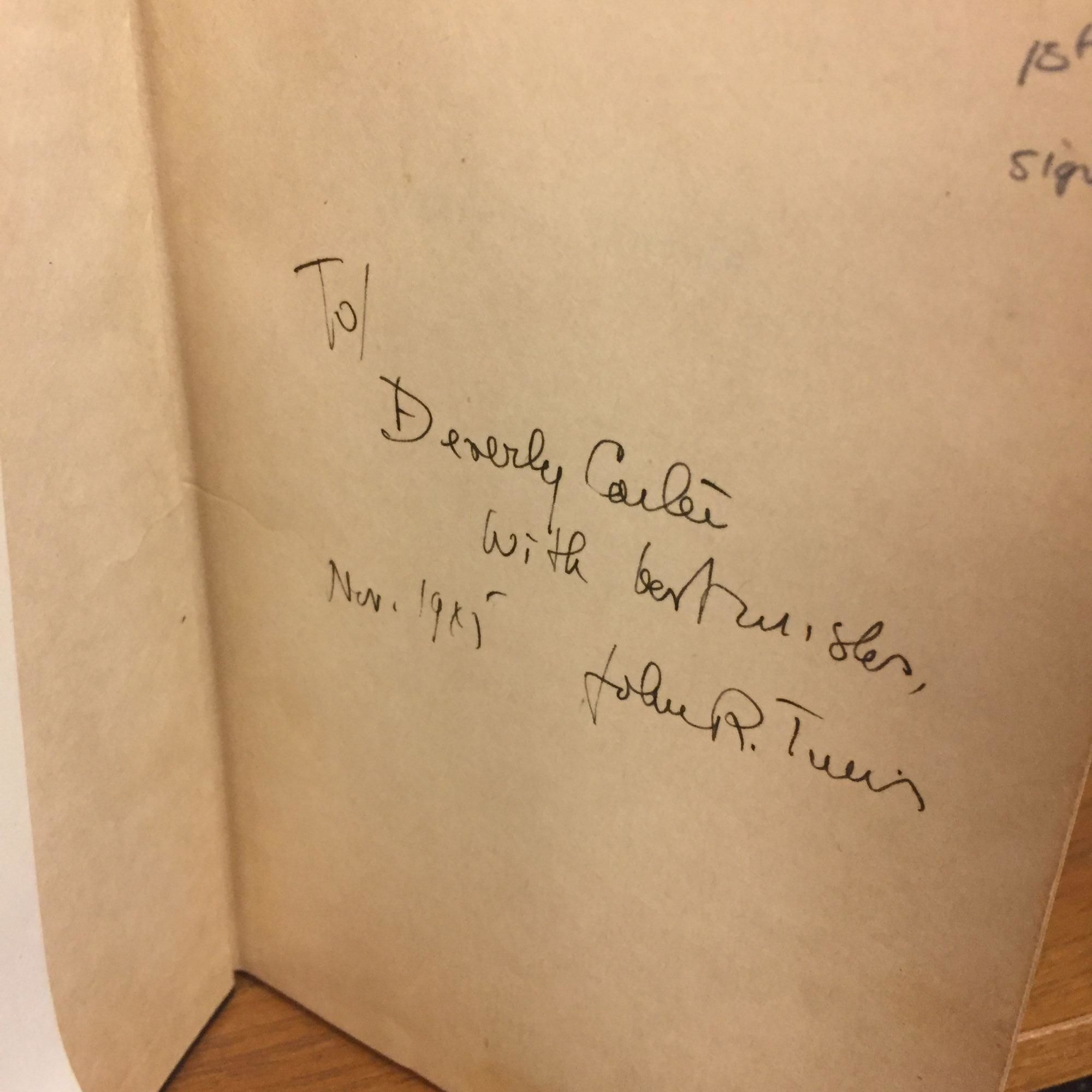 New York: Harcourt, Brace & Company, 1945. First Edition. Hardcover Octavo; VG/ VG-; pp. 292; Author's inscription on front end paper; faded light beige spine with white text; Black cloth boards with black text on red card; Tilted spine; DJ is intact under protective archival cover, shows general shelf ware: chipping, creasing and/or rubbing on corners, edges, covers and spine; Text block age toned but clean; Shelved Room G. 1289909. Special Collections.