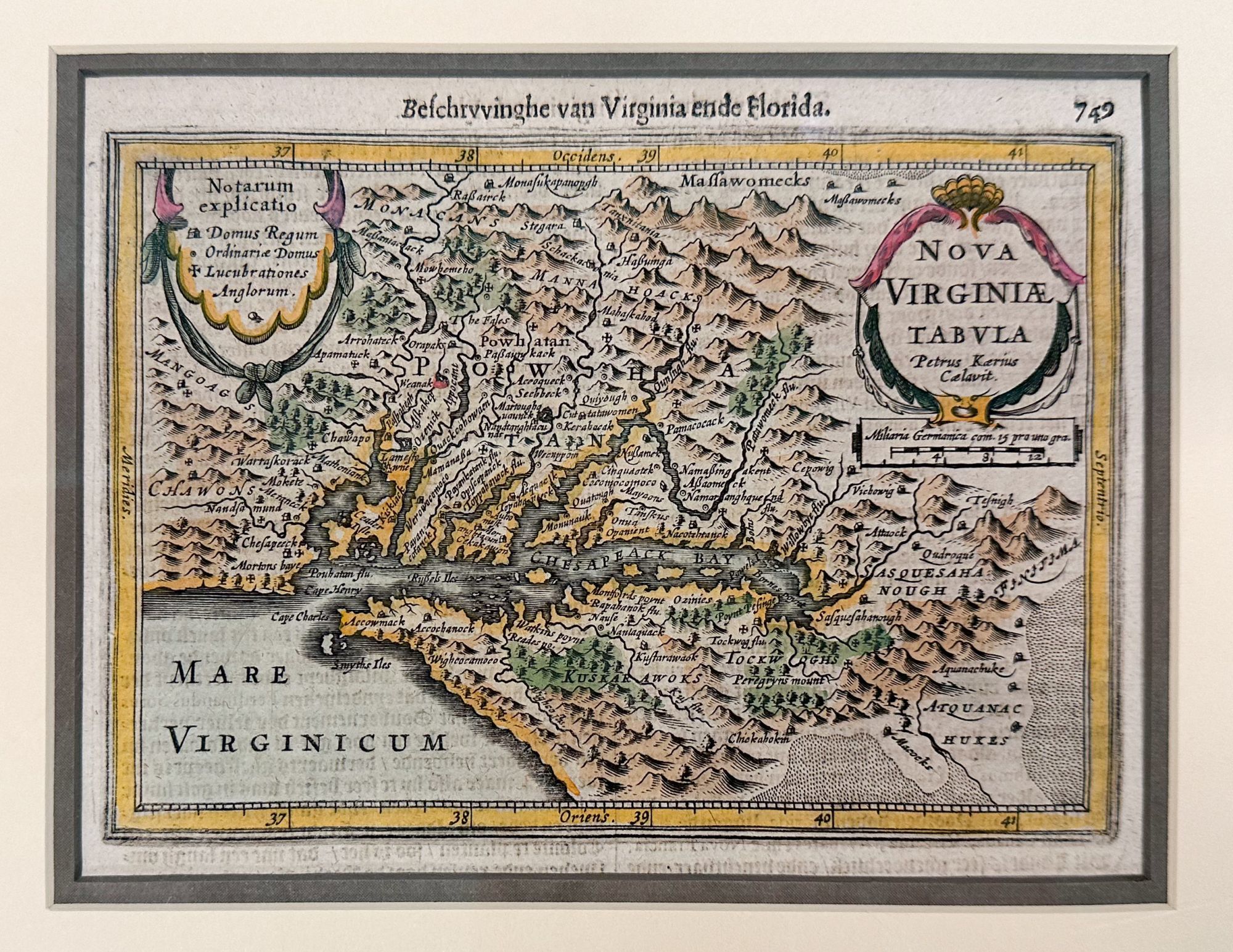 1) Nova Virginiae Tabula, by Pieter van den Keere and Jan Jansson, Amsterdam, 1631. A fine example of the 1631 German edition of Jansson’s derivative of John Smith’s highly important map of 1612, which was the only regional map of North America to appear in the Atlas Minor Gerardi Mercatoris. The map shows a fascinating early look at the Chesapeake Bay and the surrounding environs, including American Indian tribes, villages, rivers, and other early details. According to Burden, this is the first derivative of the Smith map to appear in an atlas, pre-dating the Hondius map by two years.