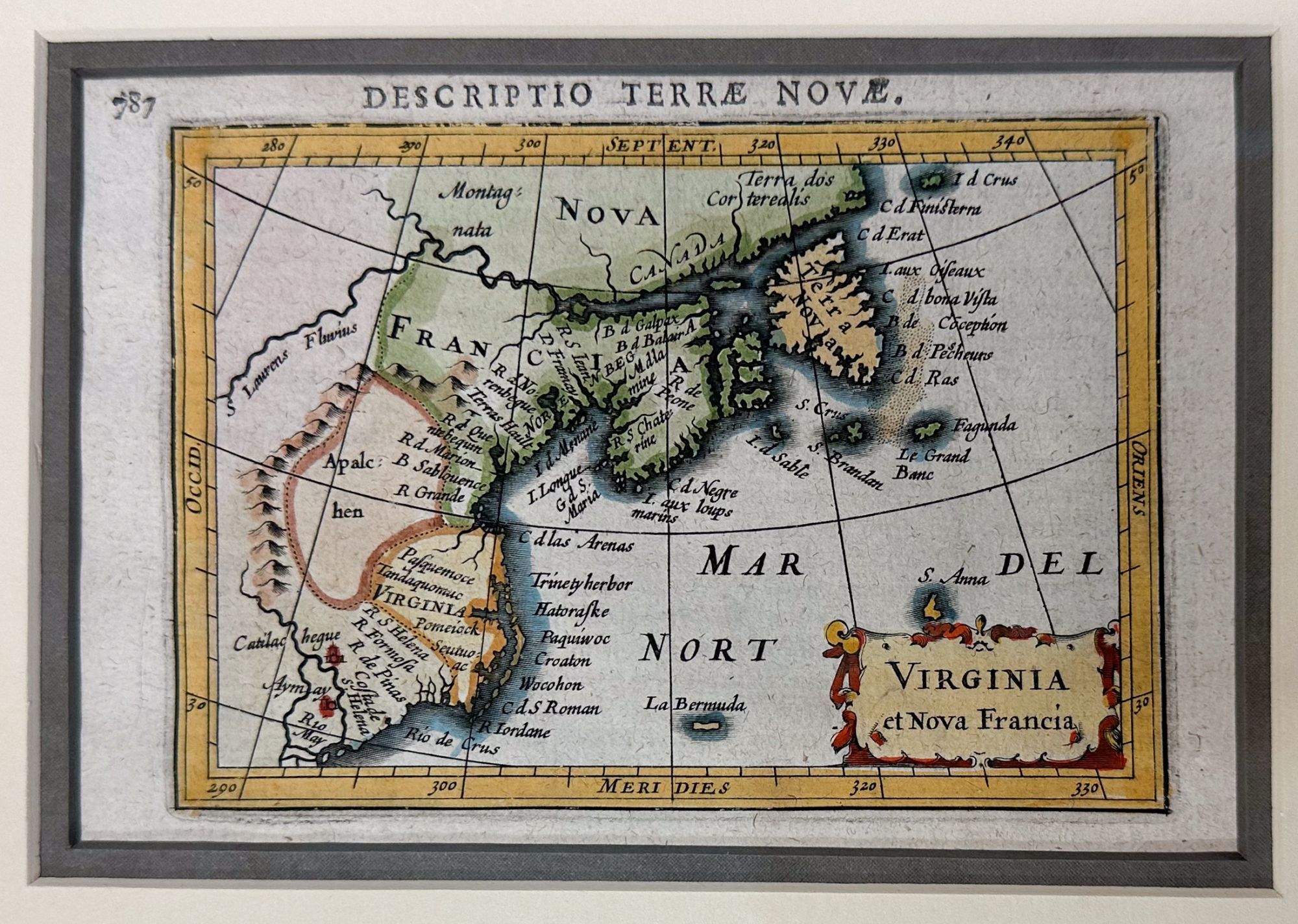 4) Descriptio Terrae Novae: Virginia et Nova Francia, 1618. This charming miniature map depicts the east coast of North America, and is based on Hondius’s world map from 1611. It does not incorporate new information from Samuel de Champlain (in Canada and along the Great Lakes) or of John Smith (in the Chesapeake Bay are and New England). The area from present-day New York to Maine is labeled Norenbega, and the area further south is labeled Virginia, with the Chesapeake Bay noticeably missing. A region just east of a large mountain range (the Appalachian mountains) is labeled Alpachen, and the St. Lawrence River features prominently at the top. Latin text on verso.