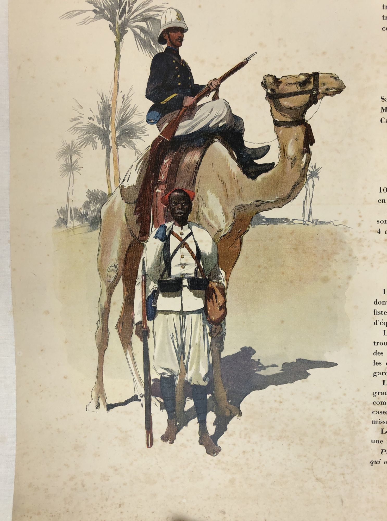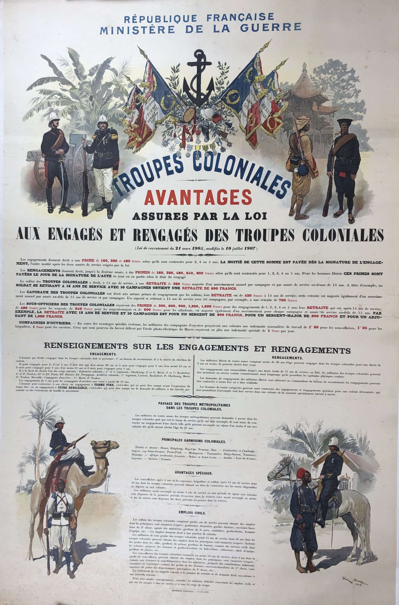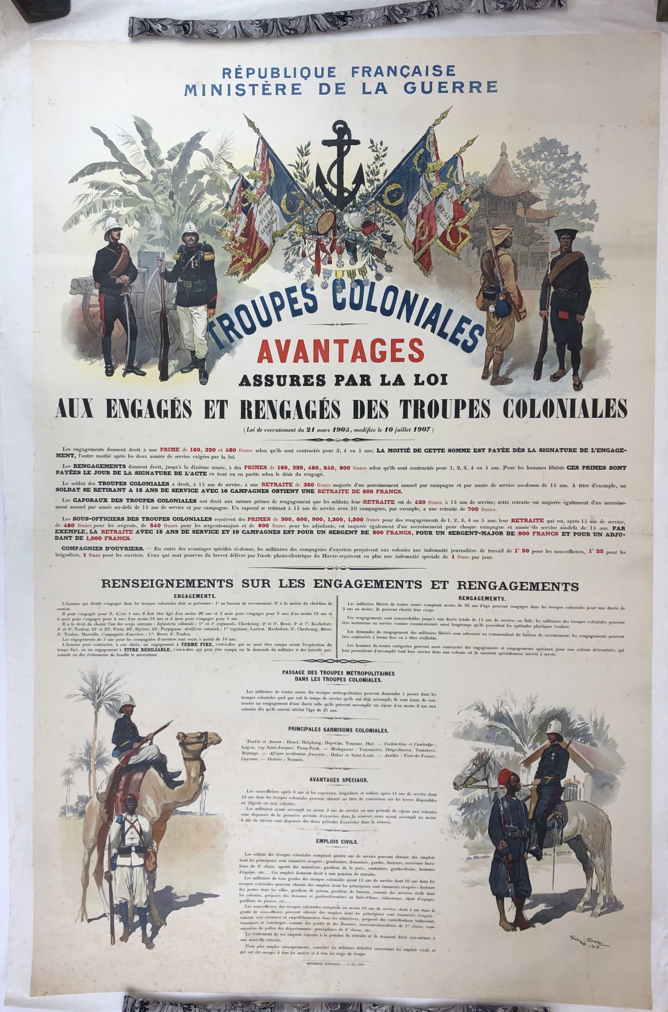 c1917. Large vertical poster mounted on a lightweight canvas depicts men in military uniforms beneath several flags in a tropical setting, at the top of the poster. At the bottom left corner of the poster is a man in uniform on a camel with another man at his side and in the other corner is a man in uniform on a horse with a man standing next to him. The text of the poster is in French. The heading above the top image reads: Republique Francaise Minister's De La Guerre and below the image reads: Troupes Coloniales/Avantages/ Assures Par La Loi/Aux Engages Et Rengages Des Troupes Coloniales. Header texts in blue, red and black. The remaining text is in black and red. Condition: Good to Good+. The poster's edges have slight foxing. Otherwise the surface shows mild wear. The edges have slight wrinkles. Dimensions w 30 in x h 46 1/8 in. 1328594. Special Collections.