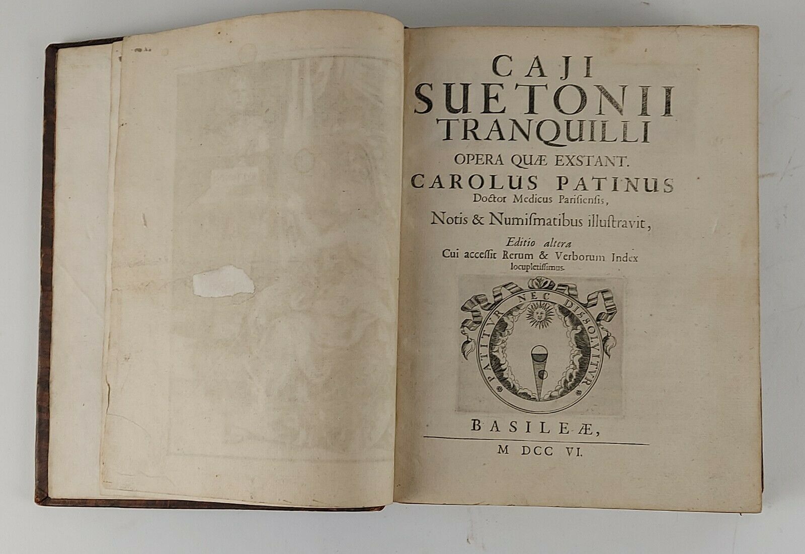 CAJI SUETONII TRANQUILLI OPERA QUAE EXSTANT. CAROLUS PATINUS DOCTOR MEDICUS PARISIENSIS, NOTIS & NUMISMATIBUS ILLUSTRAVIT, EDITIO ALTERA CUI ACCESSIT RERUM & VERBORUM INDEX LOCUPLETISSIMUS