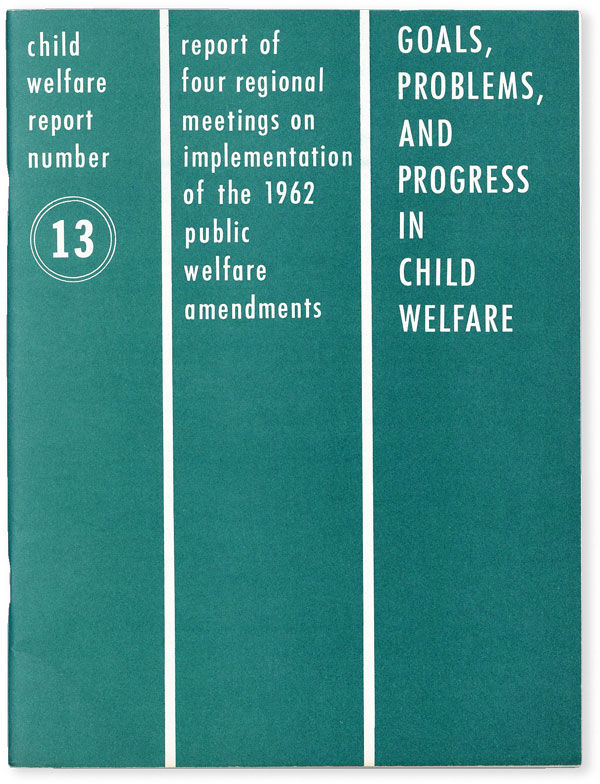 [Washington, D.C.]: U.S. Department of Health, Education, and Welfare - Welfare Administration, Children's Bureau, 1964. First Edition. Quarto. Staple-bound wrappers (softcover); 90pp. Mild crease to lower edge of text block, else Very Good. Report on implementation of the 1962 amendments to the Social Security Act, dealing with the extension of child welfare services including expansion of child day care services, expanding services in rural communities, increased budgets for training, development and outreach, etc. Introduction signed in type by Mildred Arnold, Director of the Division of Social Services.