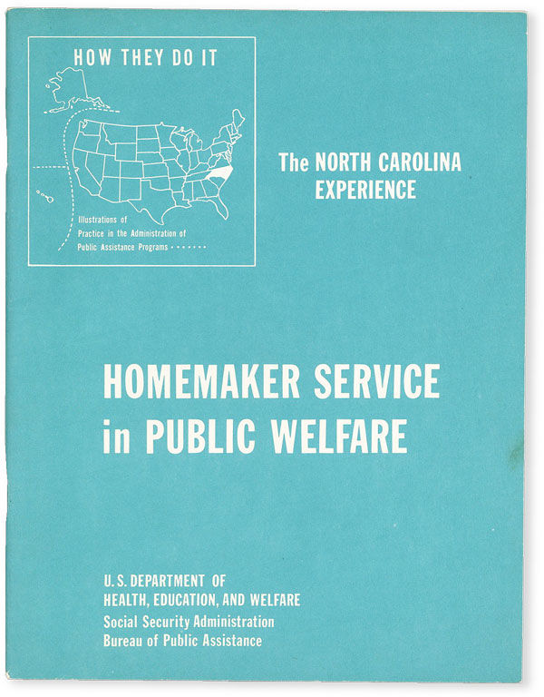 [Washington, D.C.]: U.S. Department of Health, Education, and Welfare, 1961. First Edition. Quarto. Staple-bound wrappers (softcover); 41,[8]pp. Fine. Description of the North Carolina "Homemaker Services" initiative, established in 1947, which placed social welfare agents in the homes of families and individuals in need, including shut-ins, children of disabled or incarcerated parents, and situations "where a mother does not know how to care for her children or keep house adequately and needs help in budgeting, buying, cooking, and other areas of homemaking.
