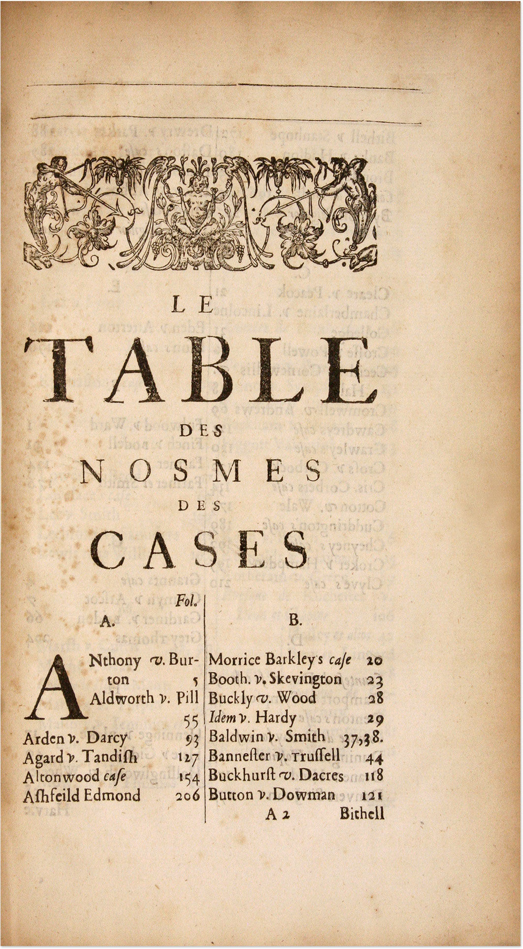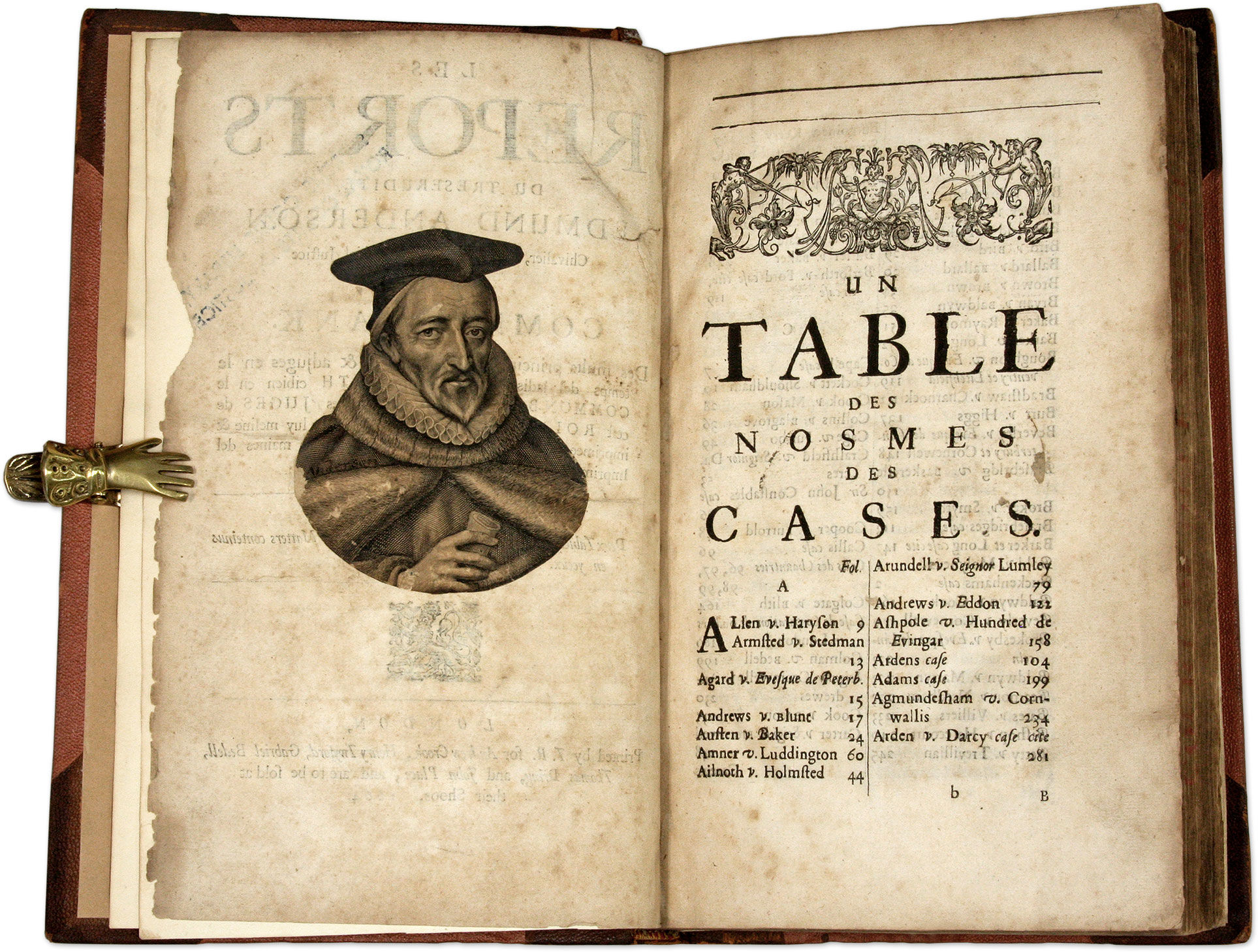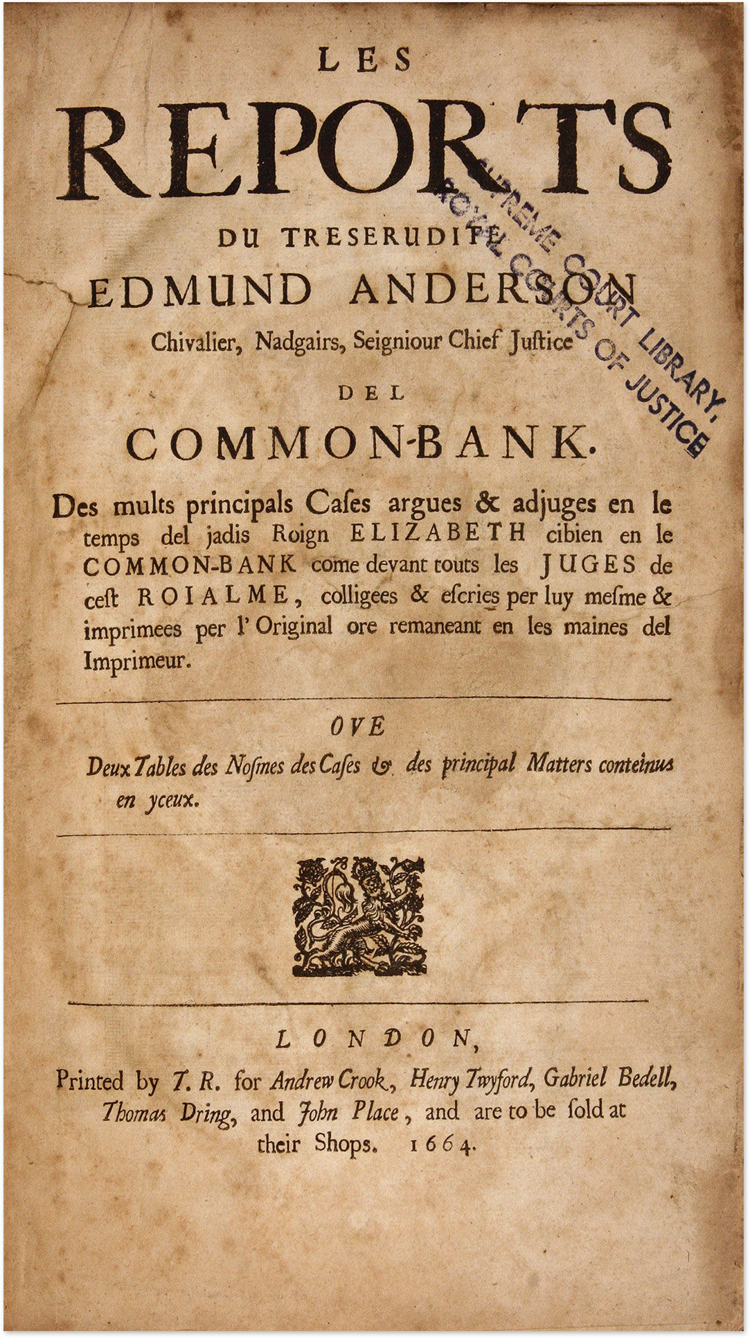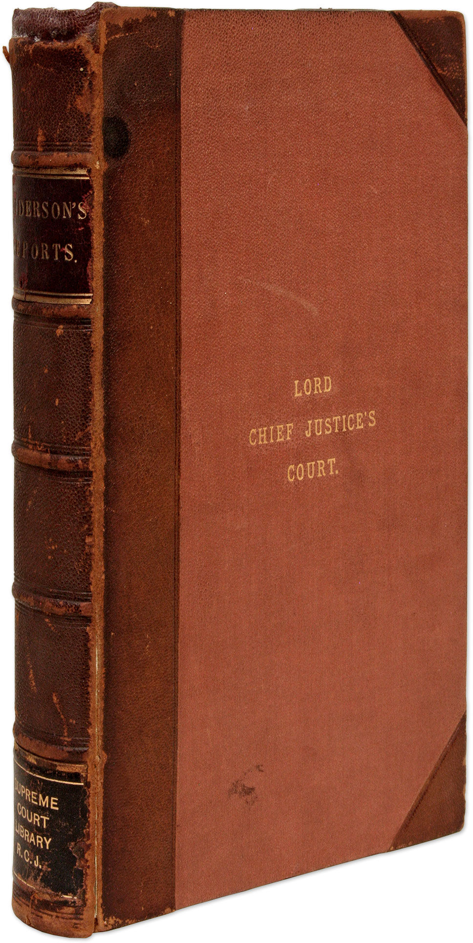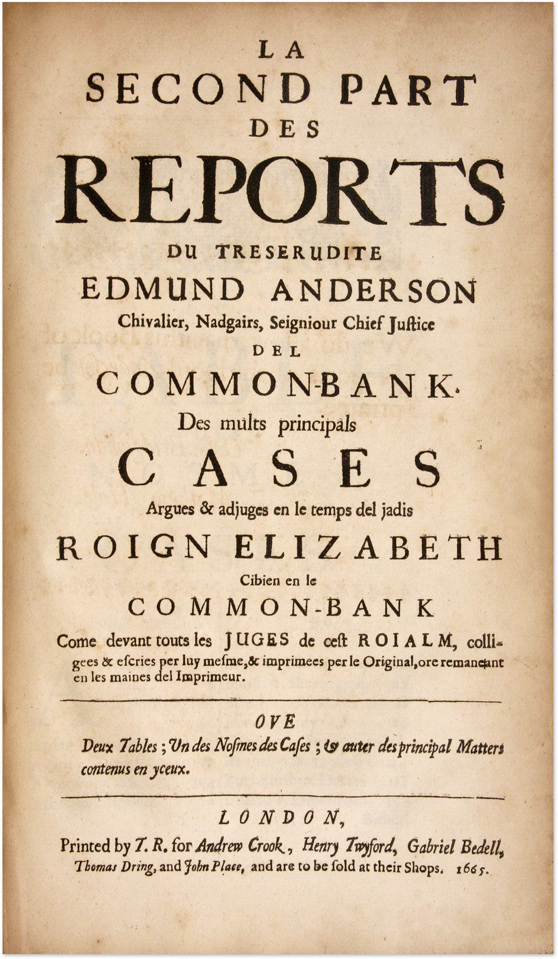 1664. Highly Regarded by Wallace and Sugden Anderson, Sir Edmund [1530-1605]. Les Reports du Treserudite Edmund Anderson Chivalier, Nadgairs, Seigniour Chief Justice del Common-Bank. Des Mults Principals Cases Argues & Adjuges en le Temps del Jadis Roign Elizabeth Cibien en le Common-Bank Come Devant Touts les Juges de Cest Roialme, Colligees & Escries per Luy Mesme & Imprimees per l'Original ore Remaneant en les Maines del Imprimeur. Ove deux Tables des Nosmes des Cases & des Principal Matters Conteinus en Yceux. London: Printed by T[homas] R[oycroft] for Andrew Crook [et al.], 1664. [i], 354, [38] pp. Portrait frontispiece lacking, image of Anderson from that frontispiece affixed to verso of title page. [Bound with] Anderson, Sir Edmund. La Second Part des Reports du Treserudite Edmund Anderson Chivalier, Nadgairs, Seigniour Chief Justice del Common-Bank. Des Mults Principals Cases Argues & Adjuges en le Temps del Jadis Roign Elizabeth Cibien en le Common-Bank Come Devant Touts les Juges de Cest Roialm, Colligees & Escries per Luy Mesme, & Imprimees per l'Original, Ore Remaneant en les Maines del Imprimeur. Ove Deux Tables; Un des Nosmes des Cases; & Auter des Principal Matters Contenus en Yceux. London: Printed by T[homas] R[oycroft] for Andrew Crook [et al.], 1665. [vi], 211, [21] pp. Portrait frontispiece lacking. Folio (11-1/4" x 7"). Nineteenth-century three-quarter morocco over pebbled cloth, raised bands, lettering piece and library label (Supreme Court Library R.C.J) to spine, repair to head of spine, "Lord Chief Justice's Court" gilt-stamped to center of front board, hinges reinforced, endpapers renewed. Light soiling to boards, moderate rubbing to extremities, front joint starting, stamp of Supreme Court to front free endpaper and title page, which has some edgewear and a few minor tears. Moderate toning to text, faint dampspotting and dampstaining in a few places. $650. * Only edition. These reports from 1534-1604 are praised by Wallace, who says their style "is more full and circumstantial" than their predecessors. He also notes, based on remarks by Sir Edward Sugden assessment, that Anderson was "a profound and industrious lawyer, who was assiduous in his attendance at court, as is evident from the Reports in his time, and singularly ready in the application of his great learning to the legal ques.