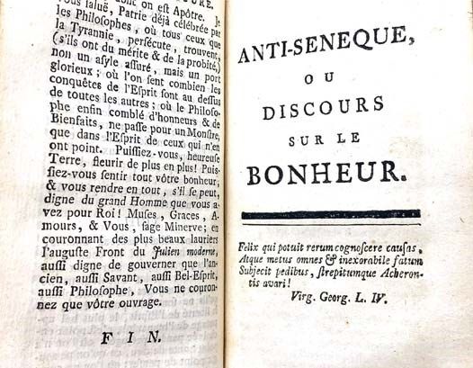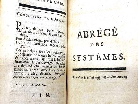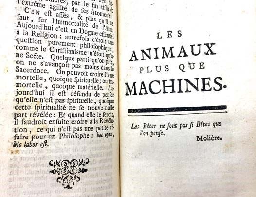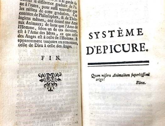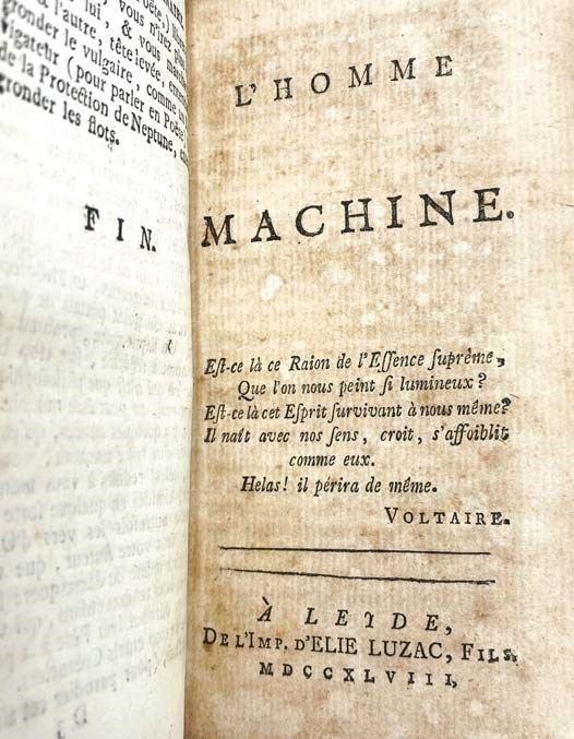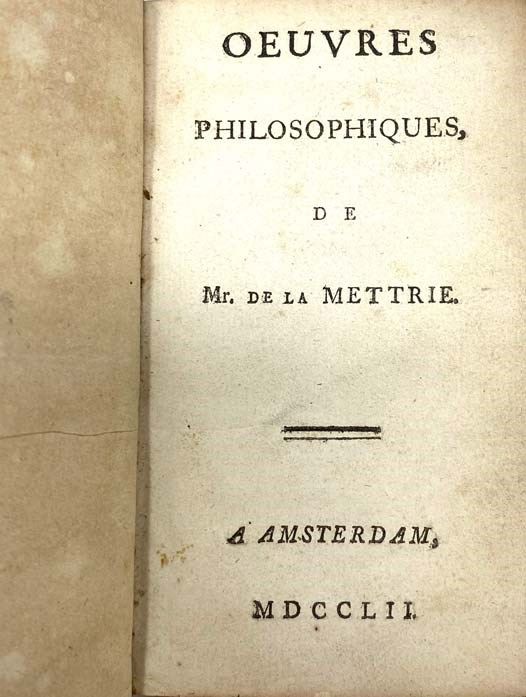 Amsterdam: S.N. [Elie Luzac], 1752. Full-Leather. Very Good/No Jacket. Spine leather drying, light stain to front flyleaf. 1752 Full-Leather. 78, 109, 198, 58, 77, 56, 114 pp. Original full leather, leather spine label, marbled paste-down endpapers. A collection of works by the influential Enlightenment philosopher best known for L'Homme Machine, which takes materialist concepts introduced by Rene Descartes one step further to contend that human beings are automatons with no souls. These concepts later became influential in the theories of evolution and quantum mechanics. This volume includes: Discours Preliminaire; L'Homme Machine; Traite de l'Ame; Abrege des Systemes; Les Animaux plus que Machines; L'Homme Plante; Systeme d'Epicure; Anti-Seneque, ou Discours sur le Bonheur.
