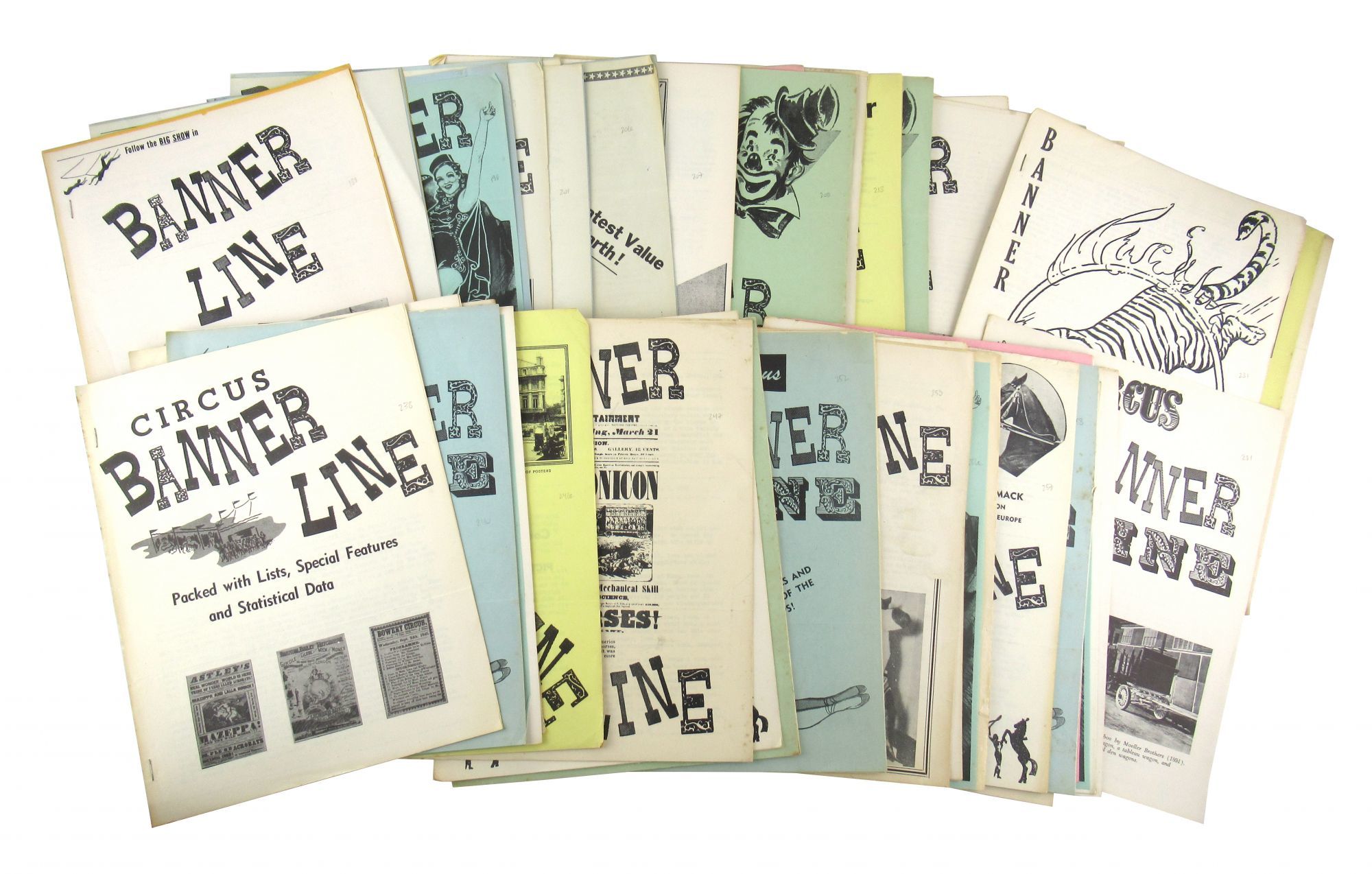 Quite uncommon and substantial collection of the "World's Only Twice-A-Month Circus Publication," owned and edited by a Van Matre of Philadelphia. Like many such newsletters, articles are short and anecdotal, interspersed with related items for sale (circus photographs, books, and other paraphernalia). In this collection one can read about former circus "fat lady" Dolly Dimple and her extreme diet following a near-fatal heart attack (down from 555 to 125 pounds); brief biographies of noted circus figures like Clint Finney and W.W. Cole; and annual circus reviews. However, the publisher appears to have been most interested in providing historical circus itineraries and inventories, each issue providing four or five such lists. Though the publication ran for at least thirty years, from the 1940s to the 1970s, this was clearly an amateur effort with a minuscule print run per issue--we find no copies in the trade, and just three institutional holdings as of August, 2020, at Illinois State, UVA, and Wisconsin Historical.