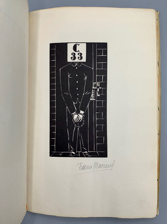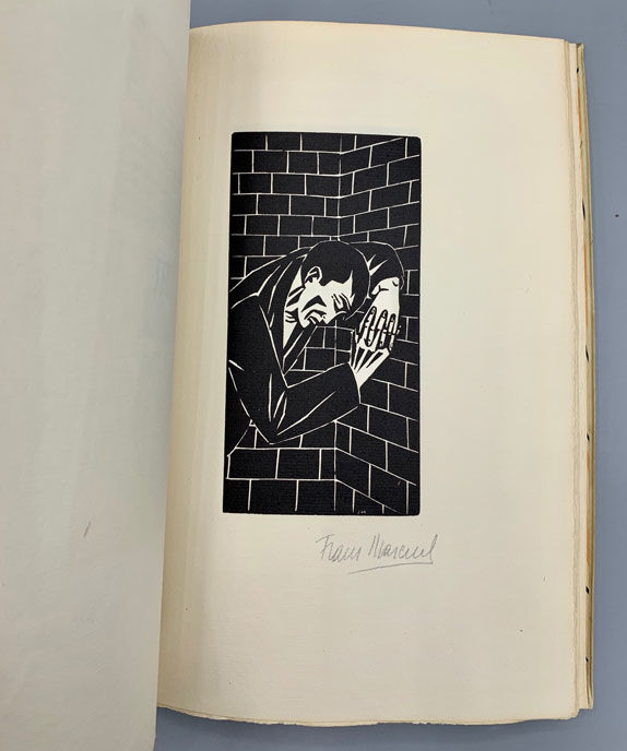 München [Munich]: Drei Masken Verlages, 1923. Limited Edition. Very good. SIGNED. 57pp. Quarto [28 cm] Parchment vellum boards, with a hubbed spine, gilt spine title, and single gilt ruled borders on the spine and boards. Top edge gilt. Patterned endpapers. Bound by Hübel & Denck in Leipzig. The front board is wavy. There is a previous owner's decorative bookplate on the front pastedown. The text is in English. Ritter C a 29. Woodcuts by Frans Masereel. This is one of the copies which have been numbered with Roman Numerals. Number XLVII of LXX (the copies numbered in Roman numerals forming part of an overall edition of 340 copies). Signed by Frans Masereel on the limitation page. Masereel has additionally signed the seven full-page woodcut illustrations within.
