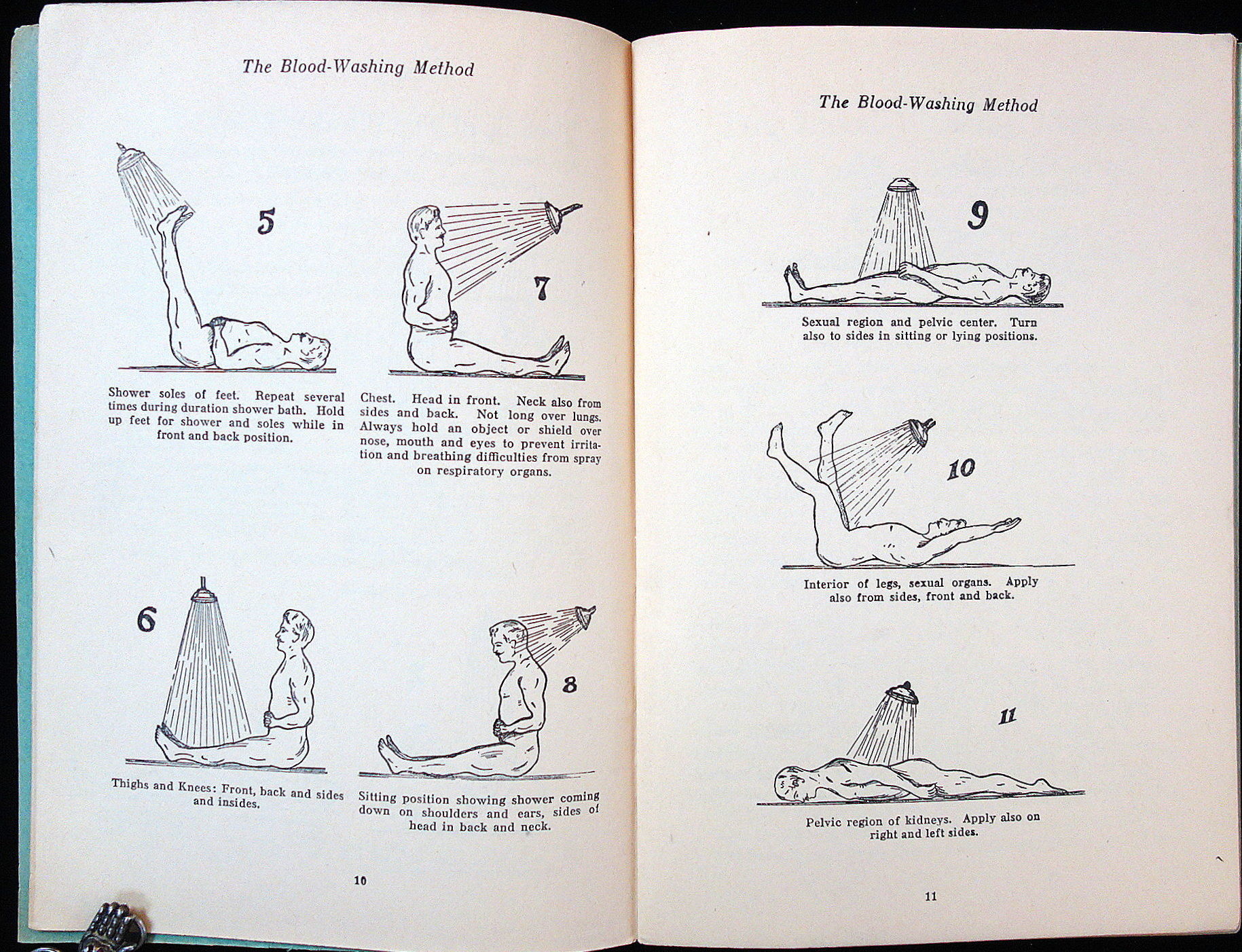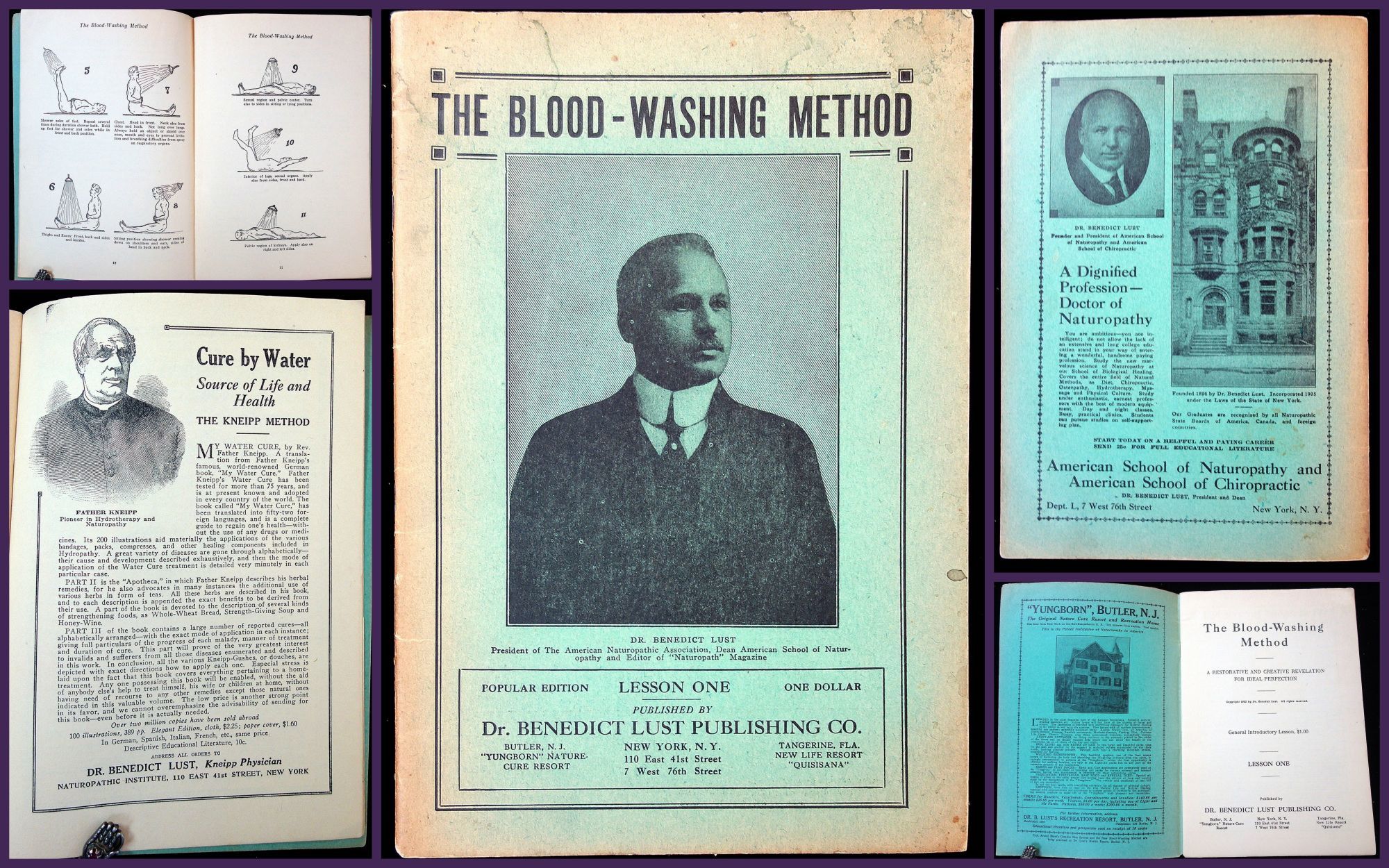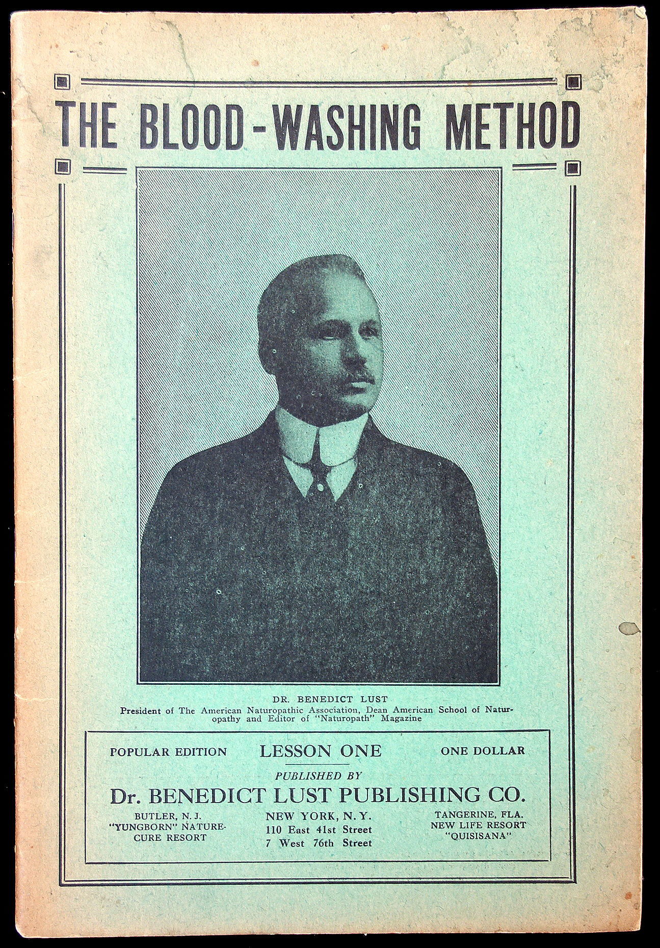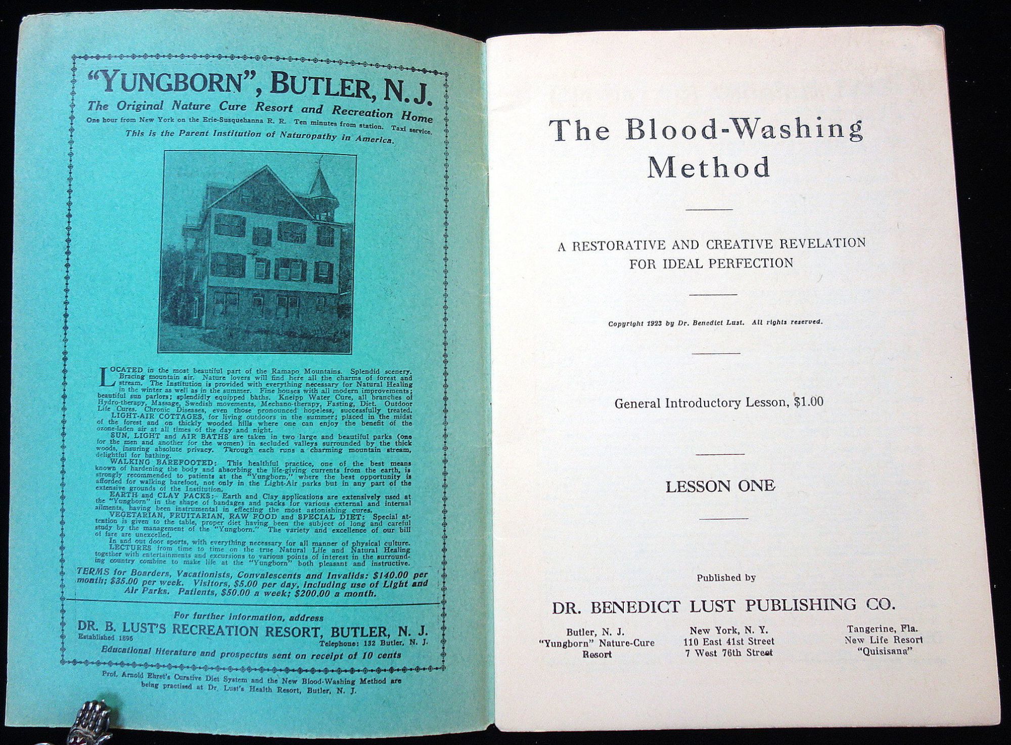 New YOrk: Dr. Benedict Lust Publishing Co, 1923. Popular. Edition. Lesson 1. 26 pp. Stiff wrap with image from photograph of Lust. The treatment includes a show with a special shower head at 8 to 14 feet with special attention to the stomach and intestine, followed by a bath, an "internal bath", the consumption of "Inner-Clean" taken daily, following Ehret's Mucusless Diet and much more. This is followed by pages of diagrams illustrating the tehnic(sp) of the Blood-Washing Method. This is only part one. Part II begins on page 13. The inside covers promote "Yungborn", in Butler NJ - The Original Nature Cure Resort and Recreation Home, Dr. Lust's Health Resort, Tangerine FLA and a promotion for Lust "A Dignified Profession -- Doctor of Naturopathy. The last pages of the book promote such things as Cure by Water - The Kneipp Method, The Nature Method of Healing by F. E. Bliz, and much more. Measures 9 1/2" x 6 1/2". Fading on cover. Dr. Benedict Lust. President of the American Naturopathic Association, Dean American School of Naturopathy and Editor of "Naturopath" Magazine.