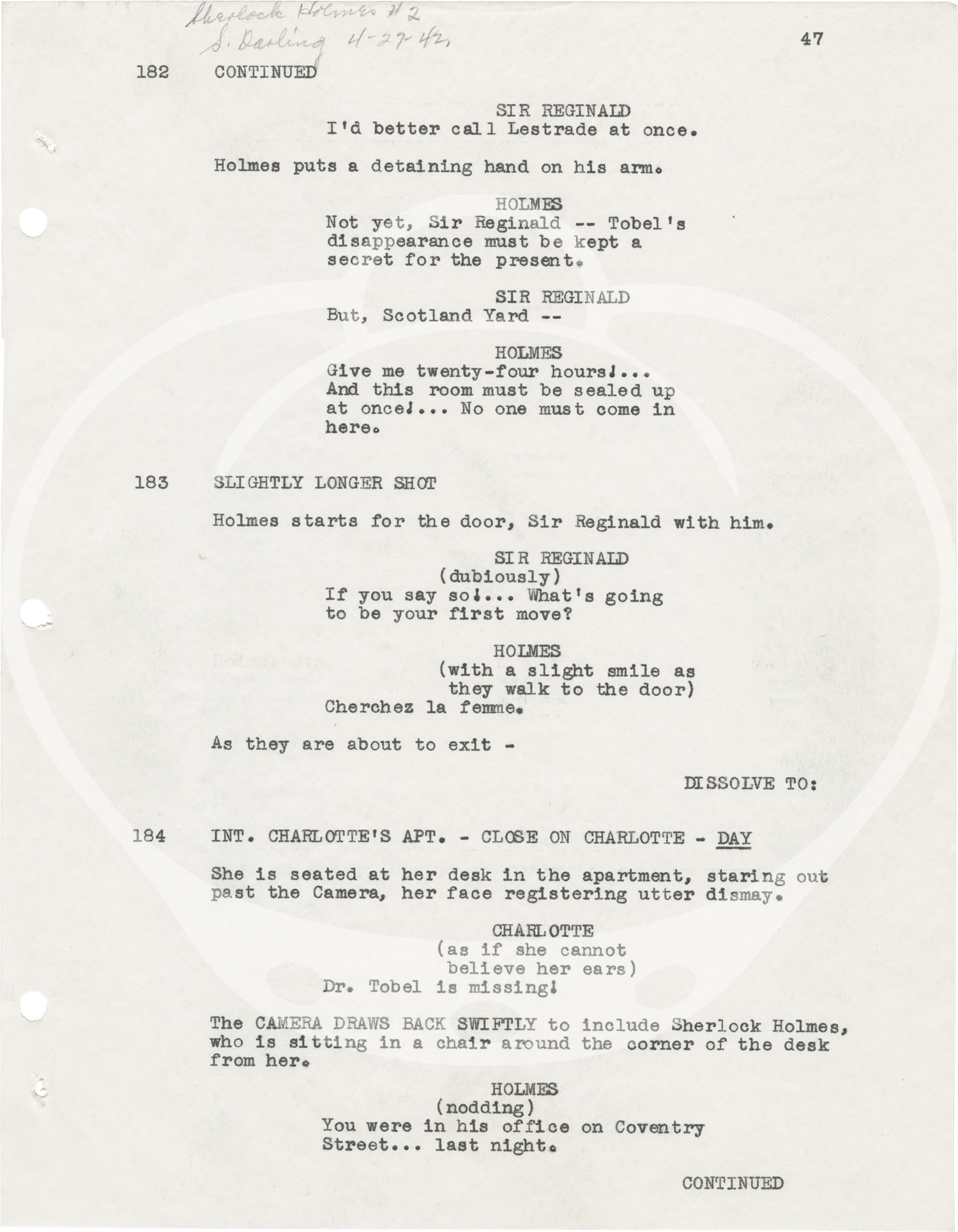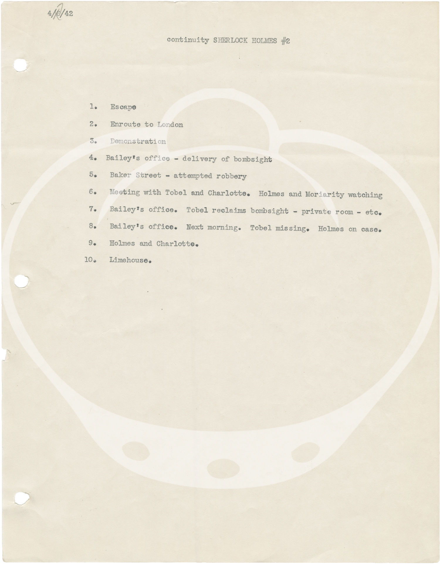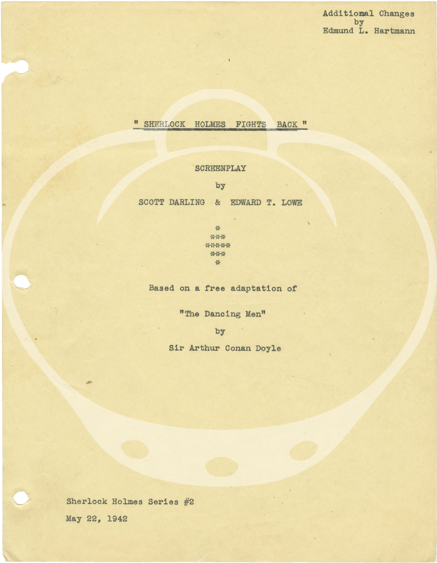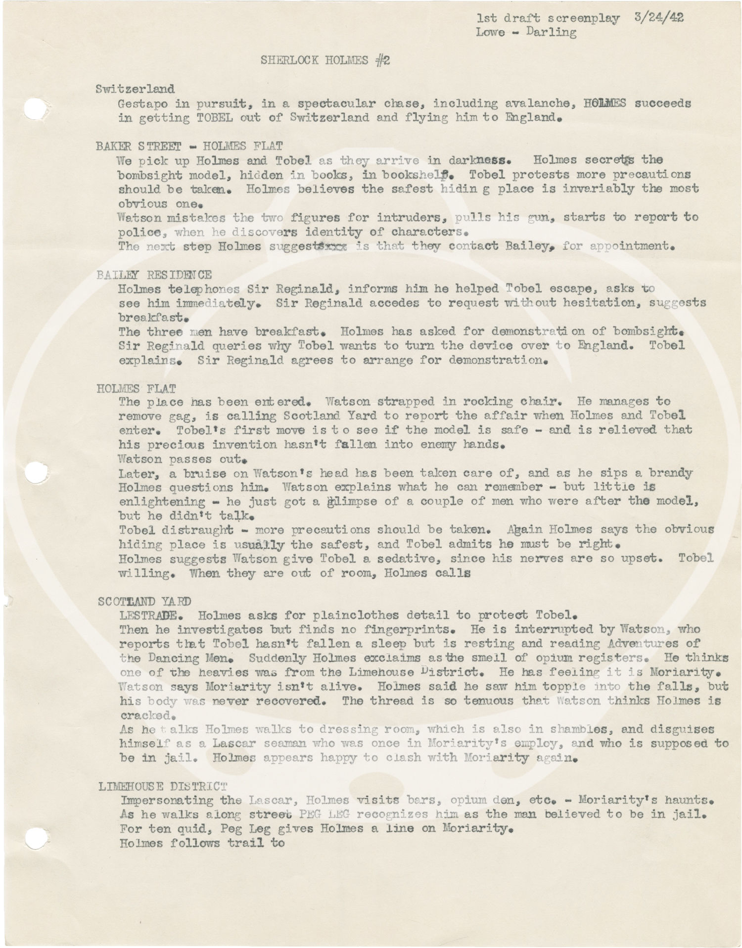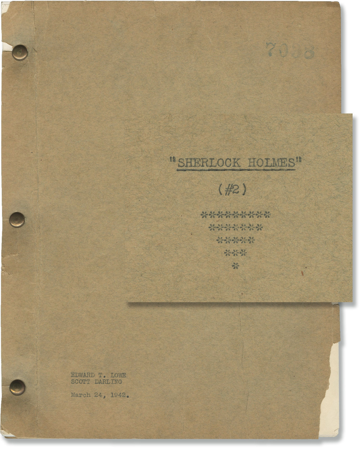 First is a First Draft script, under the working title "'Sherlock Holmes' (#2)," by screenwriters Edward T. Lowe and Scott Darling, dated March 24, 1942. Ribbon copy typescript on onionskin, with annotations in manuscript pencil on several pages, inquiries about plotline, question marks, as well as dates, and name of screenwriter Darling. Bound in, preceding script, are: A two-page, carbon typescript, breakdown of the story in 21 points, with annotation of "1st rough draft" and "One 3/24/42," in manuscript pencil, in upper right of first page. A ribbon copy typescript "continuity" breakdown of locations and sequences in ten points, dated 4/6/42. A ribbon copy typescript "comments on Sherlock Holmes #2," broken into nine points, dated 4-6-42, and a three-page ribbon copy typescript synopsis, dated 3/24/42.