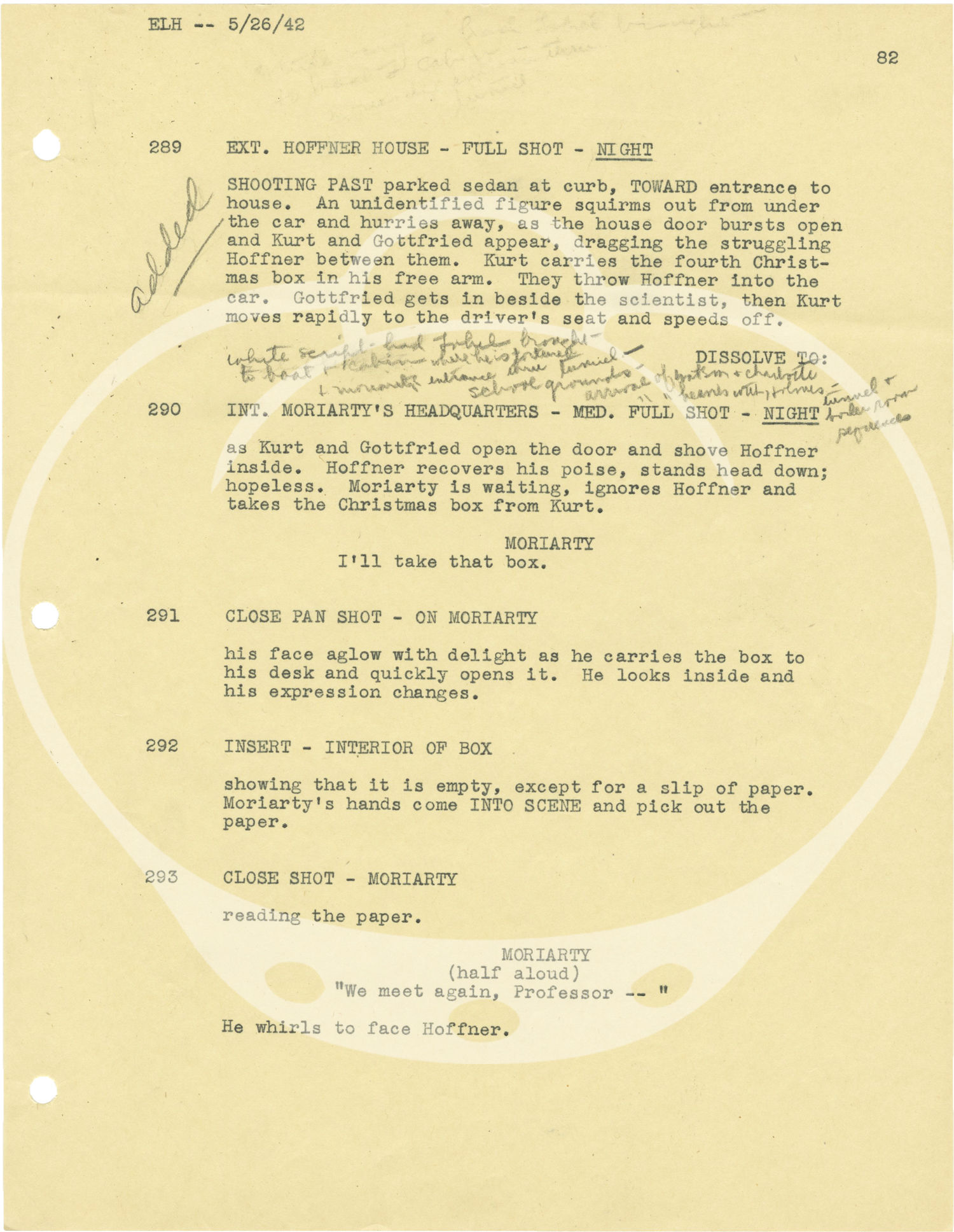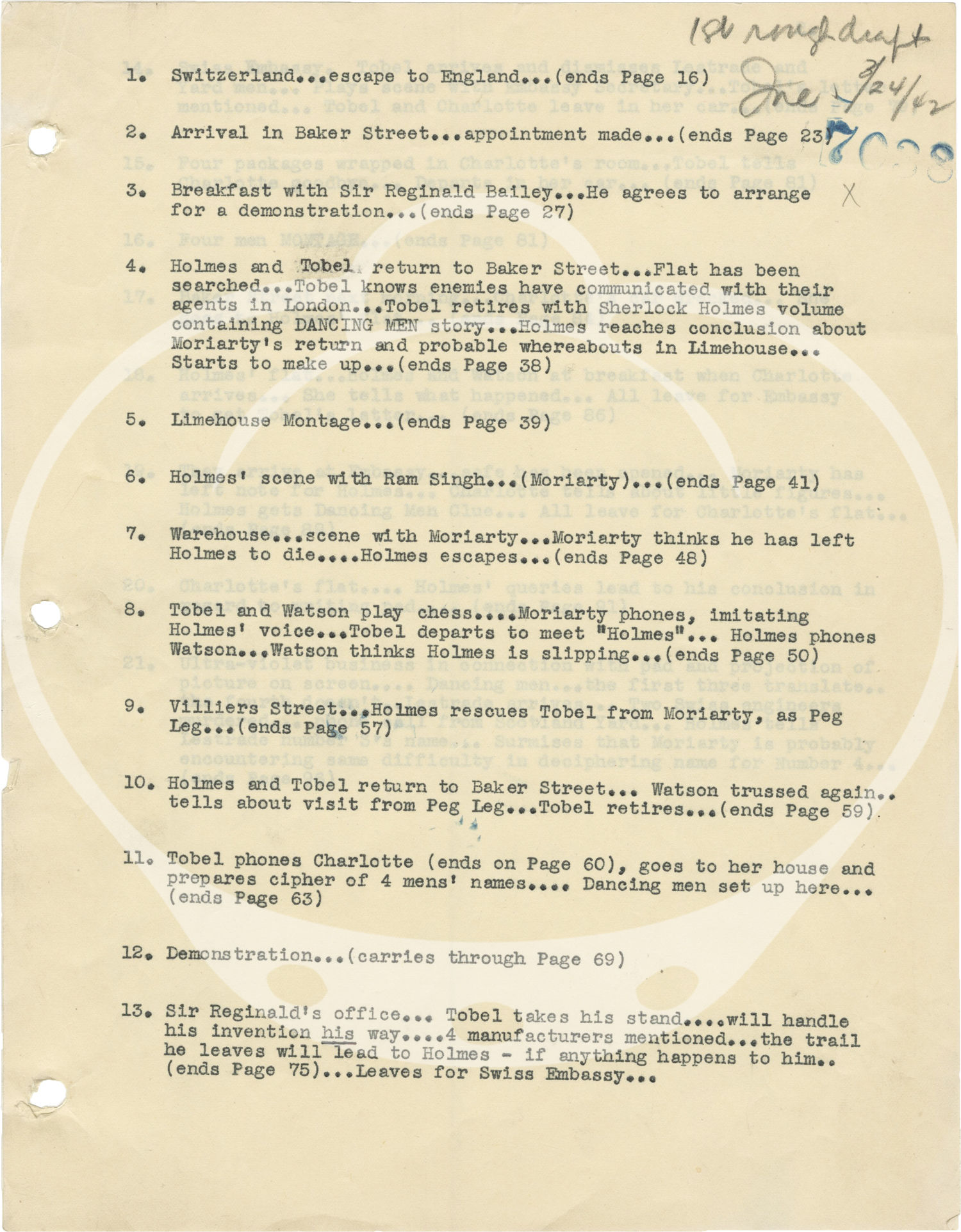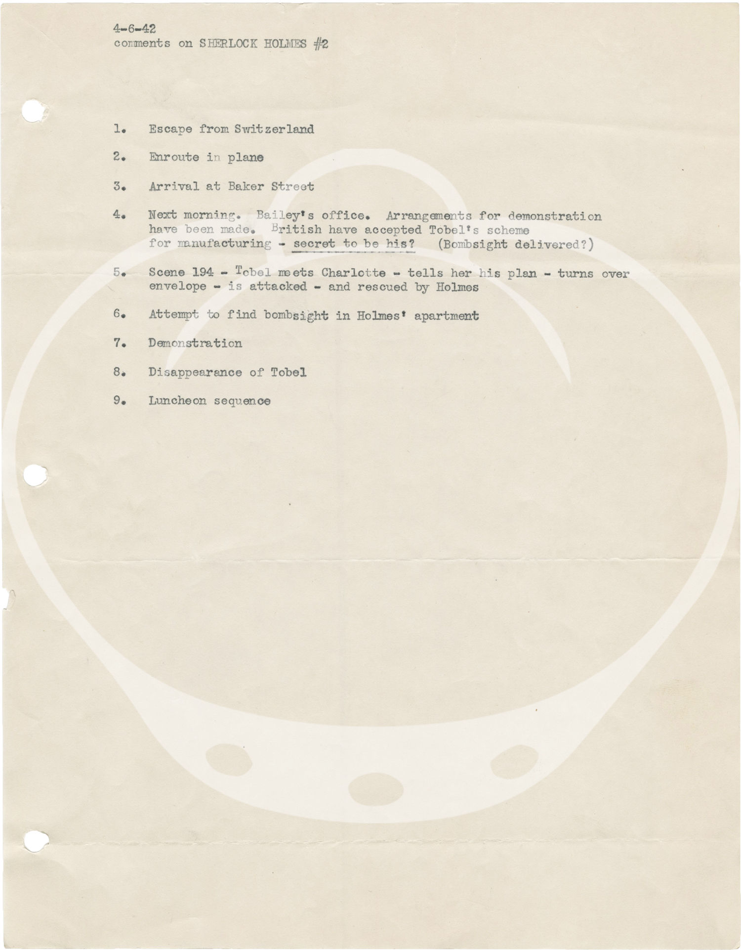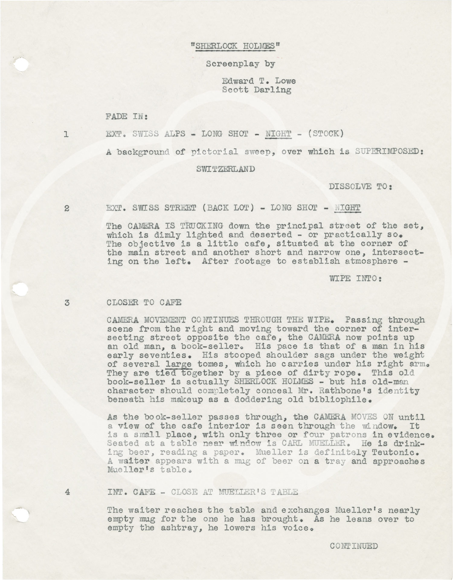 First is a First Draft script, under the working title "'Sherlock Holmes' (#2)," by screenwriters Edward T. Lowe and Scott Darling, dated March 24, 1942. Ribbon copy typescript on onionskin, with annotations in manuscript pencil on several pages, inquiries about plotline, question marks, as well as dates, and name of screenwriter Darling. Bound in, preceding script, are: A two-page, carbon typescript, breakdown of the story in 21 points, with annotation of "1st rough draft" and "One 3/24/42," in manuscript pencil, in upper right of first page. A ribbon copy typescript "continuity" breakdown of locations and sequences in ten points, dated 4/6/42. A ribbon copy typescript "comments on Sherlock Holmes #2," broken into nine points, dated 4-6-42, and a three-page ribbon copy typescript synopsis, dated 3/24/42.