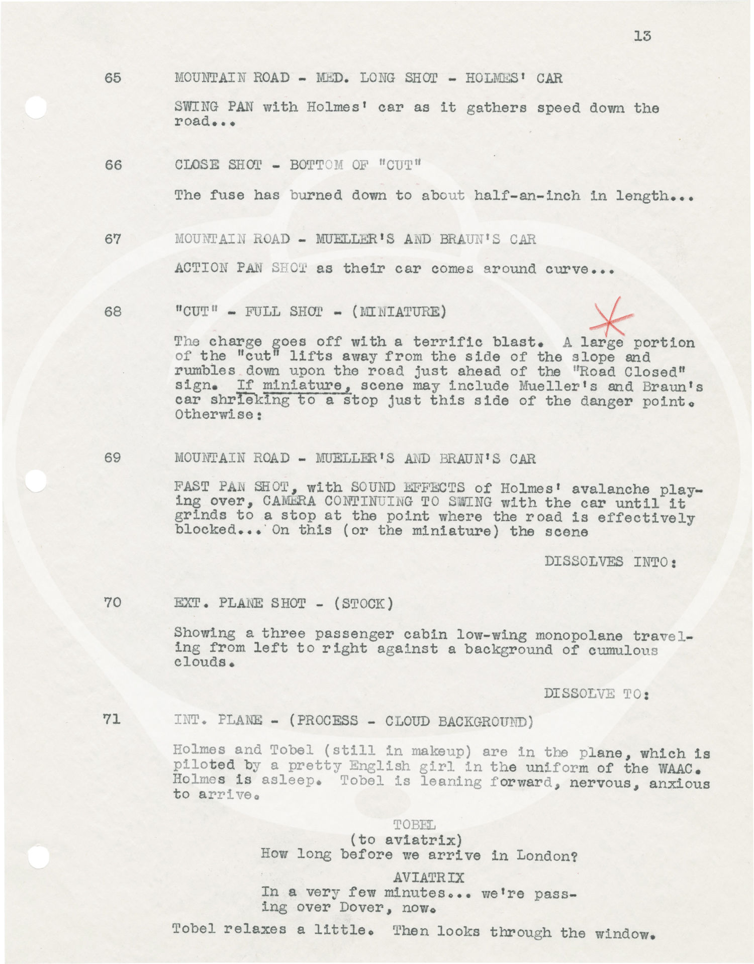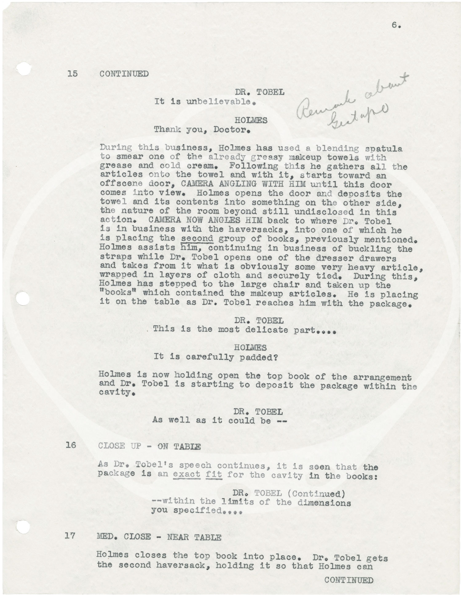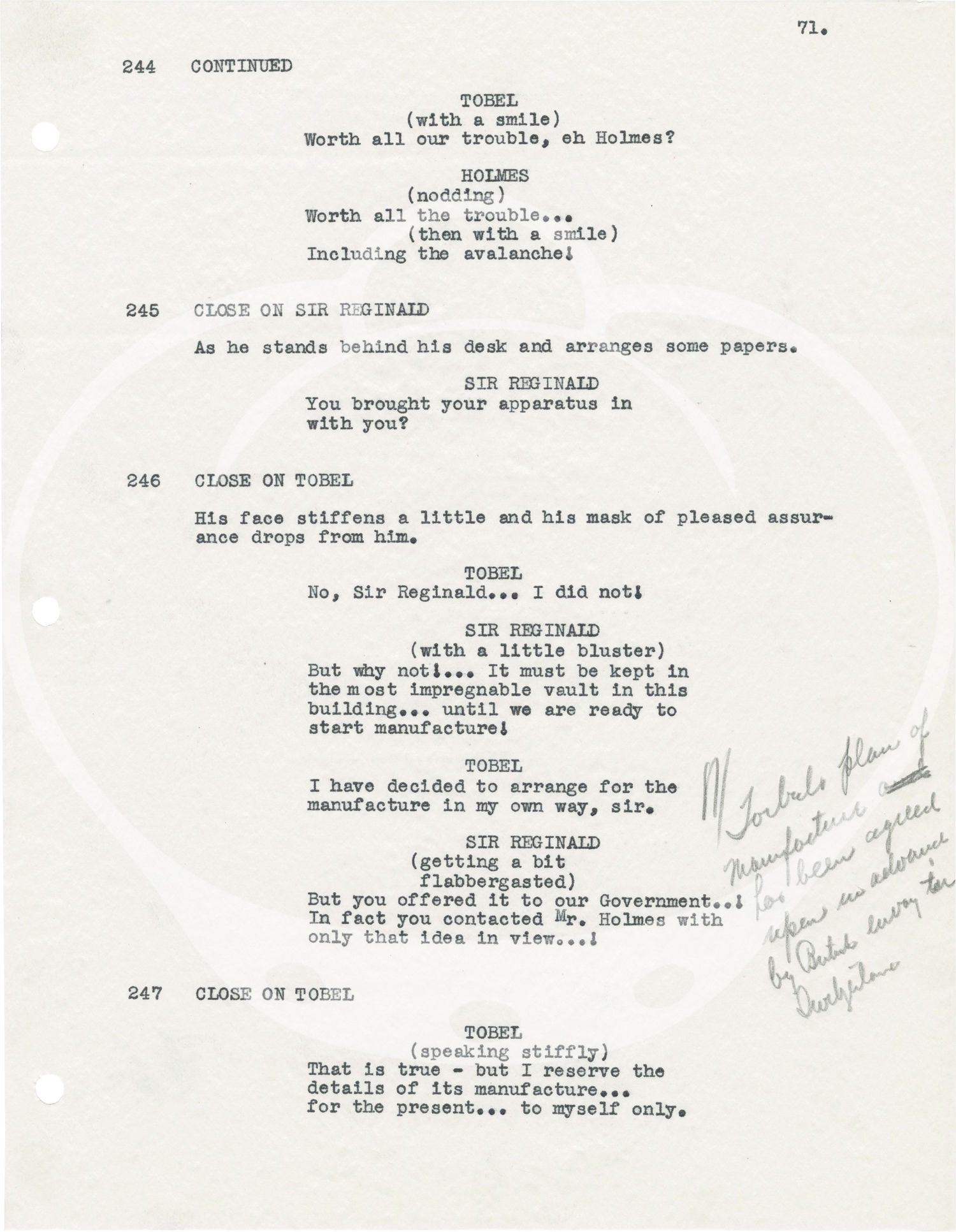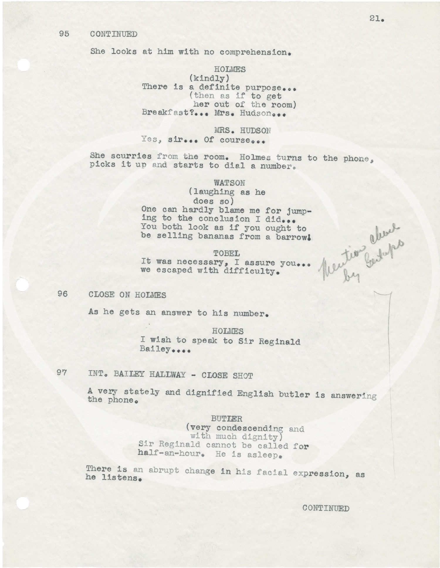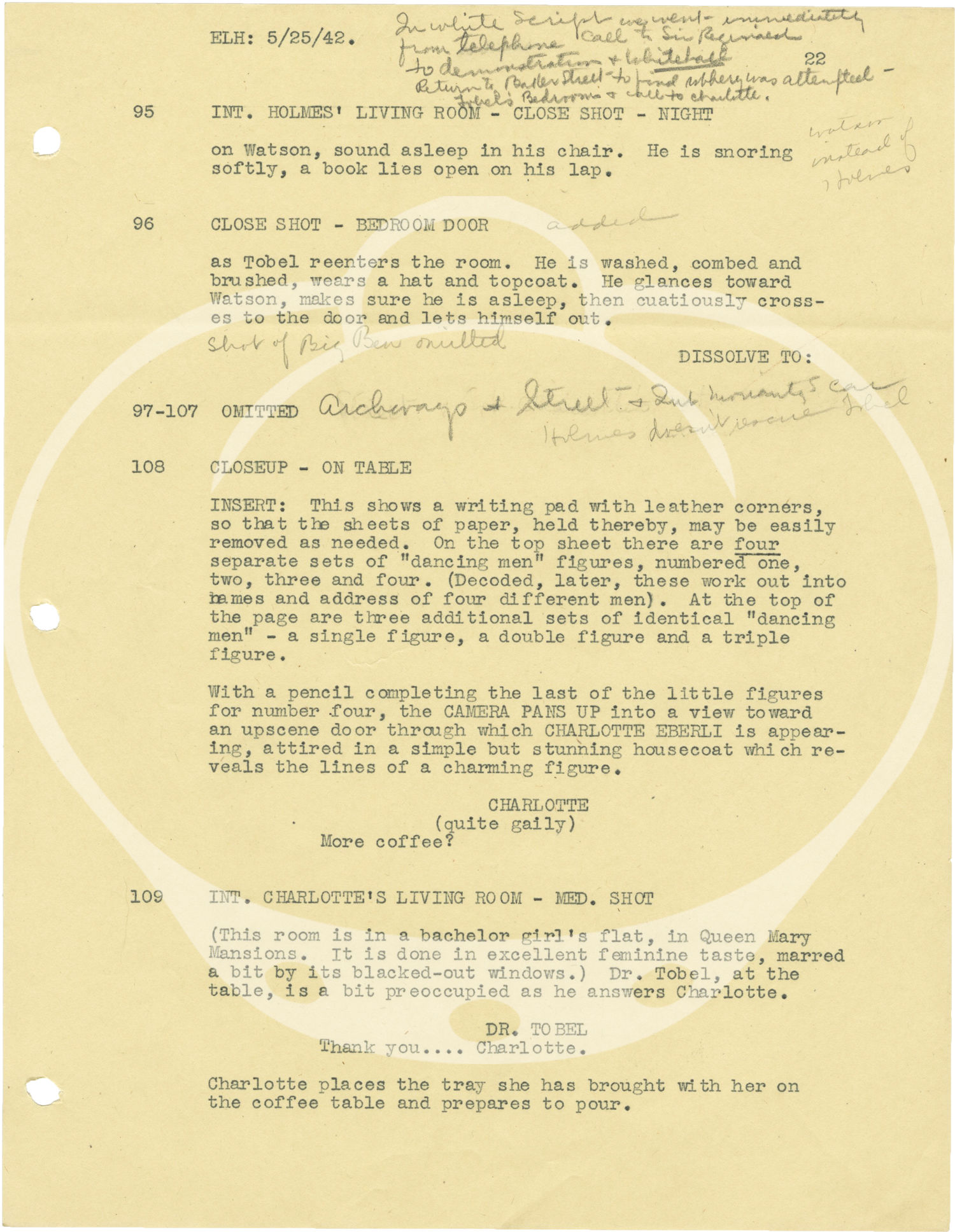 First is a First Draft script, under the working title "'Sherlock Holmes' (#2)," by screenwriters Edward T. Lowe and Scott Darling, dated March 24, 1942. Ribbon copy typescript on onionskin, with annotations in manuscript pencil on several pages, inquiries about plotline, question marks, as well as dates, and name of screenwriter Darling. Bound in, preceding script, are: A two-page, carbon typescript, breakdown of the story in 21 points, with annotation of "1st rough draft" and "One 3/24/42," in manuscript pencil, in upper right of first page. A ribbon copy typescript "continuity" breakdown of locations and sequences in ten points, dated 4/6/42. A ribbon copy typescript "comments on Sherlock Holmes #2," broken into nine points, dated 4-6-42, and a three-page ribbon copy typescript synopsis, dated 3/24/42.