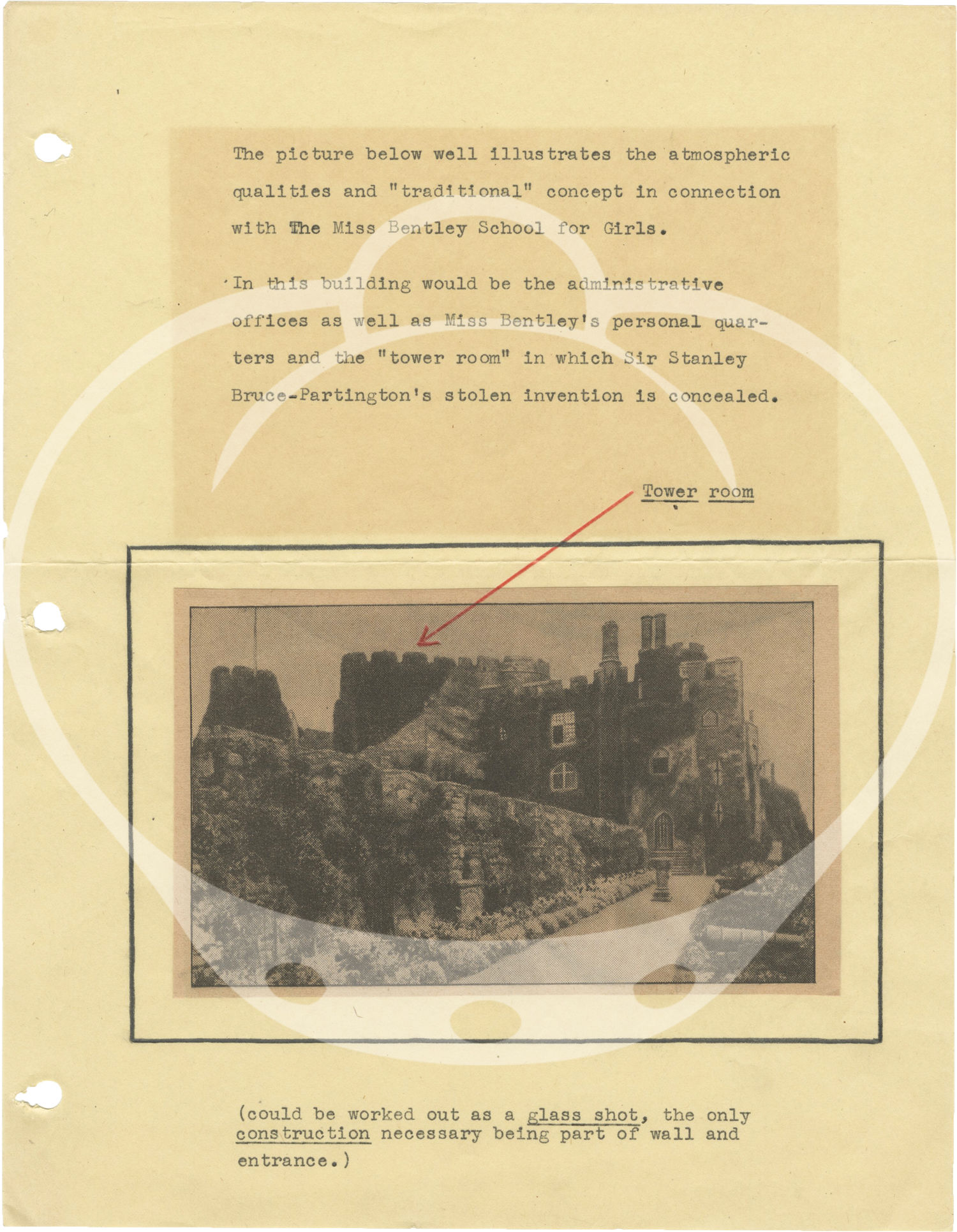 Third is a Draft script, under the working title "Sherlock Holmes Fights Back," with name of screenwriter Edmund L. Hartmann on front wrapper. Title page credits to "Additional Changes by Edmund L. Hartmann," and screenwriters Scott Darling and Edward T. Lowe, dated May 22, 1942. Carbon typescript, with mimeograph duplication revision pages. Bound in, preceding script, is a page describing concept for "The Miss Bently School for Girls," with photograph affixed, illustrating concept. Annotations in red and graphite manuscript pencil throughout, noting dialogue, locations, shots, characters, as well as strikes and dates.
