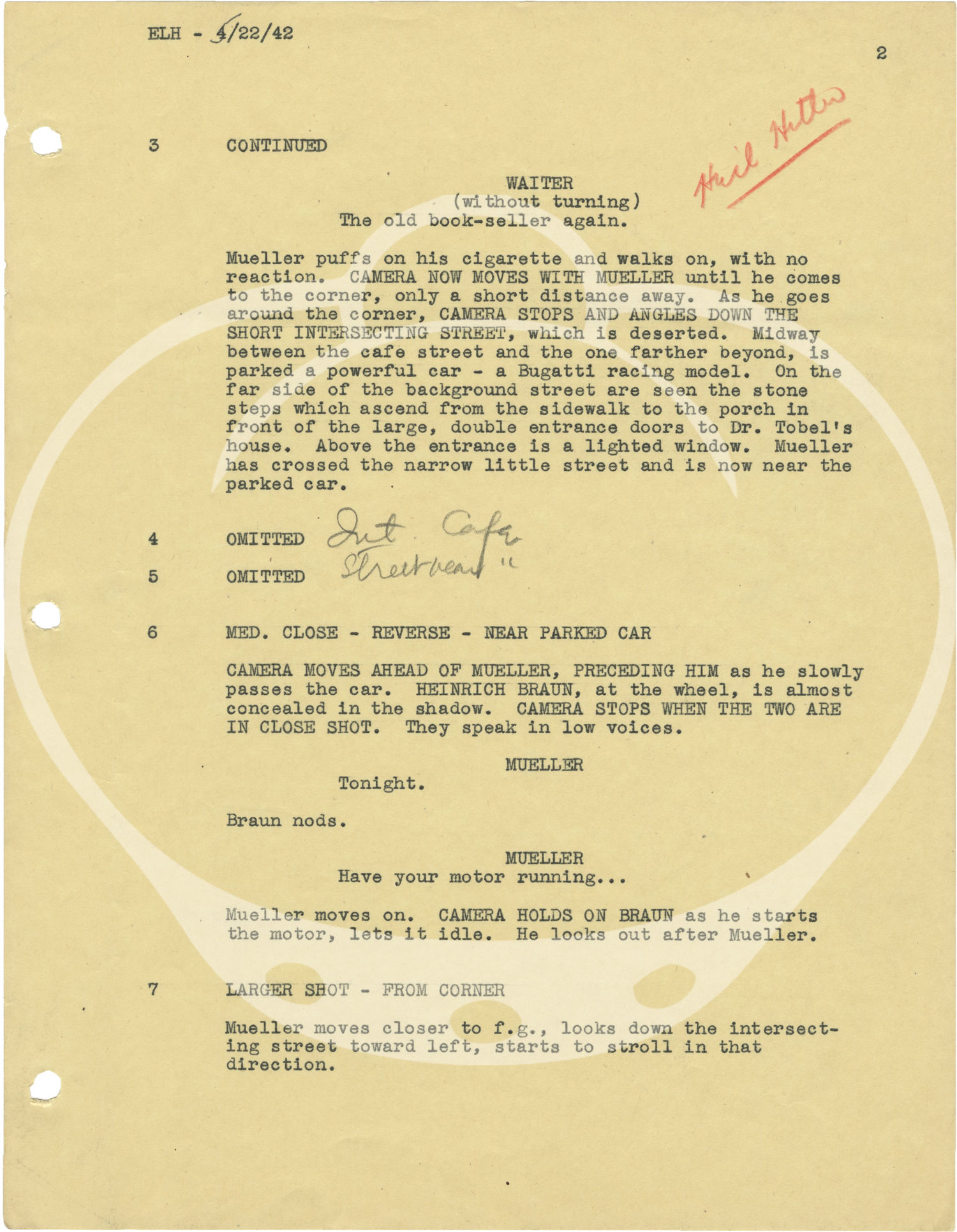 Lastly, a Post-production Dialogue and Contitnuity script, dated August 6, 1942, with single annotation in manuscript ink on front wrapper.
