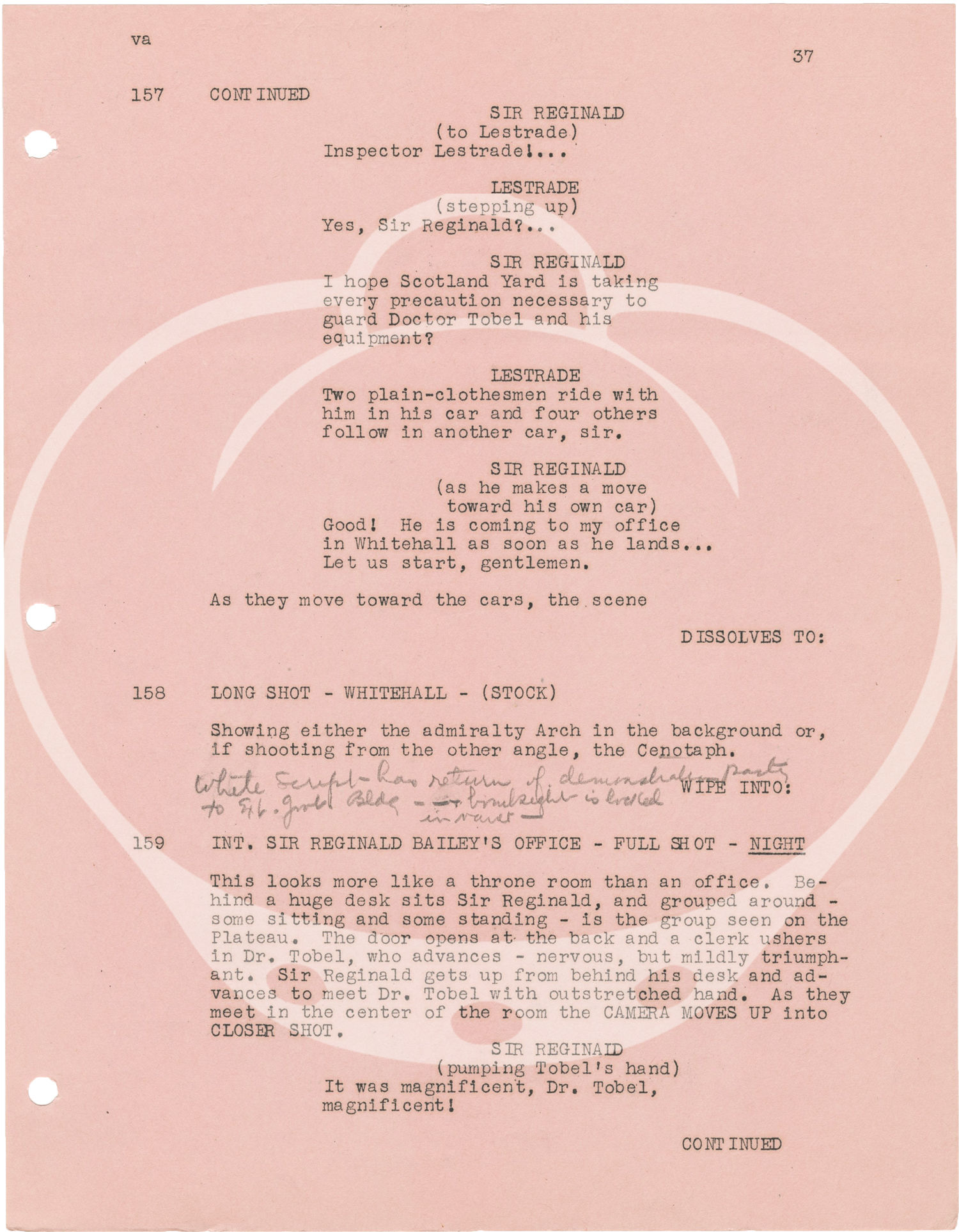 Gray titled wrappers, with credits for screenwriter Edmund L. Hartmann. Title page present, dated May 22, 1942, with credits for Additional Chages by screenwriter Edmund L. Hartmann, screenwriters Scott Darling and Edwart T. Lowe and author Sir Arthur Conan Doyle. 107 leaves, with last page of text numbered 100. Carbon typescript with mimeograph duplication revision pages, rectos only, with pink revision pages throughout, undated. Pages Near Fine, wrapper Very Good with large closed tear to front wrapper and chipping and closed tears to extremities, bound with three gold brads.