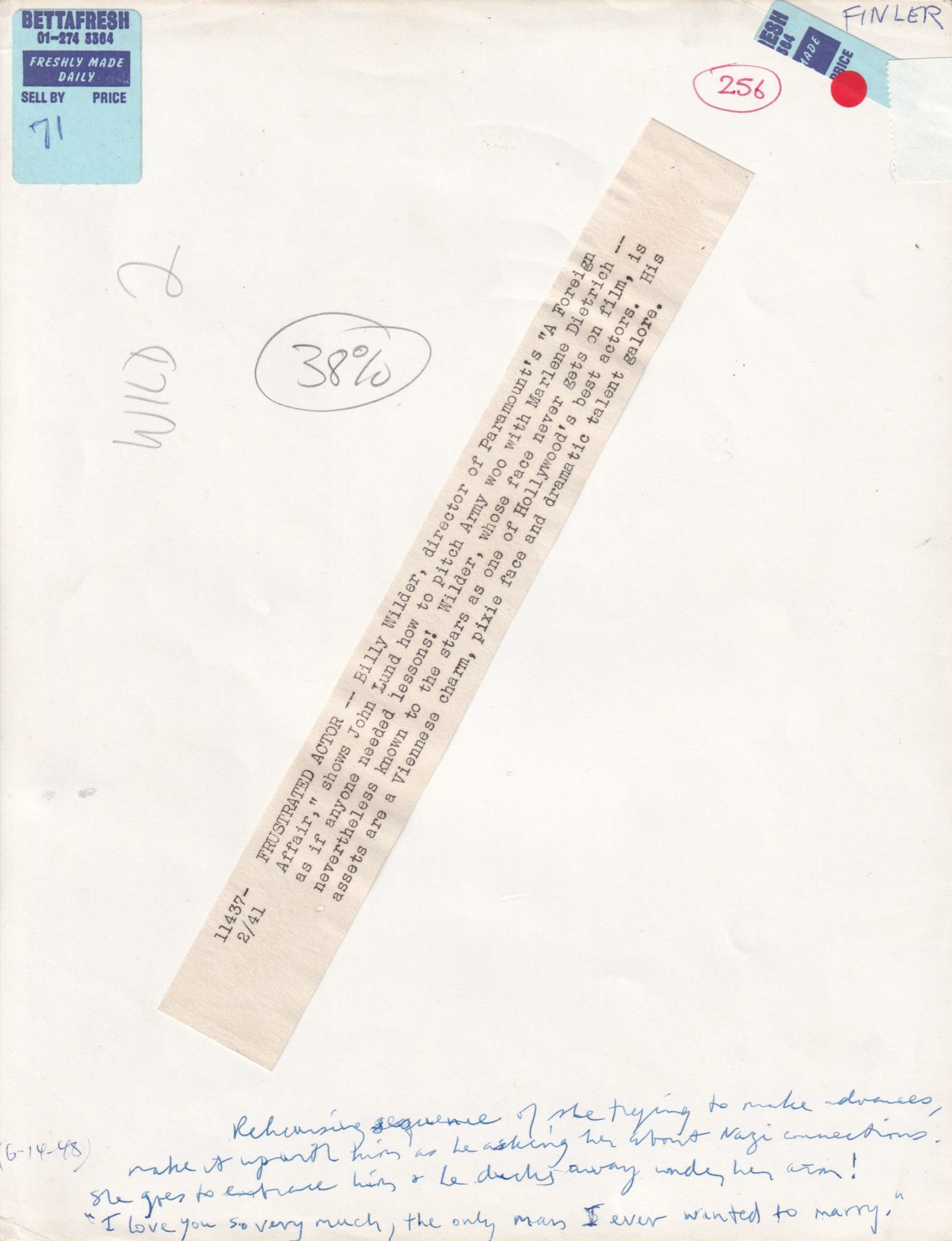 Los Angeles: Paramount Pictures, 1948. Vintage studio still photograph from the 1948 film, showing director Billy Wilder demonstrating how to embrace actress Marlene Dietrich, with actor John Lund looking on in the background. With a printed mimeo snipe affixed to the verso, along with several manuscript annotations regarding layout.