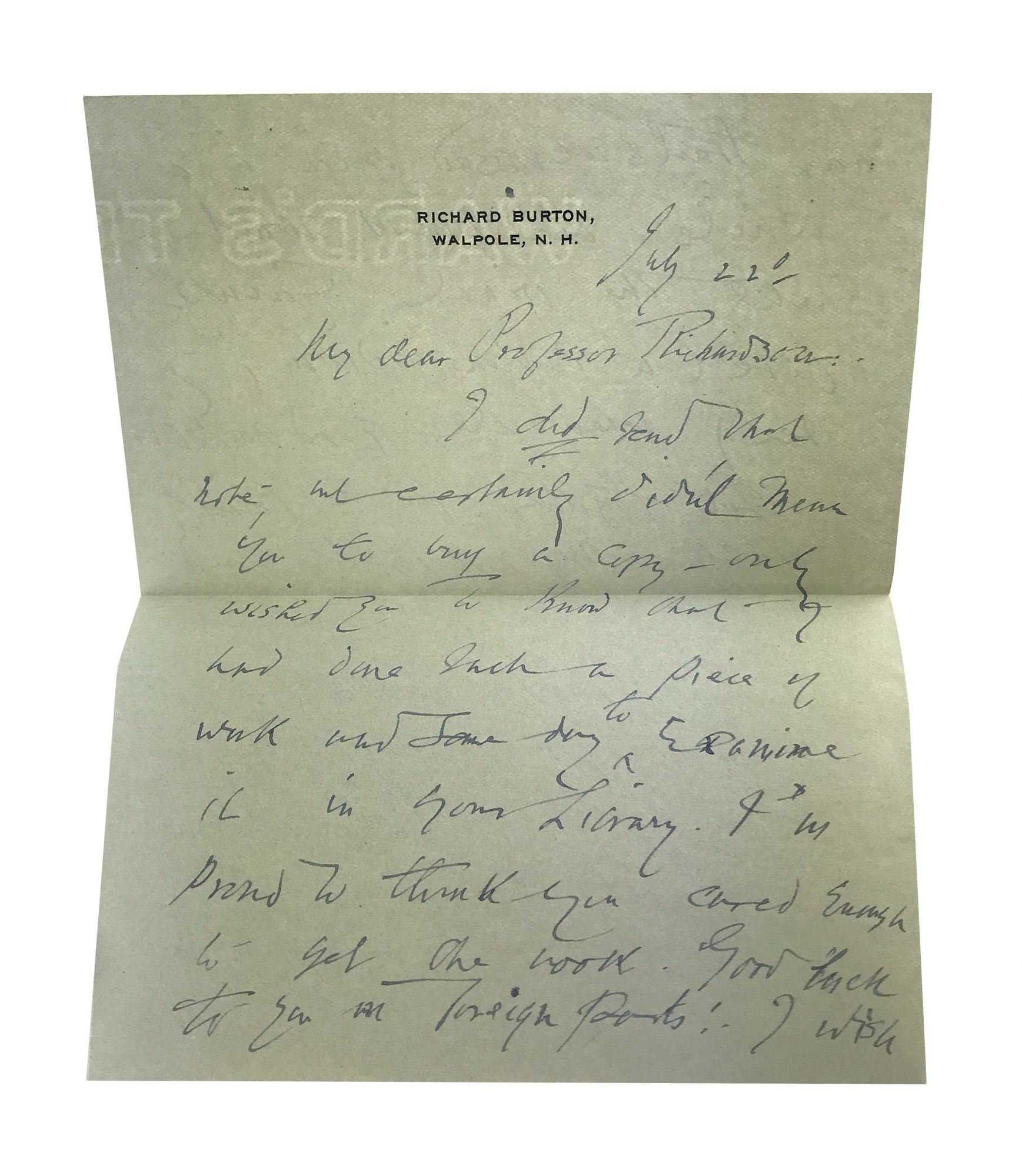 New York: Henry Holt and Company, 1906. Near Fine. New York: Henry Holt and Company, 1906. First Edition. Octavo; publisher's grey decorative cloth stamped in yellow and dark blue; [2],117,[1],[4](ads)pp. Corners bumped, else a Near Fine copy. Post-marked envelope dated 1908 tipped to front pastedown and containing 1.5pp. autograph letter signed by the author, addressed to a Professor Charles Richardson of Dartmouth College, admonishing Richardson for purchasing a copy of the book.