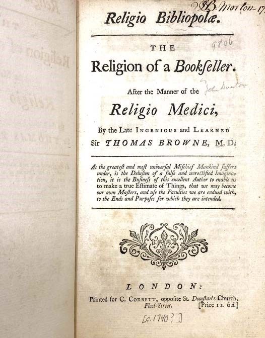 London: C. Corbett, 1740. Reissue. Hard Cover. Very Good/No Jacket. No publication date, circa 1740 according to ESTC T110556. Rebound in green cloth with gilt titles and new end sheets and flyleaves by Mutual Library Bindery, Inc. in 1959 (their stamp on rear flyleaf). It appears the work, which was probably initially issued in wrappers, had already been rebound once with new marbled endpapers, which have been retained and appear inside the new flyleaves. Ink name on title page, minimal pencil marginalia. 2, [1]-84 pp., with numerous blank leaves bound in following text. Originally published under the name Benjamin Bridgewater in 1691, but attributed to John Dunton, who collaborated with Bridgewater on the work. Among the first of a number of works imitating Thomas Browne's popular Religio Medici. Dunton also wrote several other works, but is most notable for his reputation as a rather unscrupulous bookseller, and for publishing the first major popular periodical in England (The Athenian Mercury, 1690-1697), as well as the first periodical (The Ladies' Mercury, 1693) and the first dictionary (The Ladies' Dictionary, 1694) designed specifically for women. Religio Bibliopolae provides some important accounts of the book trade and publishing during Dunton's lifetime.