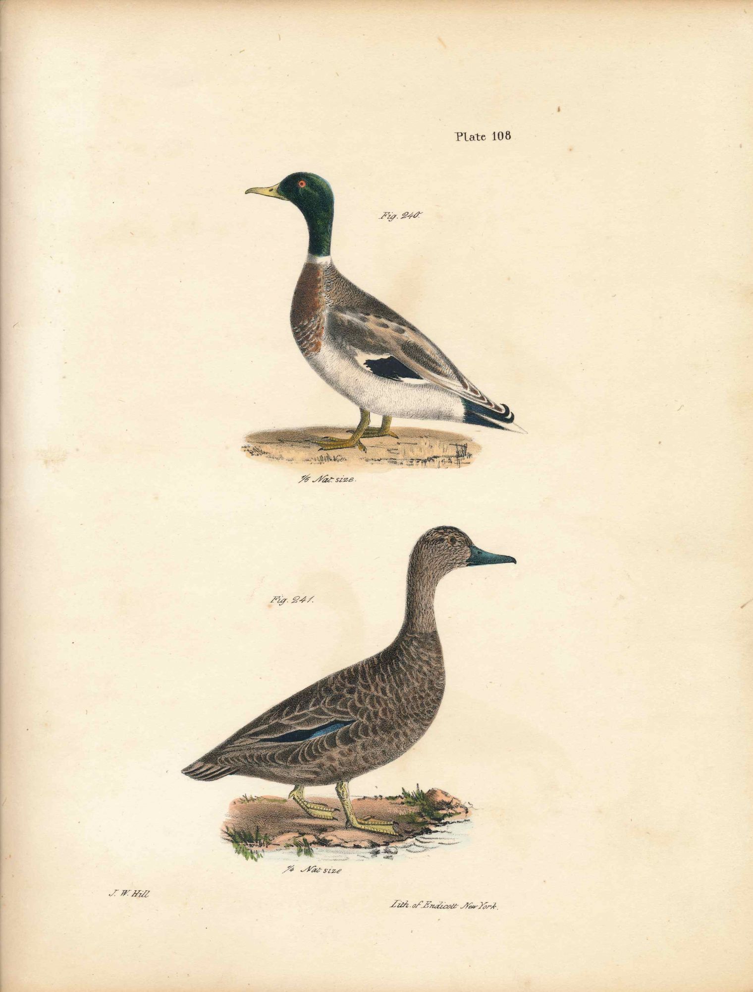 Albany: Carroll and Cook, 1844. Very Good. Hand colored lithograph of two birds - Ducks - Mallards (Male and Female). Minor browning to edges. Light foxing. Size: 11.25 x 9 inches. Print/092820.