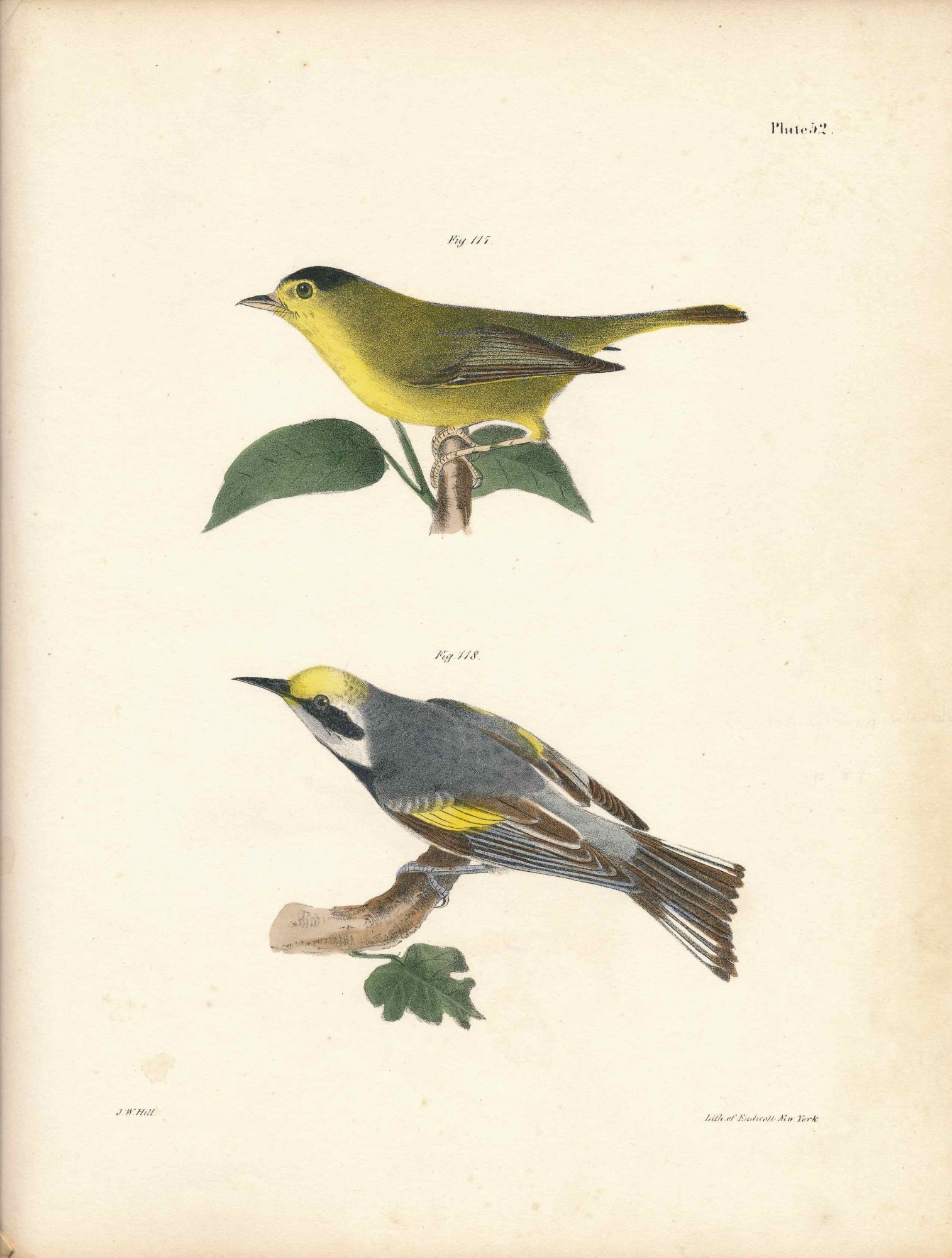 Albany: Carroll and Cook, 1844. Very Good. Hand colored lithograph of two birds - (Warblers). Minor browning to edges. Light foxing. Size: 11.25 x 9 inches. Print/092820.