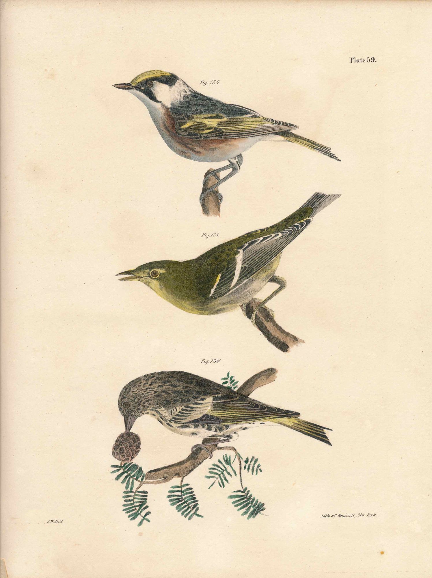 Albany: Carroll and Cook, 1844. Very Good. Hand colored lithograph of three birds - (Two Warblers and a Finch). Minor browning to edges. Light foxing. Size: 11.25 x 9 inches. Print/092820.