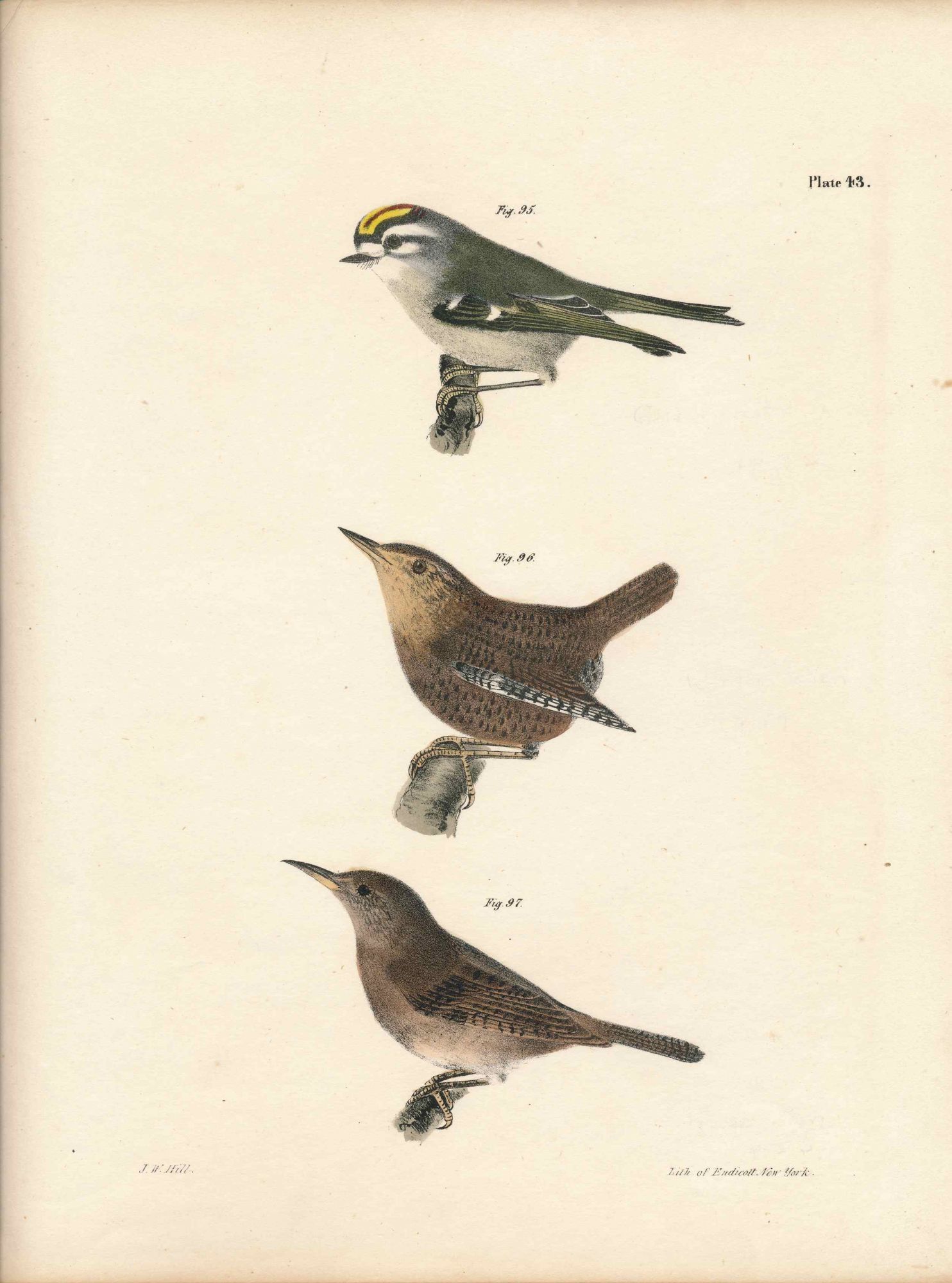 Albany: Carroll and Cook, 1844. Very Good. Hand colored lithograph of three birds - (Golden-Crested Kinglet, Winter Wren, and House Wren). Minor browning to edges. Light foxing. Size: 11.25 x 9 inches. Print/092820.