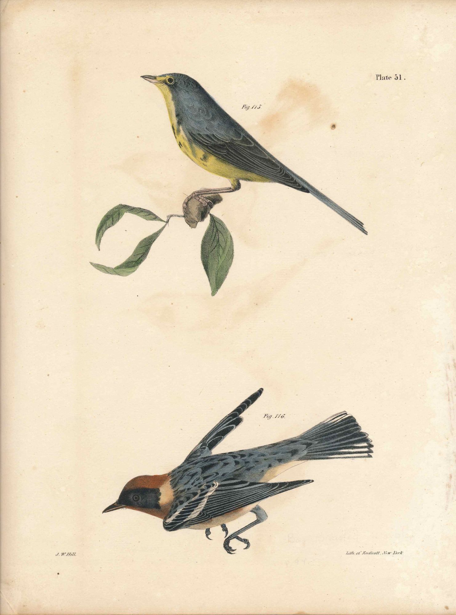 Albany: Carroll and Cook, 1844. Very Good. Hand colored lithograph of two birds - (Warblers). Minor browning to edges. Light foxing. Slight offsetting from another print. Minor soiling to edge. Size: 11.25 x 9 inches. Print/092820.