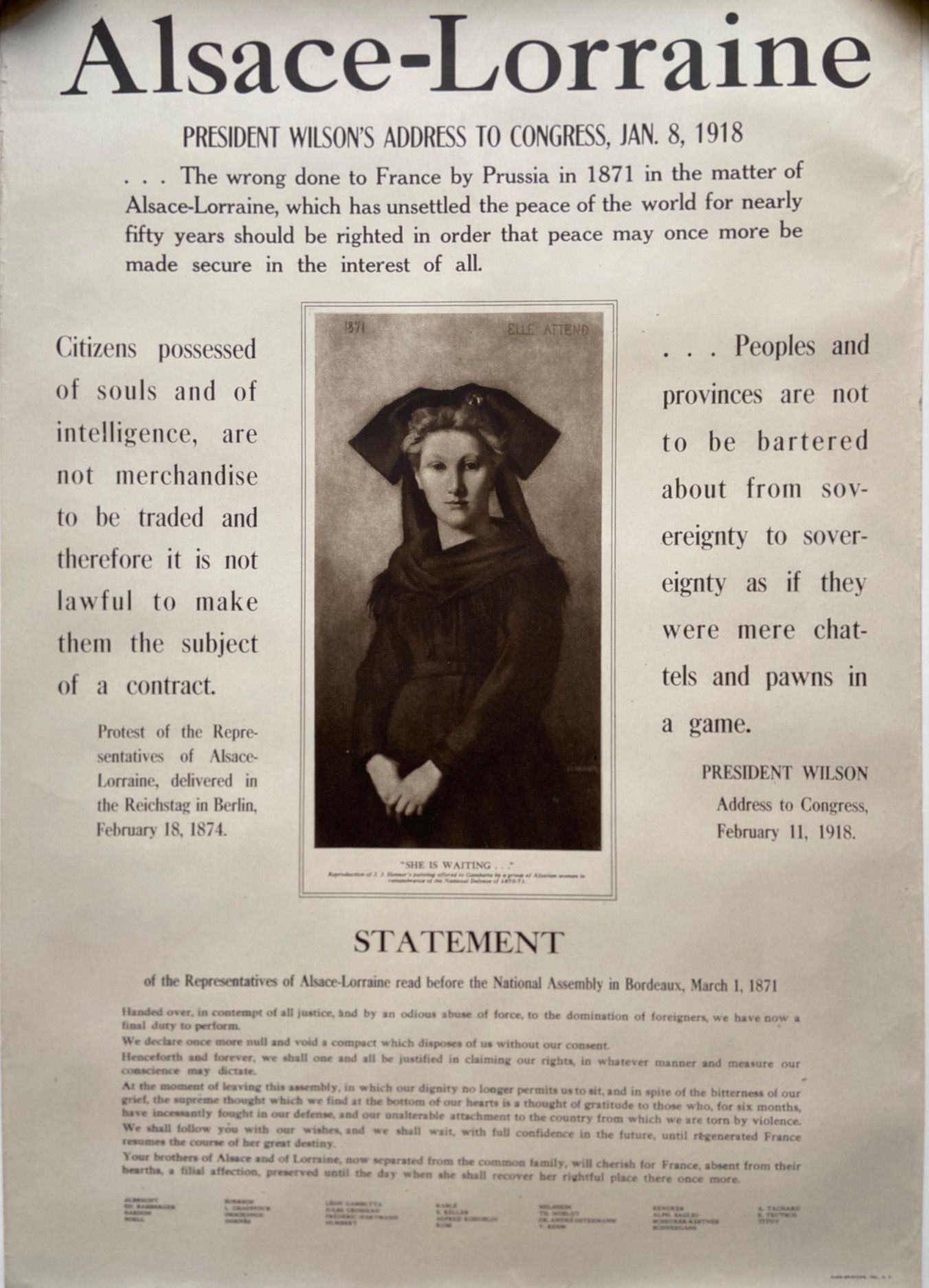 World War I propaganda poster featuring a reproduction of an 1871 painting of an Alsatian woman by J.J. Henner titled "She Is Waiting... " Surrounding the portrait is the text from President Woodrow Wilson's 1918 address to Congress, as well as statements of the representatives of Alsace-Lorraine read in 1871 and 1874, before the National Assembly and in the Reichstag, respectively. Scarce.