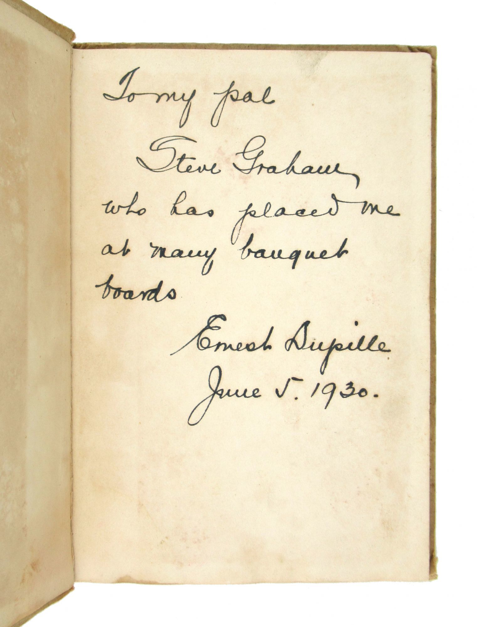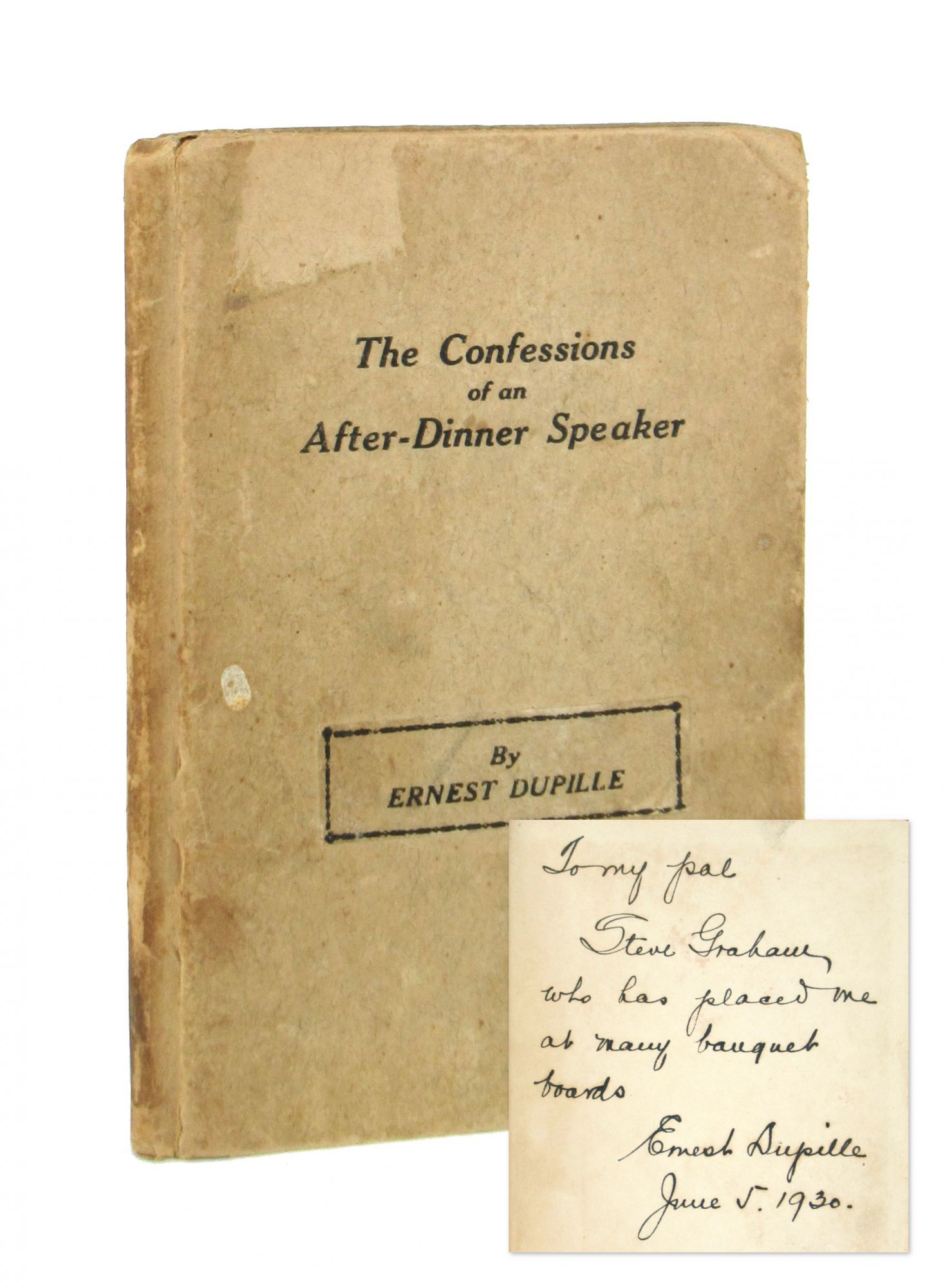 Philadelphia: Mayfair Publishing Co, 1930. Good+. Philadelphia: Mayfair Publishing Co., [1930]. First Edition. 12mo; publisher's printed paper-covered boards; 62pp.; illus. throughout. Extremities bumped and rubbed with some exposure at corners, general light soil, paper flaw to upper cover from previously removed tape; overall Good or better, internally fresh and near fine. Inscribed and signed by the author on front free endpaper: "To my pal / Steve Graham / who has placed me at many banquet boards / Ernest Dupille June 5, 1930."