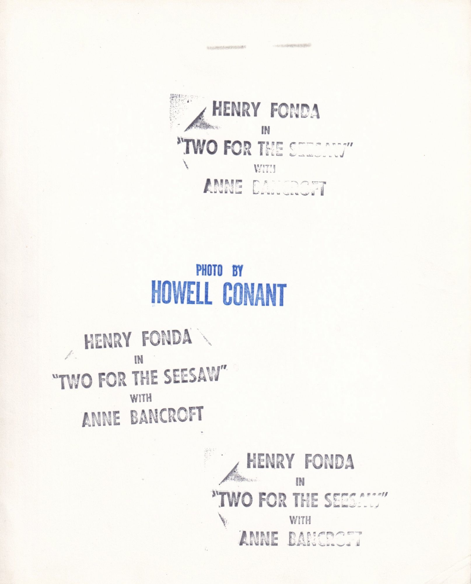 N.p.: N.p., 1958. Vintage double weight narrow margin matte finish promotional press photograph of Henry Fonda and Anne Bancroft from the 1958 play, by photographer Howell Conant. Three "Two for the Seesaw," and one "Photo by Howell Conant" stamps on verso.