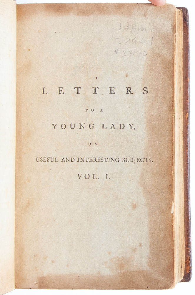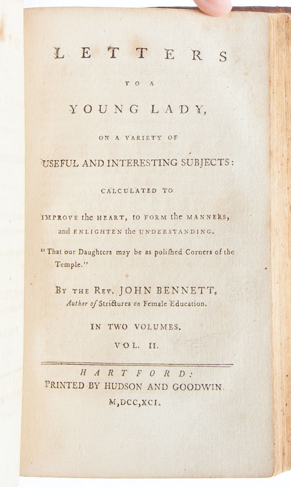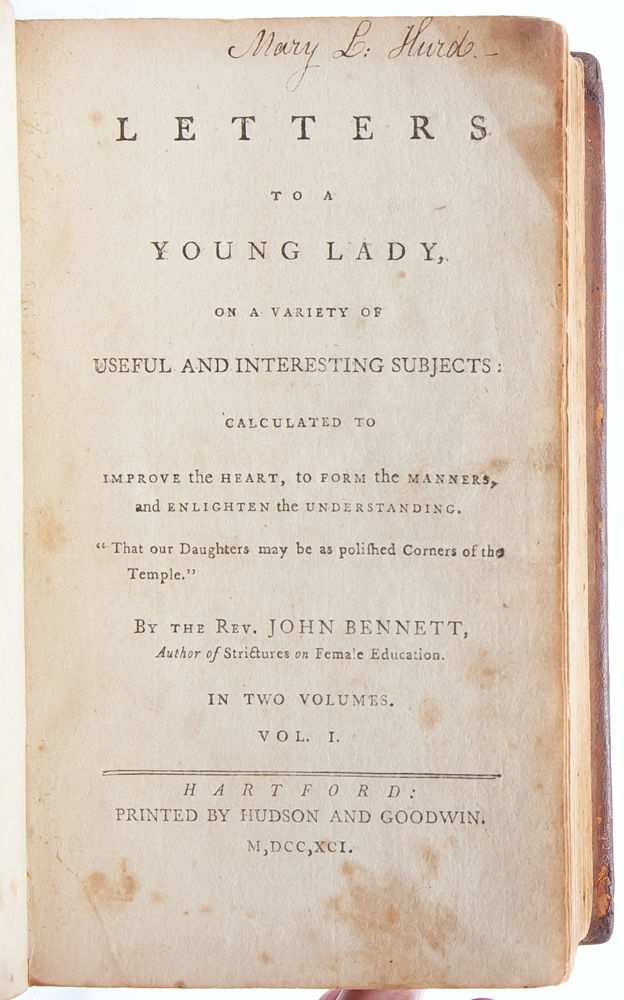 The American seminary movement, establishing rigorous institutions for women's higher education, would not begin until 1821. Three decades before, only 15 years into the founding of the Republic, the American release of John Bennett's Letters to a Young Lady helped initiate a conversation about how the new nation would approach the education of its girls. Epistolary in form, the book contains a series of letters from a gentleman to a young woman Lucy after the loss of her mother, to whose care her education would have fallen. The gentleman acknowledges that she likely has plenty of guidance in religion, but that more worldly knowledge is more difficult for women to acquire because of the lack of structures provided to them. Much of what they learn is derived, problematically, from their society: "The education of women is unfortunately directed rather to such accomplishments as will enable them to make noise and sparkle in the world, than to those qualities which might ensure their comfort here," Bennett writes. Boarding schools reinforce this problem, he claims, taking away domestic context and failing to ground their pupils in piety, virtue, and intelligence. Across his letters, he directs Lucy to learn more substantial lessons from the works of the humanists: "The immortal Locke analysed the powers of the human understanding," he tells her at one point. “Mason on self-knowledge is the anatomist of the heart. If you would see yourself in your true colors, you must daily be conversant with these books." Indeed, throughout he guides her on the types of books to read (Locke and Cicero) and those to avoid (Sterne) to take her education into her own hands. One year later, Bennett's more structured Strictures on Female Education would follow up the present title; and it would push readers to see that women could not take on sole responsibility for their learning, but should be provided rigorous, standardized schools designed for that end.