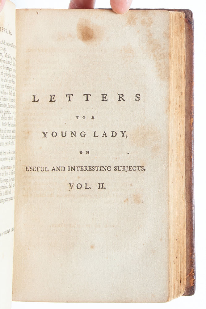 Hartford [CT]: Hudson & Goodwin, 1791. First American edition. Two volumes bound in one. Contemporary calf rebacked to style with morocco spine label. A tight, square copy. Contemporary ownership signature of Mary L. Hurd to header of first title page; pencil equations to the rear pastedown. Light scattered foxing and toning throughout, as is common in American imprints of this period; closed tear to the inner margin of 17-18 not affecting text. In all, pleasing and unmarked. Collating xii, 142; [2], 155, [1]: complete, including half and full titles for both. A scarce and early work on women's education, predating the American release of Bennett's Strictures on Female Education by one year, it was one of the earliest and most progressive titles on the subject to be printed in the young Republic. ESTC reports 8 institutions with copies worldwide (and only 2 of the London first edition of 1789). It appears only twice in the modern auction record, in 1986 and 2002. The present is the only copy on the market.