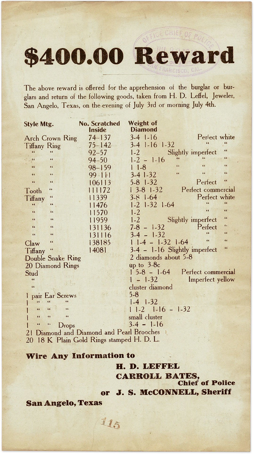 1900. San Angelo, Texas, c. 1900. 10" x 5-1/2. San Angelo, Texas, c. 1900. 10" x 5-1/2" Texas Reward Poster Seeking the Capture of Jewelry Thieves and the Recovery of Stolen Jewelry [Broadside]. [Theft]. [San Angelo, Texas]. $400.00 Reward. The Above Reward is Offered for the Apprehension of the Burglar or Burglars and Return of the Following Goods, Taken from H.D. Leffel, Jeweler, San Angelo, Texas, On the Evening of July 3rd or Morning July 4th. San Angelo, TX: S.n., c.1901. 10" x 5-1/2" broadside, main text in parallel columns below headline. Light toning and soiling, faint fold lines, a few minor creases, faint stamp of the San Francisco chief of Police to head, another stamp reading "115" to foot. $450. * Signed in type by H.D. Leffel, Carroll Bates, Chief of Police, and J.S. McConnell, Sheriff, this wanted poster lists the stolen items and their identification numbers. Some of the stolen items were produced by Tiffany. The San Francisco stamp shows that San Angelo Police Department established a broad search area for this case.