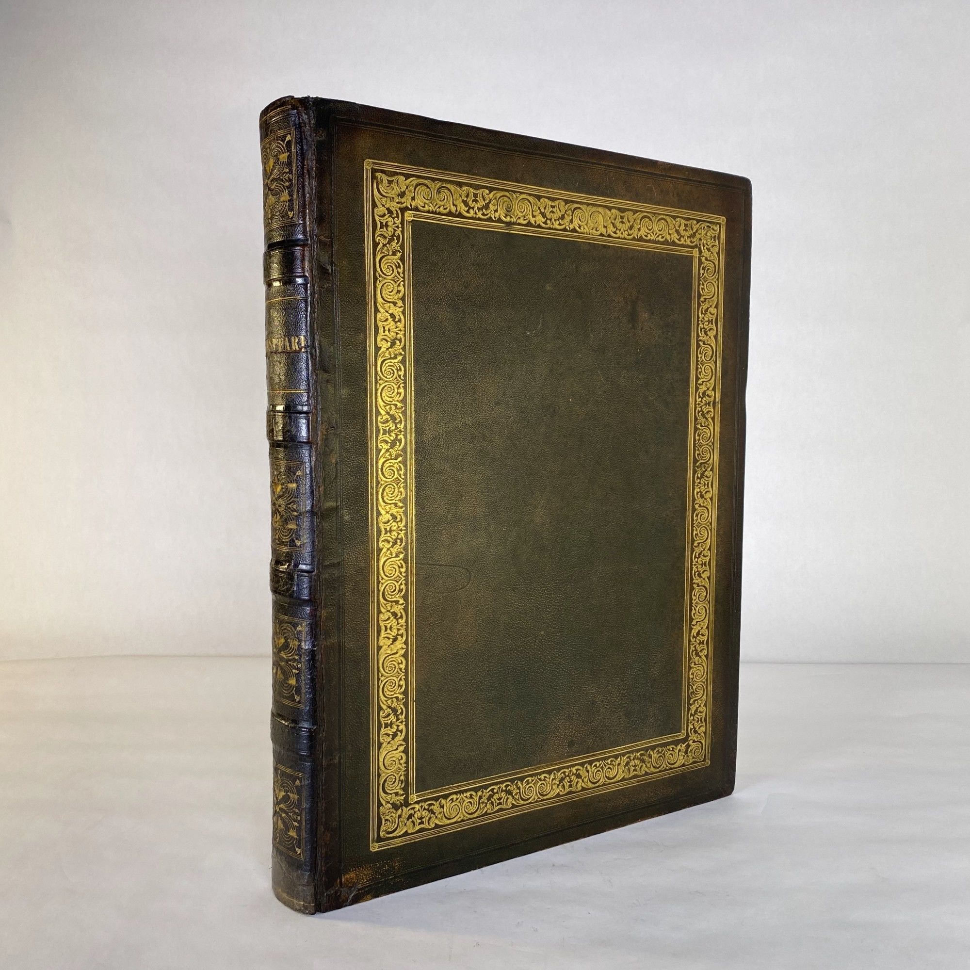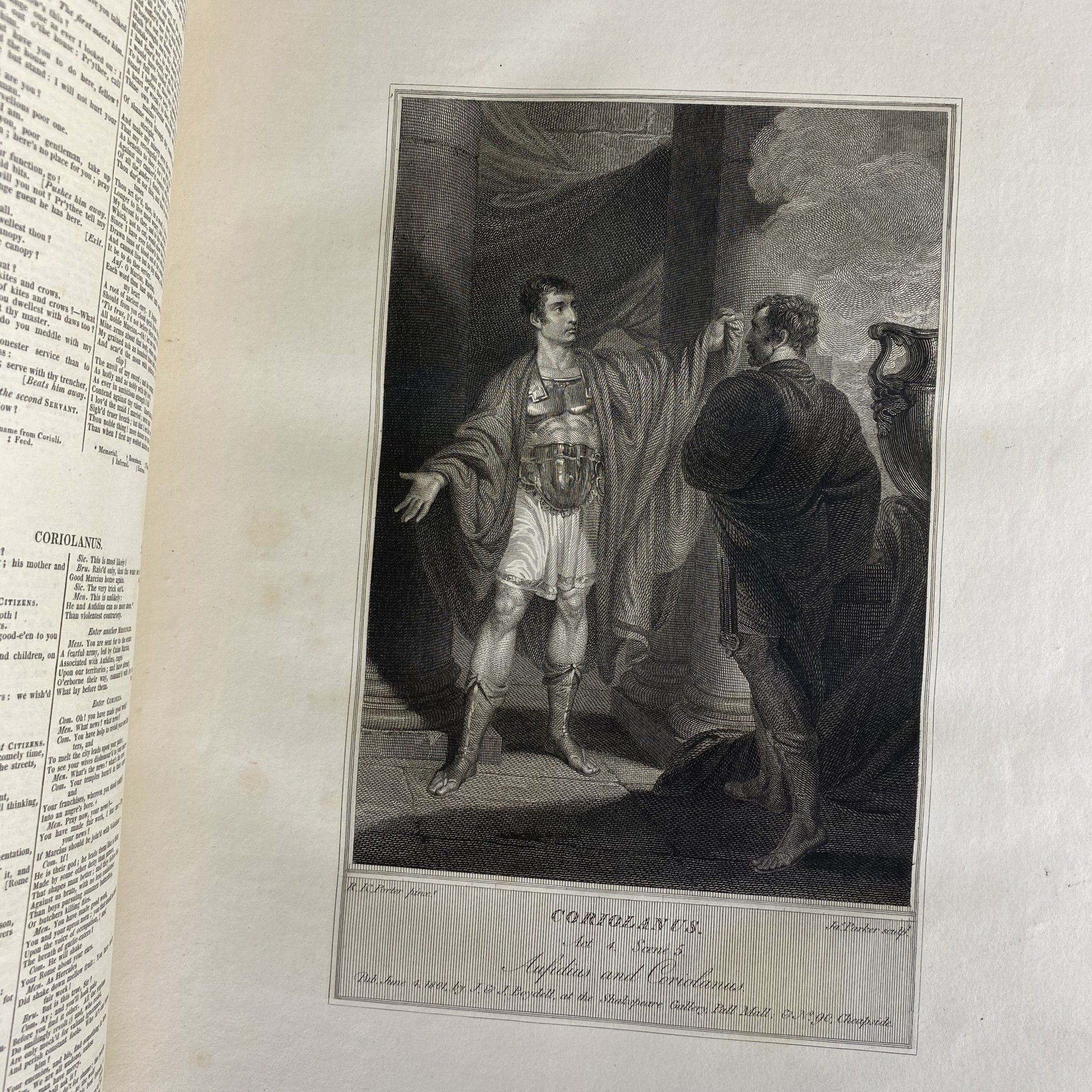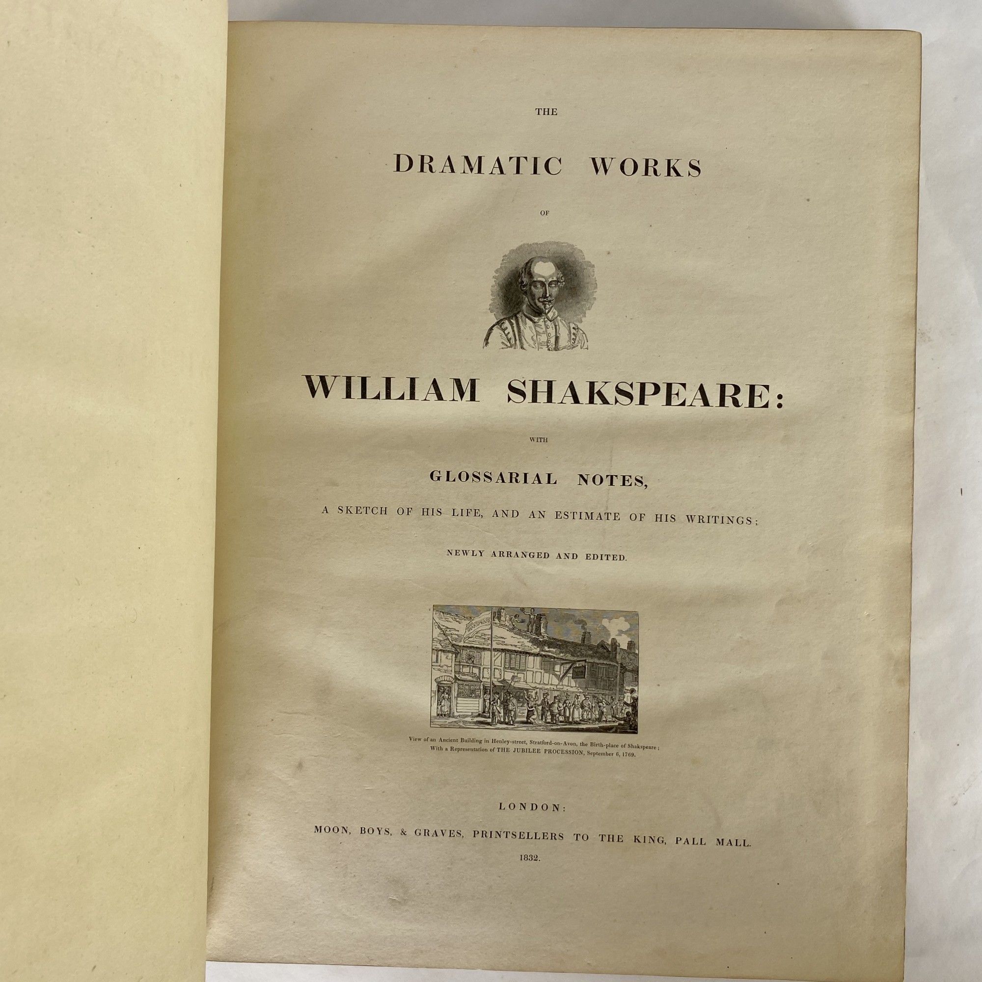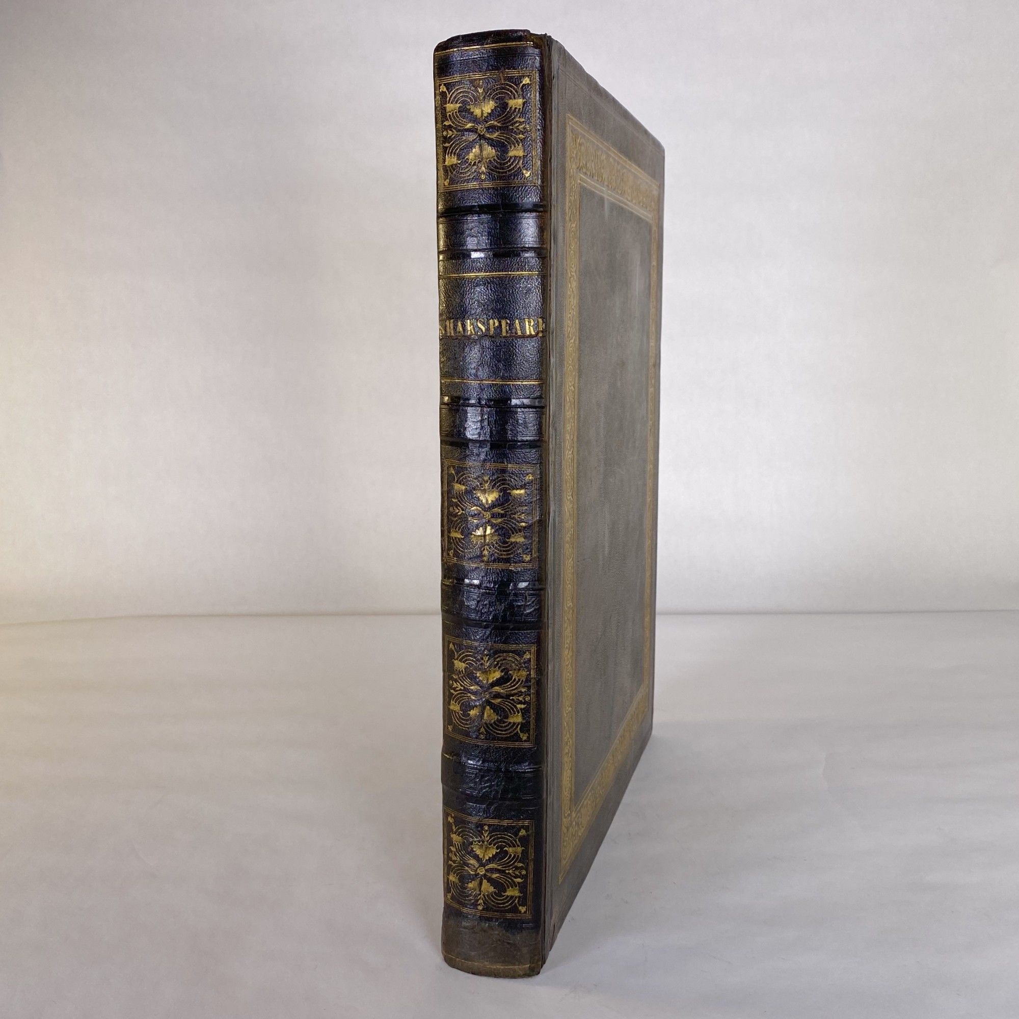 London: Moon, Boys, & Graves, 1832. Full Leather. Very Good binding. From the Preface: "The present collection of Shakspeare's Plays differs in arrangement from any that has hitherto been published. The Tragedies, Comedies and Historical Plays are divided; and in each division, the consecutive order of the pieces has reference to the country in which the action is laid, or to the epoch at which it is supposed to have taken place". Certainly a unique approach, coupled with printing of all of the plays as pages octavo in size and arranged consecutively, four on each folio page. Illustrated with 100 engraved plates, including two engraved portraits of Shakespeare. The Moon, Boys & Graves concern obtained the plates from the Boydell Shakespeare Gallery and the dramatic images are "depicted from the powerful pencils of Reynolds, Opie, Northcote, Smirke, Stothard, Westall, Howard, Romney, and others" [Preface]. There are as well numerous text illustrations grouped in 8vo. size. Most of the plates have some degree of foxing, mostly (though not always) limited to the borders. One of the plates illustrating Julius Caesar has a distinct but not strong tide-line. Bound in brown morocco with elaborate gilt borders to the boards, turn-ins with gilt dentelles, all edges gilt, raised bands with gilt decorations. This is a very discreetly rebacked copy with nearly the entirety of the original spine laid down. An attractive ex-libris is on the pastedown. Very Good binding.