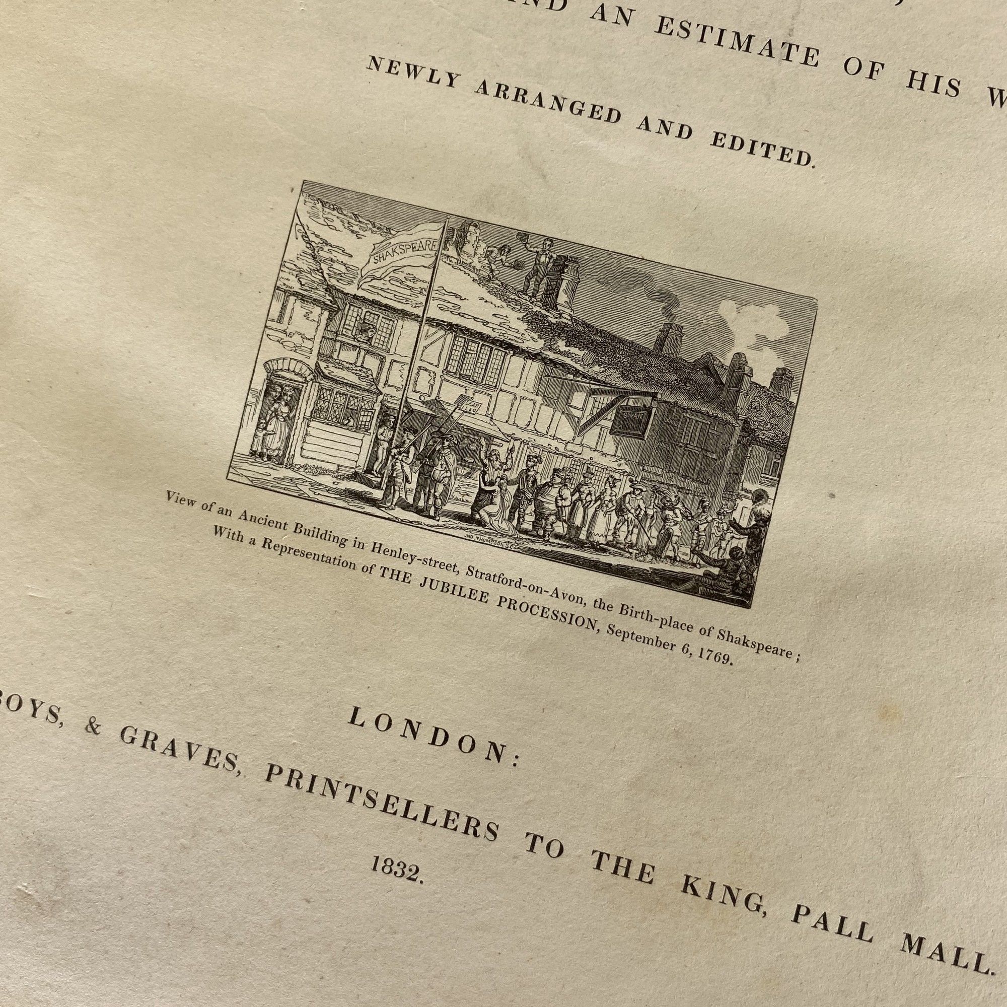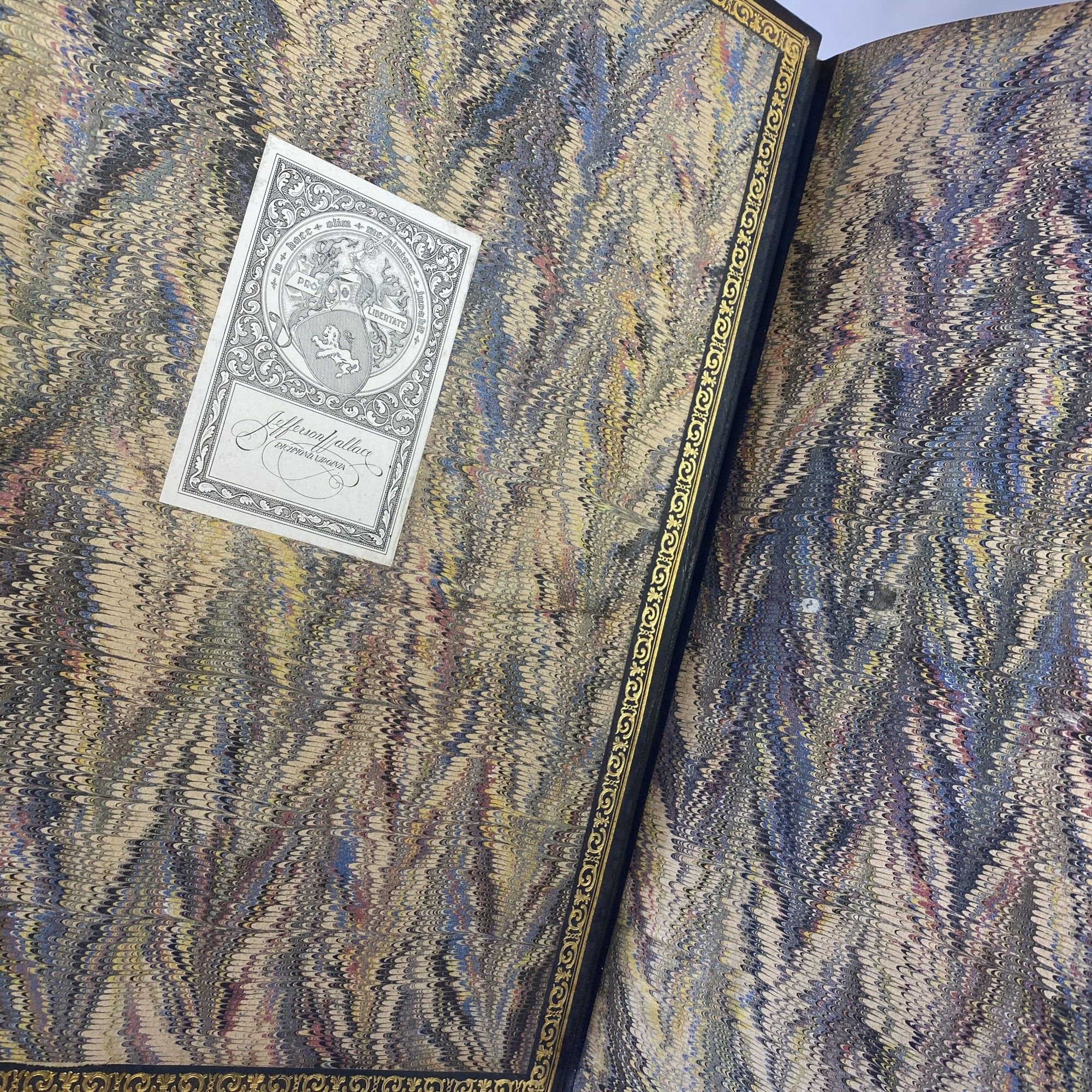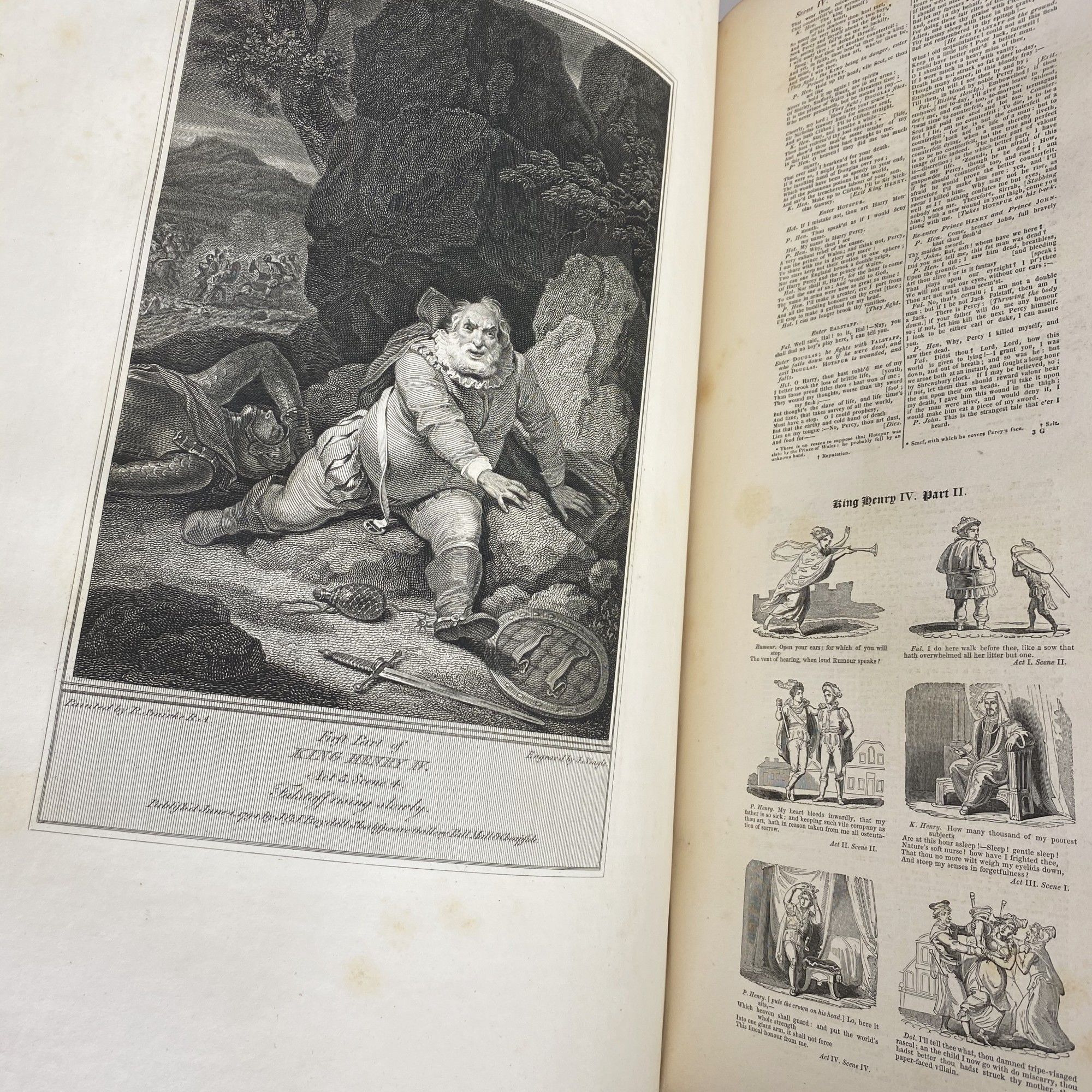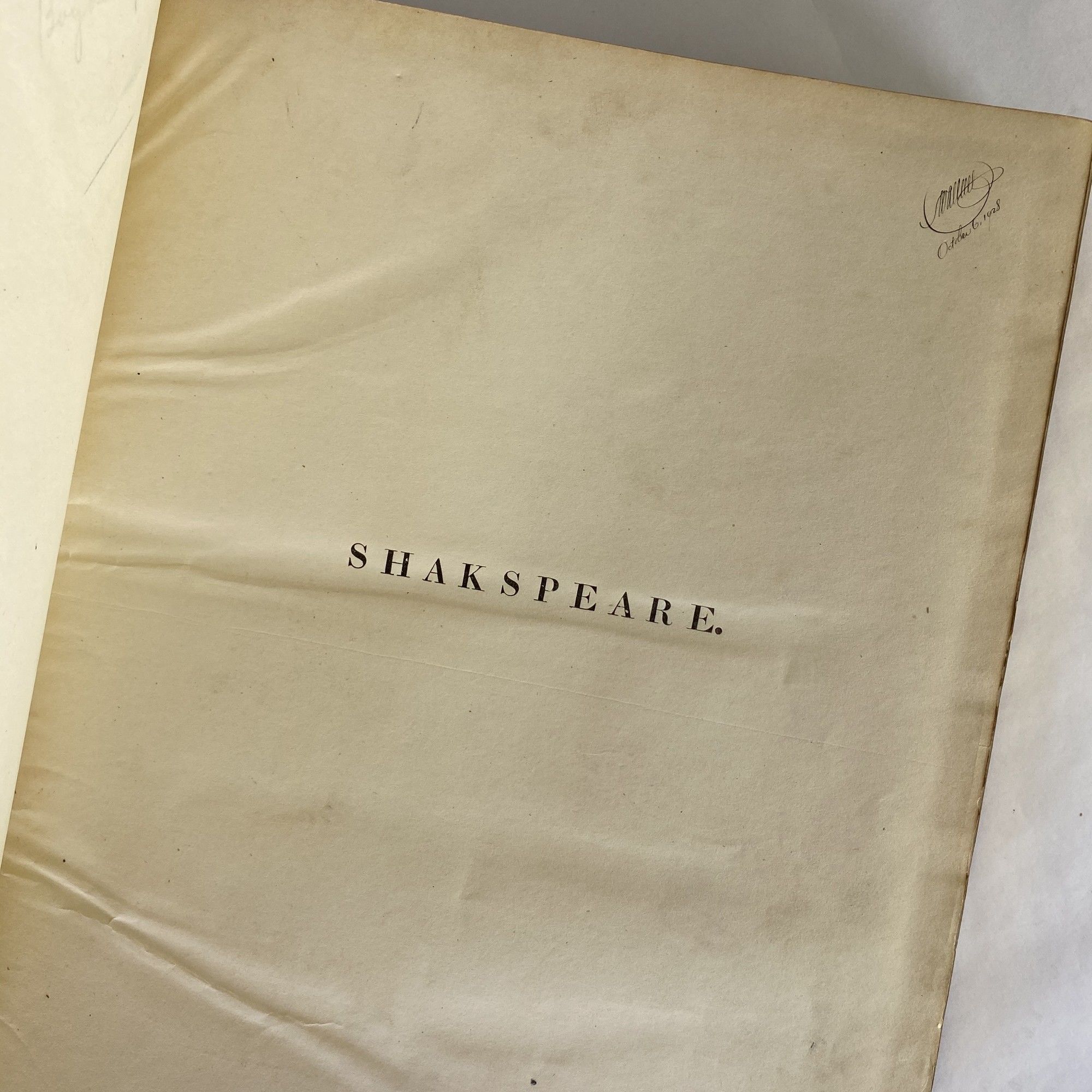 London: Moon, Boys, & Graves, 1832. Full Leather. Very Good binding. From the Preface: "The present collection of Shakspeare's Plays differs in arrangement from any that has hitherto been published. The Tragedies, Comedies and Historical Plays are divided; and in each division, the consecutive order of the pieces has reference to the country in which the action is laid, or to the epoch at which it is supposed to have taken place". Certainly a unique approach, coupled with printing of all of the plays as pages octavo in size and arranged consecutively, four on each folio page. Illustrated with 100 engraved plates, including two engraved portraits of Shakespeare. The Moon, Boys & Graves concern obtained the plates from the Boydell Shakespeare Gallery and the dramatic images are "depicted from the powerful pencils of Reynolds, Opie, Northcote, Smirke, Stothard, Westall, Howard, Romney, and others" [Preface]. There are as well numerous text illustrations grouped in 8vo. size. Most of the plates have some degree of foxing, mostly (though not always) limited to the borders. One of the plates illustrating Julius Caesar has a distinct but not strong tide-line. Bound in brown morocco with elaborate gilt borders to the boards, turn-ins with gilt dentelles, all edges gilt, raised bands with gilt decorations. This is a very discreetly rebacked copy with nearly the entirety of the original spine laid down. An attractive ex-libris is on the pastedown. Very Good binding.