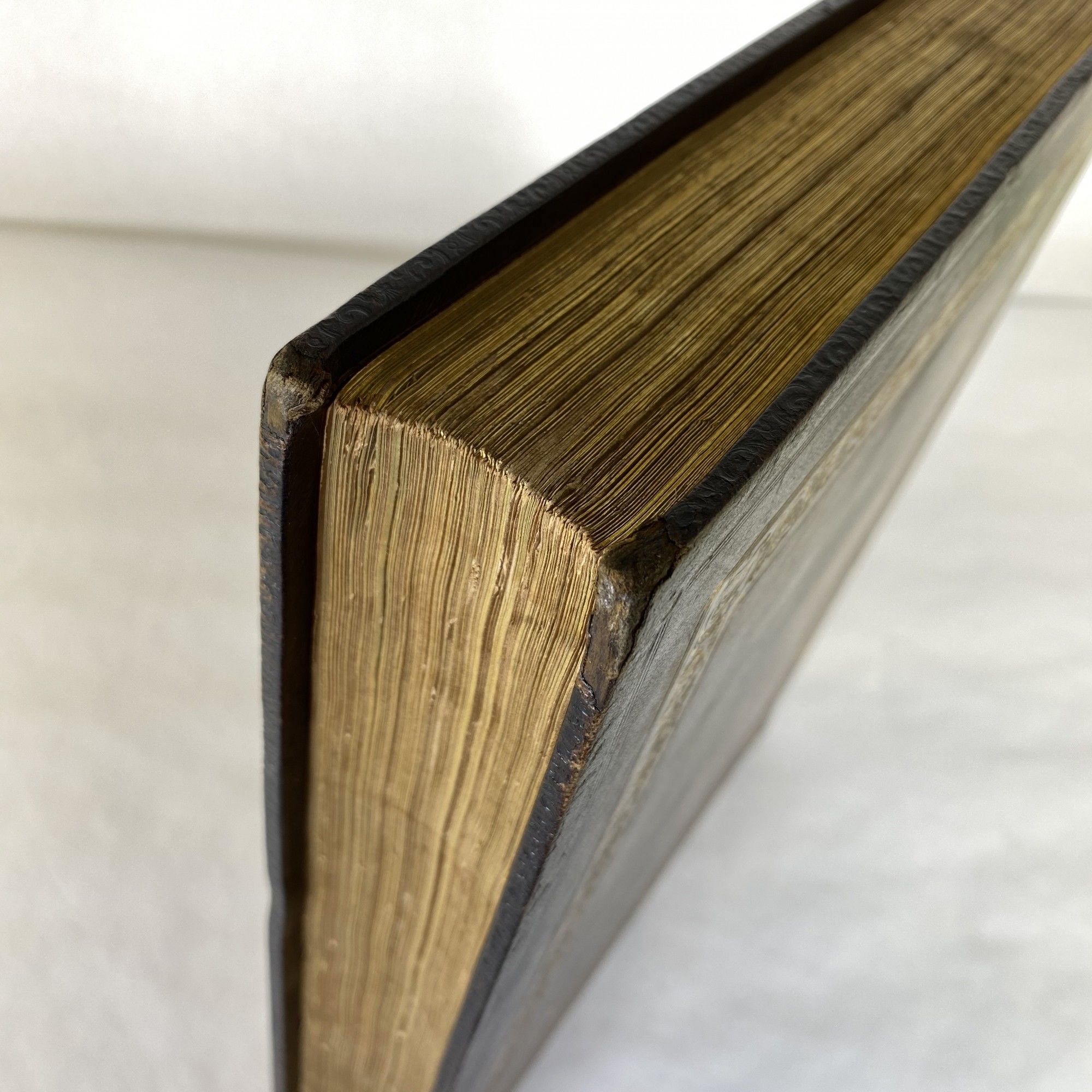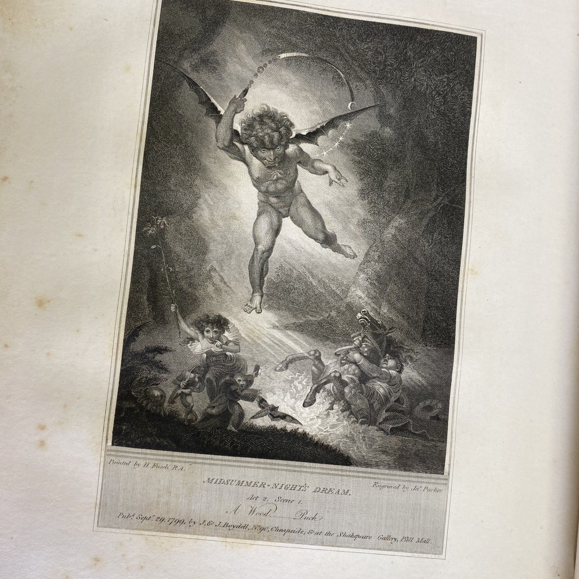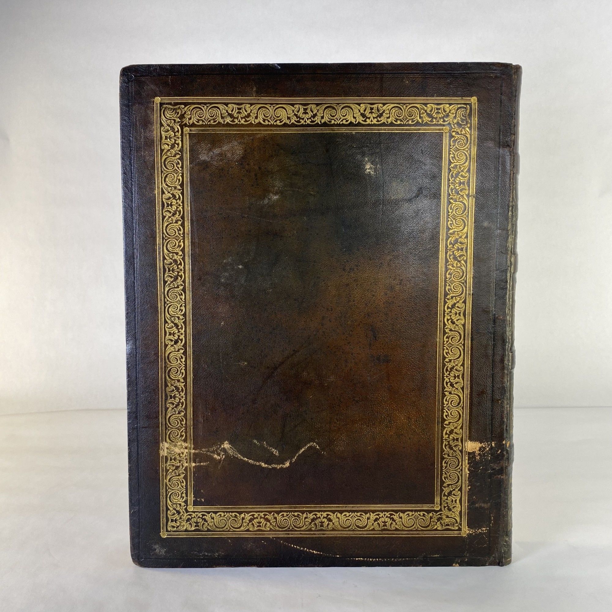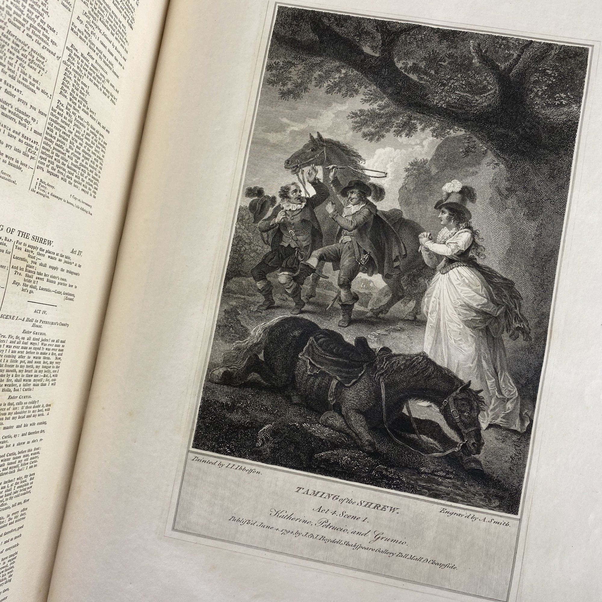 London: Moon, Boys, & Graves, 1832. Full Leather. Very Good binding. From the Preface: "The present collection of Shakspeare's Plays differs in arrangement from any that has hitherto been published. The Tragedies, Comedies and Historical Plays are divided; and in each division, the consecutive order of the pieces has reference to the country in which the action is laid, or to the epoch at which it is supposed to have taken place". Certainly a unique approach, coupled with printing of all of the plays as pages octavo in size and arranged consecutively, four on each folio page. Illustrated with 100 engraved plates, including two engraved portraits of Shakespeare. The Moon, Boys & Graves concern obtained the plates from the Boydell Shakespeare Gallery and the dramatic images are "depicted from the powerful pencils of Reynolds, Opie, Northcote, Smirke, Stothard, Westall, Howard, Romney, and others" [Preface]. There are as well numerous text illustrations grouped in 8vo. size. Most of the plates have some degree of foxing, mostly (though not always) limited to the borders. One of the plates illustrating Julius Caesar has a distinct but not strong tide-line. Bound in brown morocco with elaborate gilt borders to the boards, turn-ins with gilt dentelles, all edges gilt, raised bands with gilt decorations. This is a very discreetly rebacked copy with nearly the entirety of the original spine laid down. An attractive ex-libris is on the pastedown. Very Good binding.