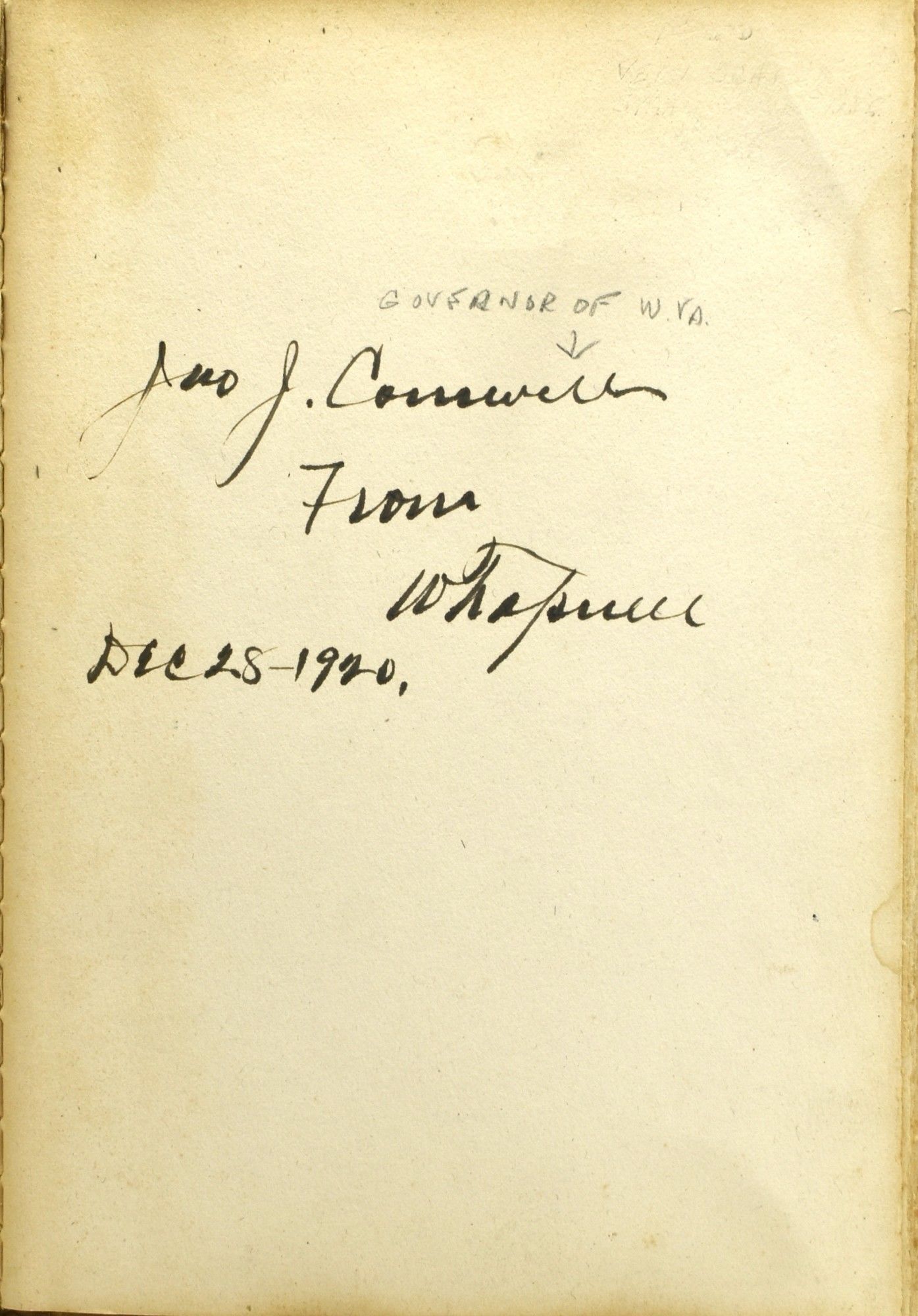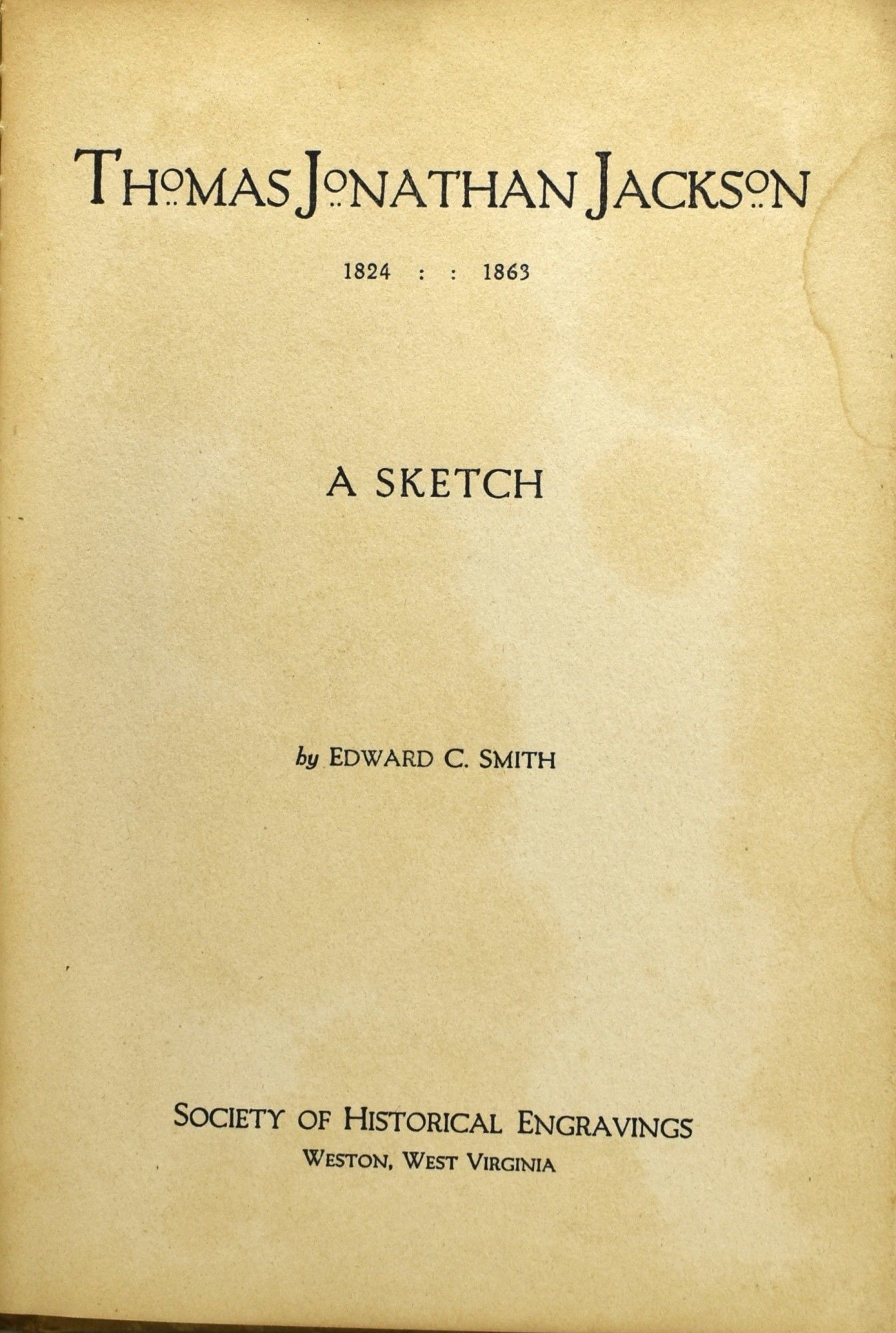 Weston, West Virginia: Society of Historical Engravings | James H. Brewster, 1920. First Edition. Hard Cover. Very Good binding. Edward C. Smith's Thomas Jonathan Jackson; A Sketch. A biography of 'Stonewall' Jackson, "For Private Distribution." Portrait frontispiece. Text bordered with gray ruling and Confederate imagery. Printed in Weston, Virginia.. ~~37 unnumbered pages, with frontispiece portrait. With an inscription from one W. Trapnell [?] to John J. Cornwell, who was at the time the Governor of West Virginia. Tan paper covered boards, with gilt facsimile signature on the front board., rather peculiarly appear to have been painted in gray (by a later hand, not by the publisher. The effect is not pleasing. Still, uncommon in commerce. Very Good binding.