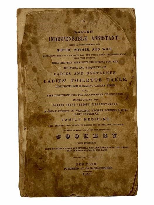 Ladies' Indispensable Assistant. Being a Companion for the Sister, Mother, and Wife Containing More Information for the Price Than Any Other Work Upon the Subject. Here Are the Very Best Directions for the Behavior and Etiquette of Ladies and Gentlemen, Ladies' Toilette Table, Directions for Managing Canary Birds; Also, Safe Directions for the Management of Children; Instructions for Ladies Under Various Circumstances; A Great Variety of Valuable Recipes, Forming a Complete System of Family Medicine. Thus Enabling Each Person to Become His or Her Own Physician to Which Is Added One of the Best Systems of Cookery Ever Published; Many of These Recipes are Entirely New and Should be in the Possession of Every Person in the Land