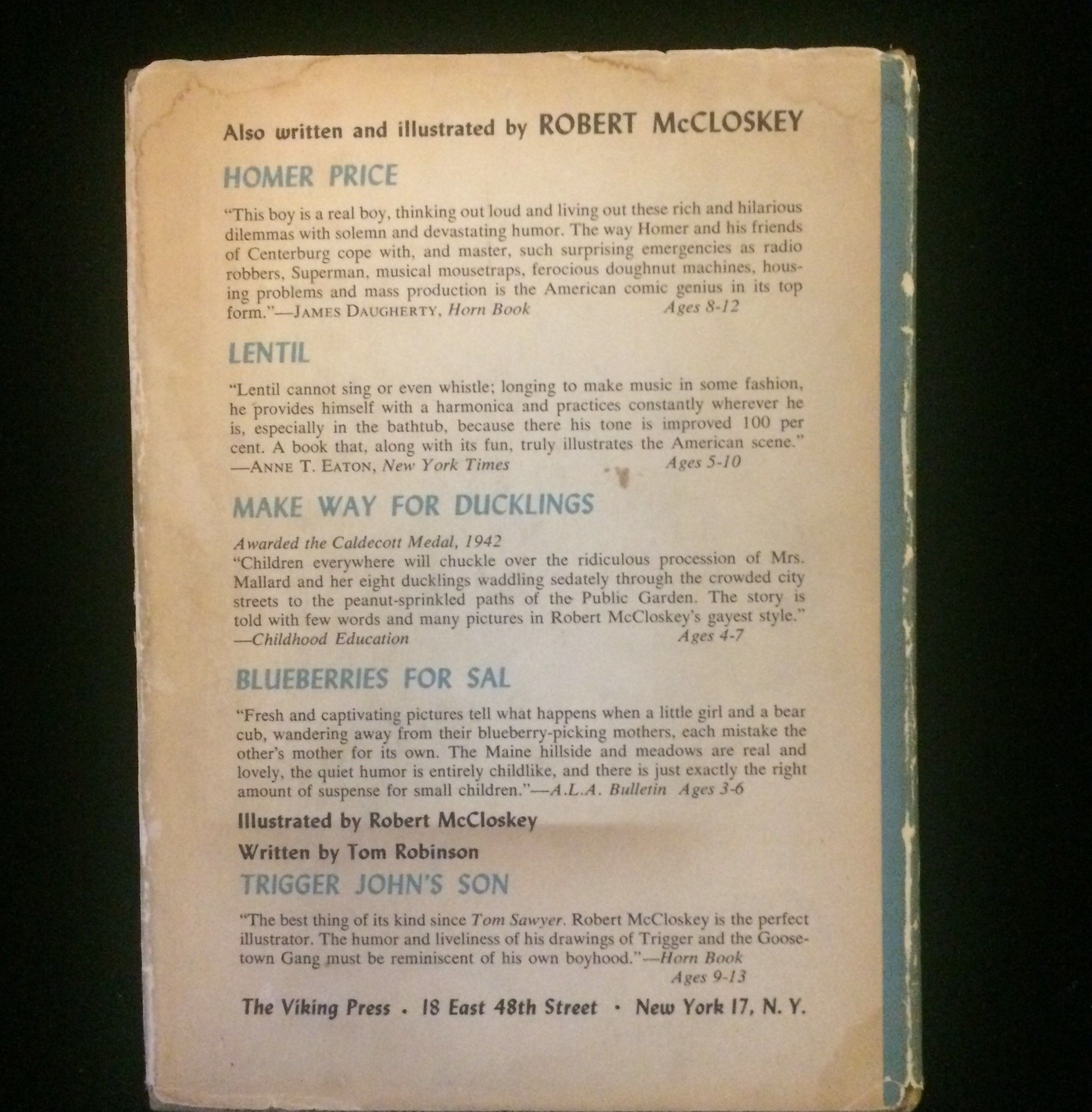 NY: Viking, 1951. 1st Edition. Hardcover. Very Good +/VG-. First edition of two-time Caldecott medalist McCloskey's fifth book that he both wrote and illustrated. Inscribed to another Caldecott medalist Marc Simont and his wife on the illustrated half-title: "For Marc and Bee from Bob" Solid book. Dustjacket toned (more so rear panel), folds worn, chipped with loss at spine ends. Signed McCloskey firsts are rare; inscribed to other Caldecott medalist rarer still.