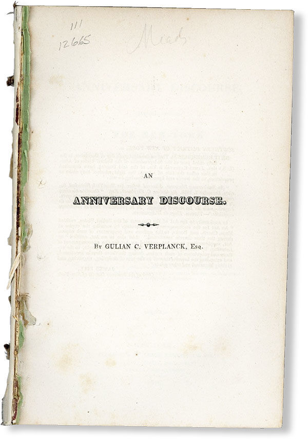 New-York: James Eastburn & Co, 1818. First Edition. Octavo (21cm.); removed but retaining half title; [2],121pp. Light spotting, else Very Good and fresh. Lengthy address delivered by a member of the DeWitt Clinton opposition, later elected to the New York Assembly in 1820. SABIN 99265; SHAW & SHOEMAKER 46648.