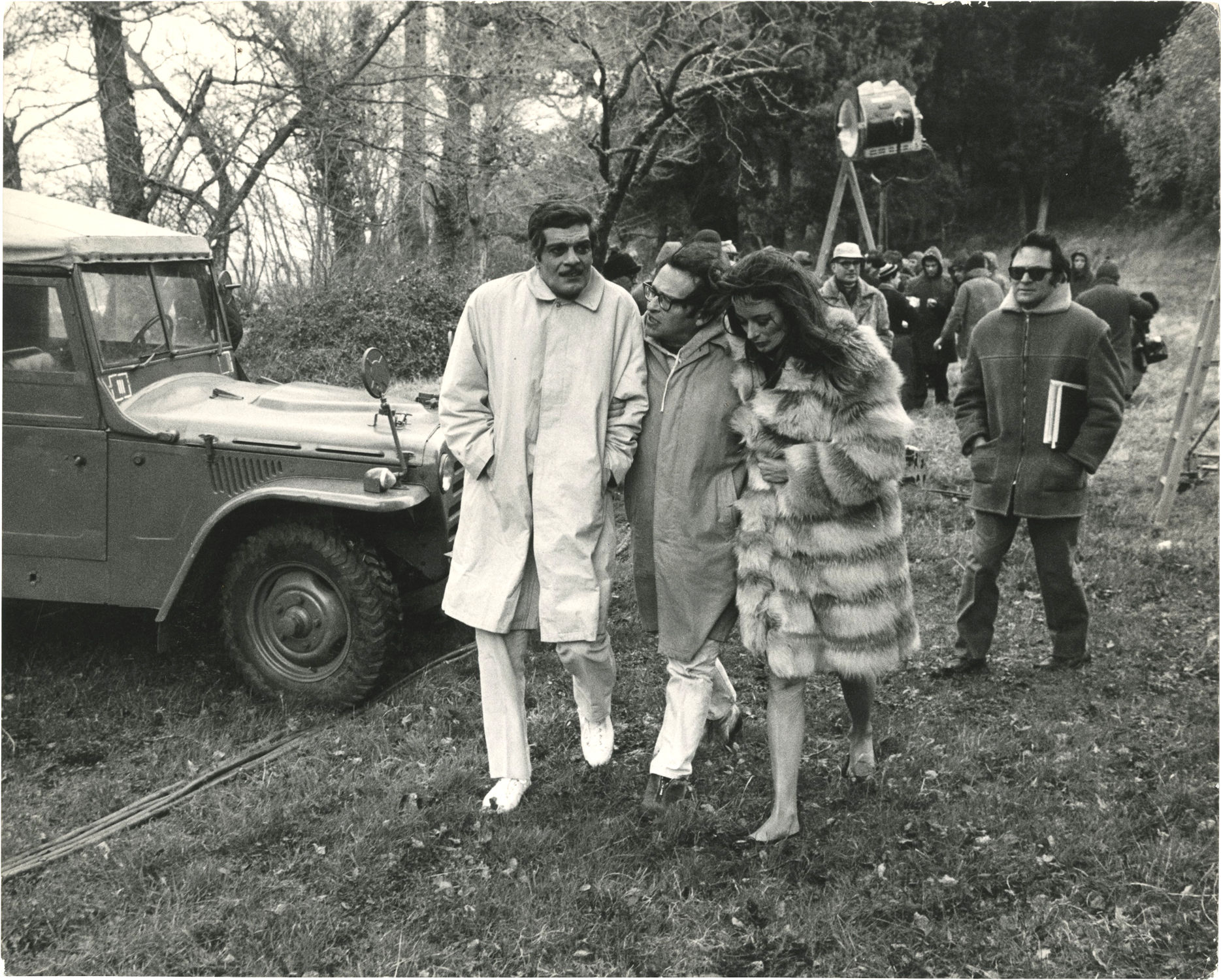 Beverly Hills, CA: Metro-Goldwyn-Mayer [MGM], 1969. Vintage oversize borderless reference photograph of Sidney Lumet, Anouk Aimee, and Omar Sharif taking a walk in between takes on the set of the 1969 film, with art director Piero Gherardi looking on in the background. With a mimeo snipe to the verso, along with the stamp of photographer Pierluigi Praturlon and manuscript annotations regarding layout.