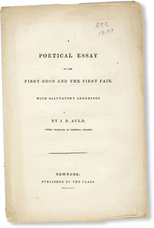 New-York: Published by the Class, 1835. First Edition. Octavo (22cm.); self-wrappers; 16pp. Some wear and dust-soil, else Very Good, internally sound. Address delivered by undergraduate Jedediah Auld at commencement of Columbia College (now University).