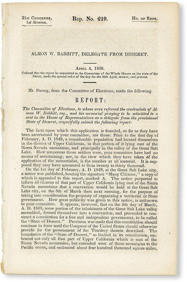 [Washington: Government Printing Office?], 1850. First Edition. Octavo (22.5cm.); removed; 16pp. Light wear, else Very Good to Near Fine. At head of title: "31st Congress, 1st Session, Rep. No. 219." Report submitted regarding "the credentials of Almon W. Babbitt, esq., and his memorial praying to be admitted to a seat in the House of Representatives." The text opens with a description of the provisional General Assembly of the State of Deseret at which Babbitt was elected to travel to Washington petitioning statehood, which instead led to the creation of the Territory of Utah. Scholarship describes Babbitt as one of the earliest members of the Church of Latter Day Saints following its establishment, though his activities in Washington reveal political ambition above the interests of the Church, creating false partisan issues and stoking animosity towards President Zachary Taylor in the few months prior to his demise in office (see Bruce Worthen, "The Political Intrigues of Almon Babbitt," "Utah Historical Quarterly," Vol. 83, no. 2, Spring, 2015, pp. 84-97). FLAKE 9115.