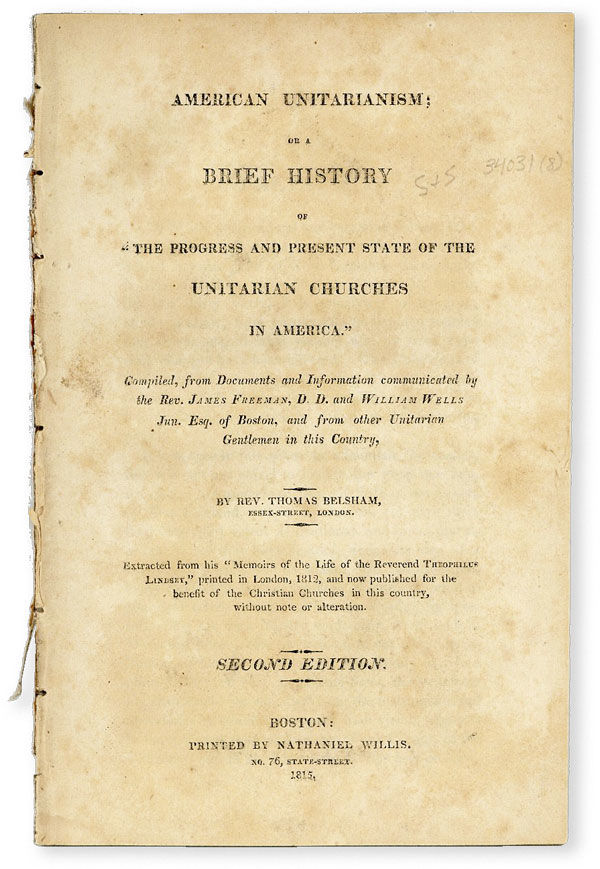 Boston: Nathaniel Willis, 1815. Second Edition. Octavo (21cm.); removed; 48pp. Foxing throughout, long shallow crease along fore-edge of title page (serving as upper cover), else Very Good and sound. "Compiled from Documents and Information communicated by the Rev. James Freeman, D.D. and William Wells Jun. Esq. of Boston, and from the Unitarian Gentlemen in this Country" (title page), extracted from Belsham's "Memoirs of the Life of the Reverend Theophilus Lindsey," first published in London, 1812. SABIN 4596; SHAW & SHOEMAKER 34031.