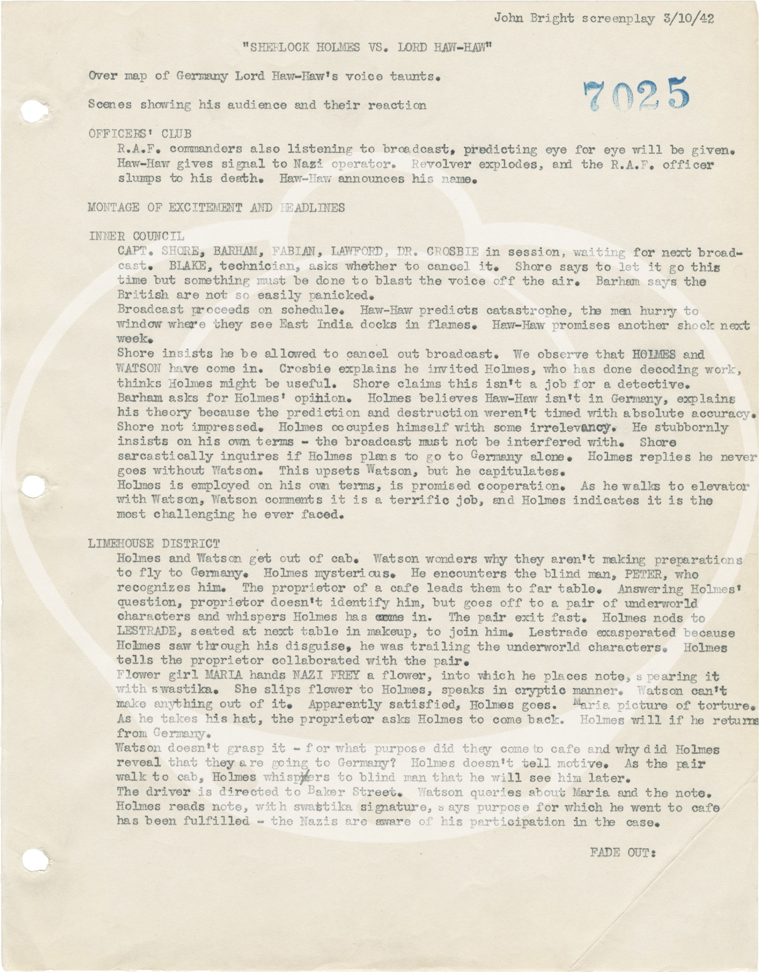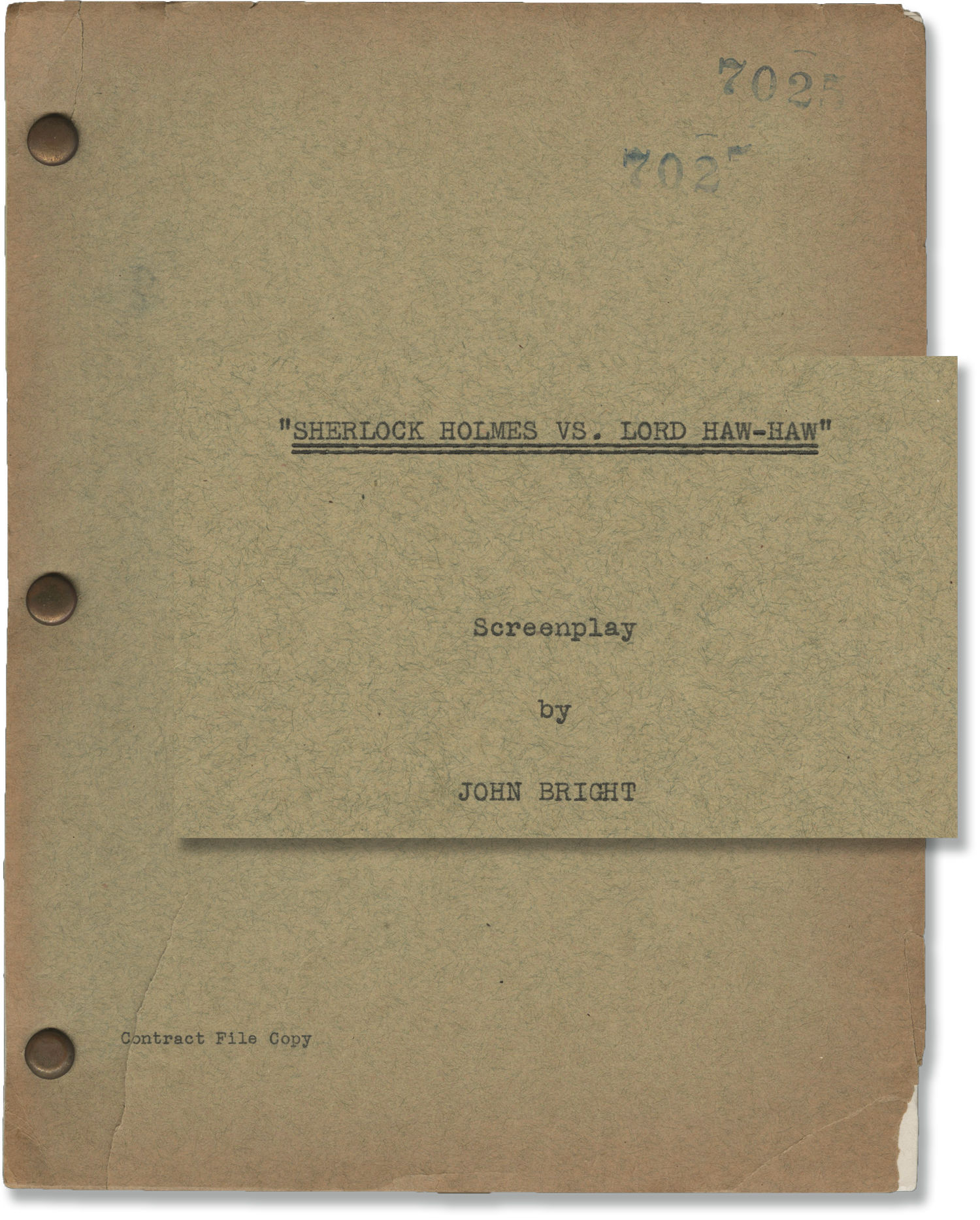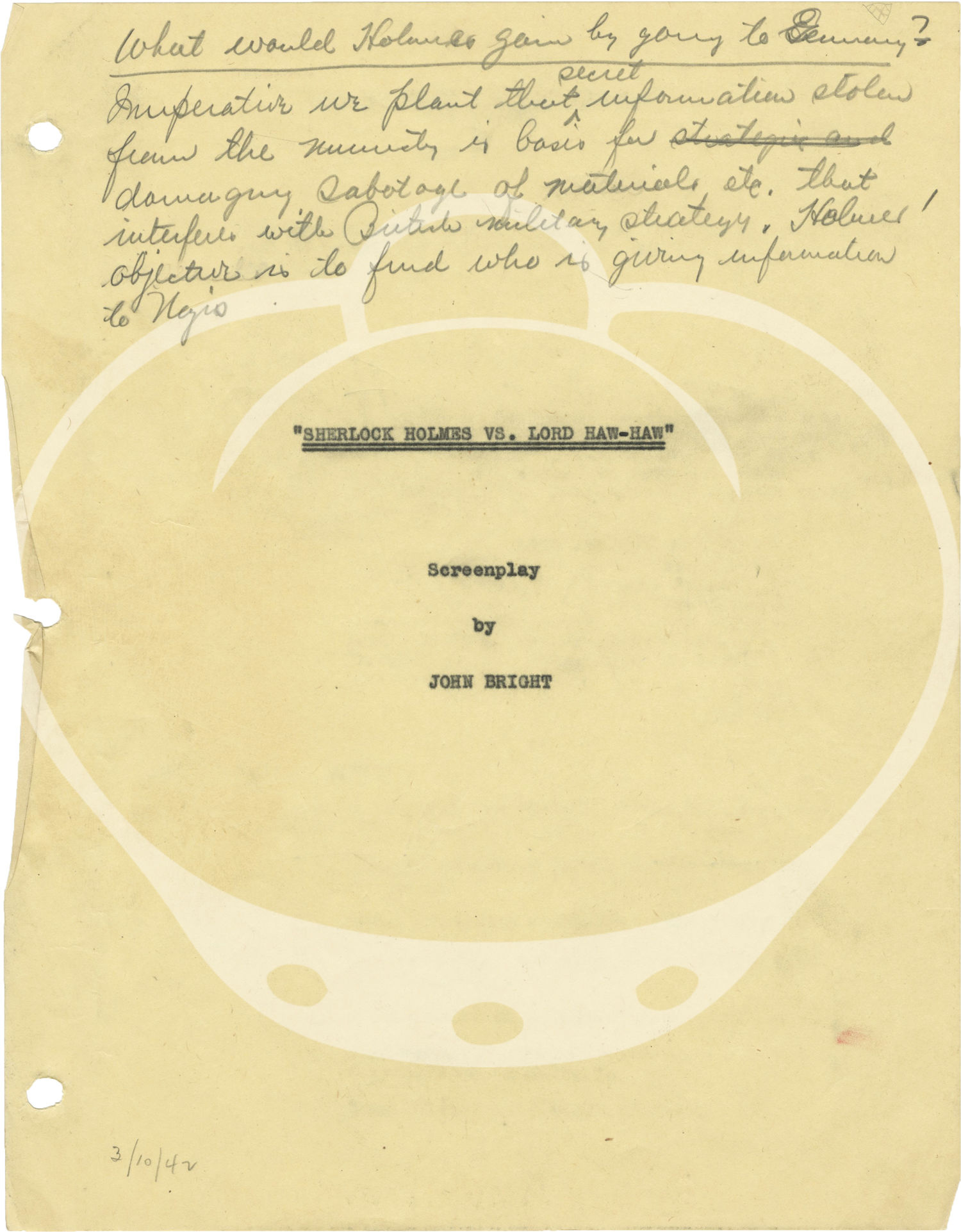 First, an early Draft script, under the working title "Sherlock Holmes vs. Lord Haw-Haw," by screenwriter John Bright, noted as "Contract File Copy" on front wrapper. Carbon typescript, preceded by a four page ribbon copy typescript outline, dated 3/10/42. Annotation of inquiry into necessary story elements and plotline on title page, in manuscript pencil. Several annotations throughout, of Bright's name, page numbers, strikes, question mark, and dates (ranging from 3/10/42 to 3/27/42), in manuscript pencil and ink.